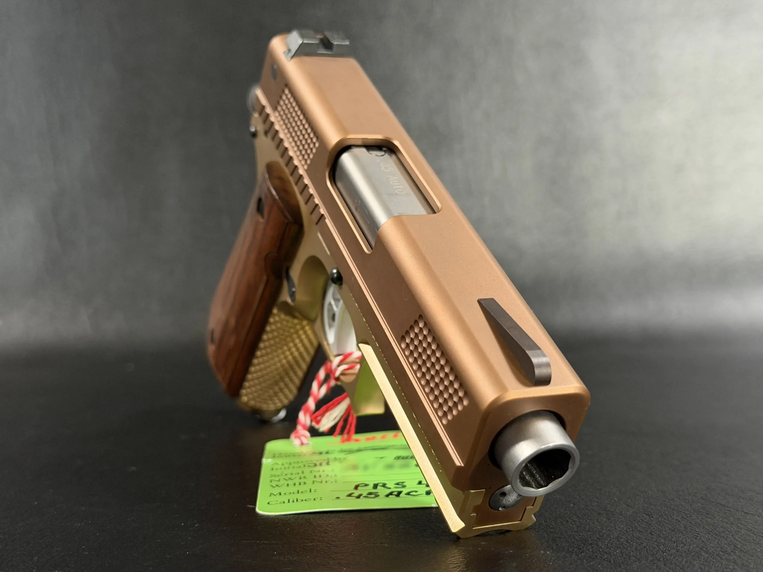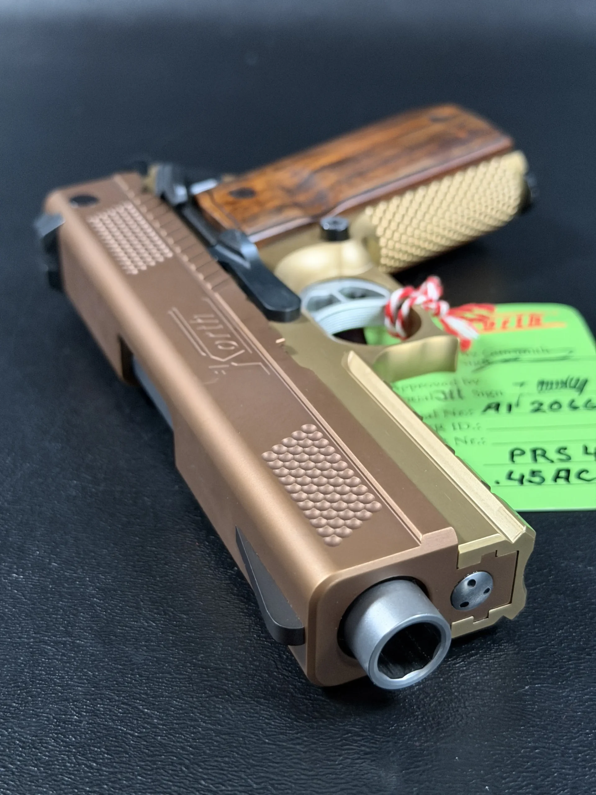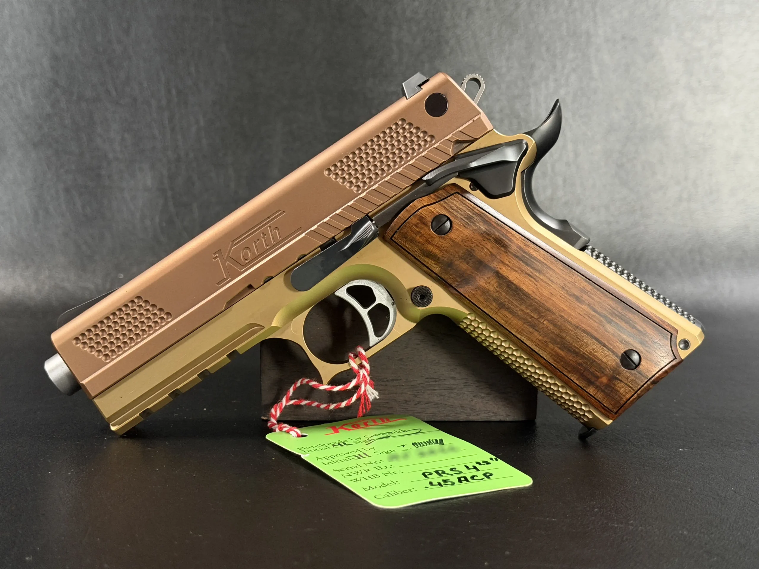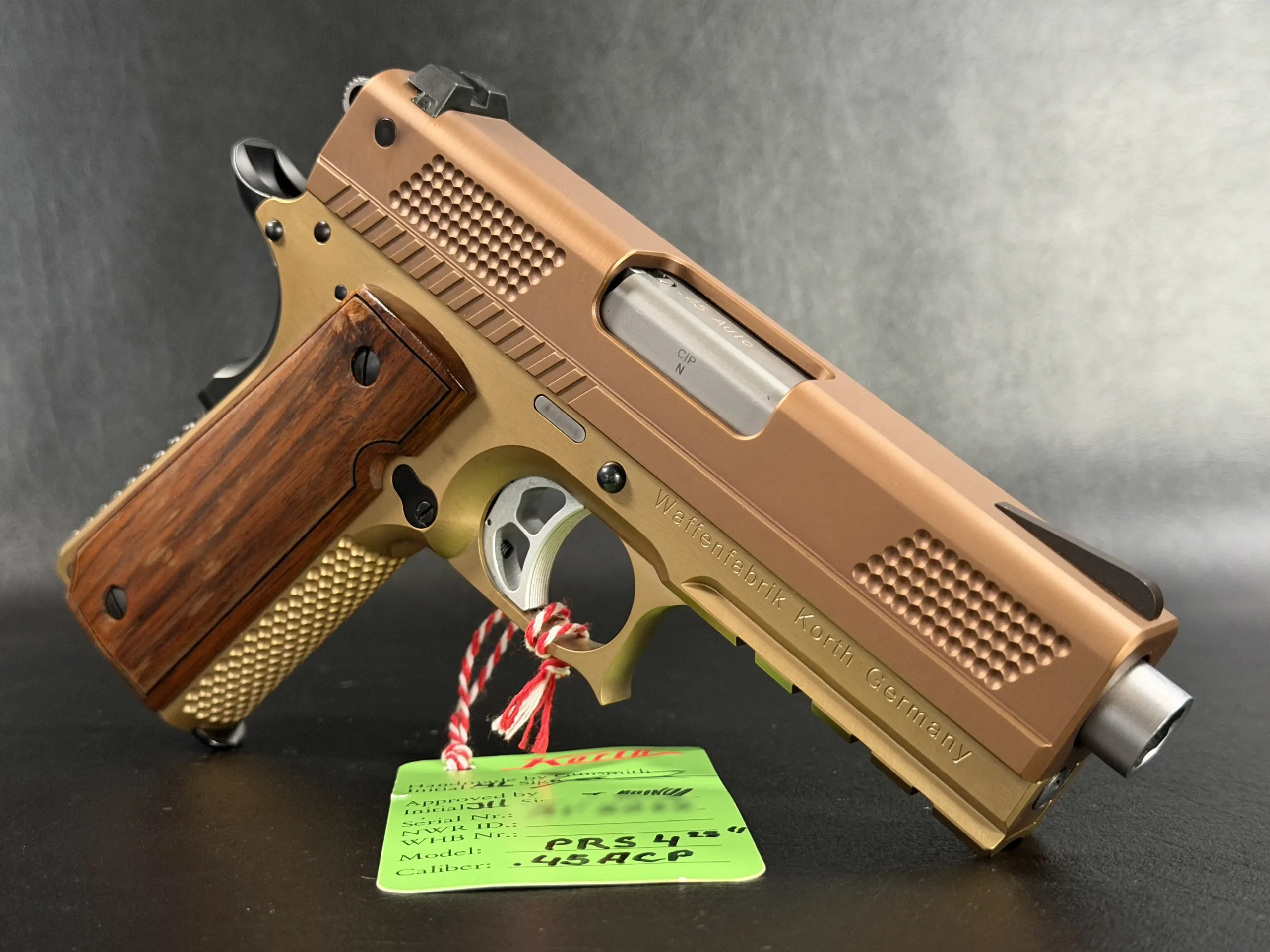 The 4.25-inch configuration gives this PRS a compact, purposeful profile, while the two-tone finish sets it apart immediately. The warm brown slide contrasts beautifully against the gold-toned frame, creating a layered look that feels both modern and unmistakably European. Under light, the finishes shift subtly, revealing the depth and texture of Korth’s surface work rather than a flat, uniform coat.