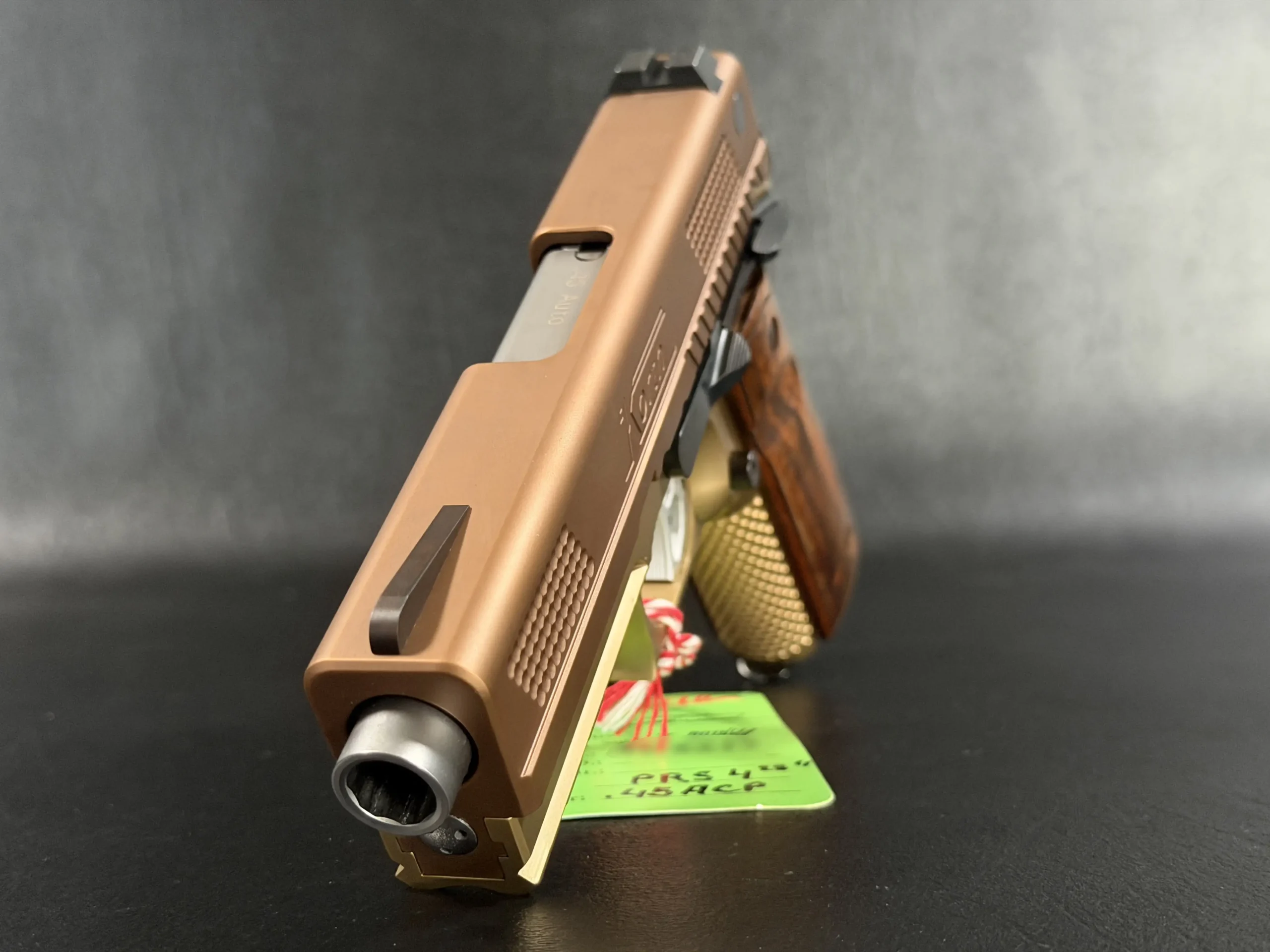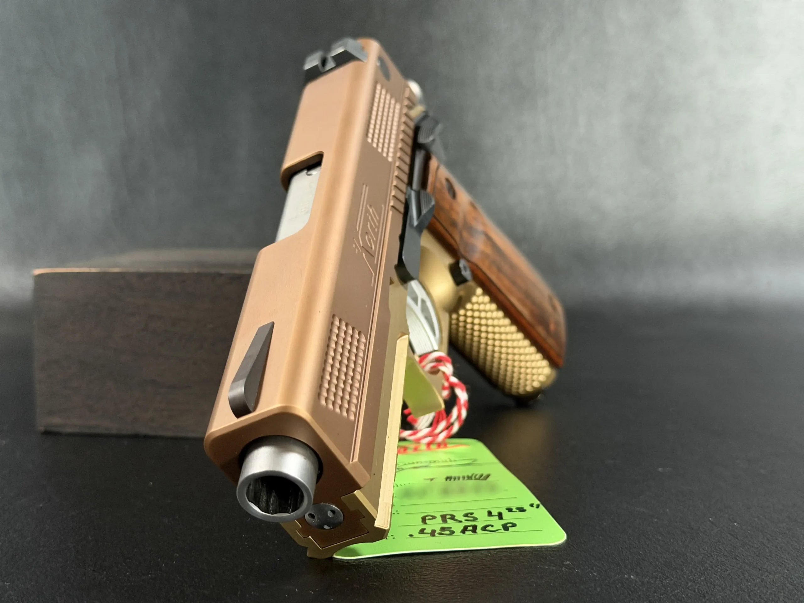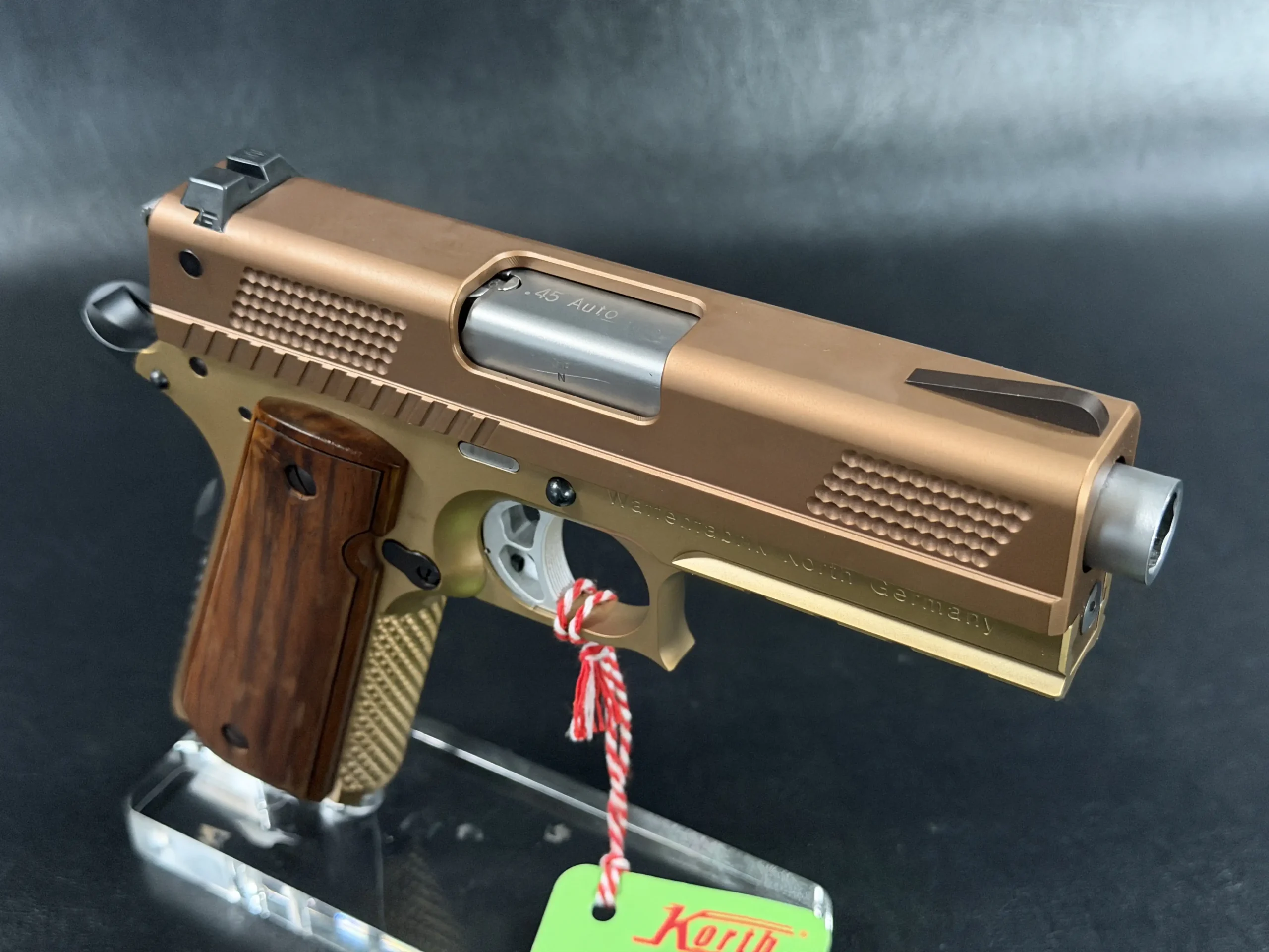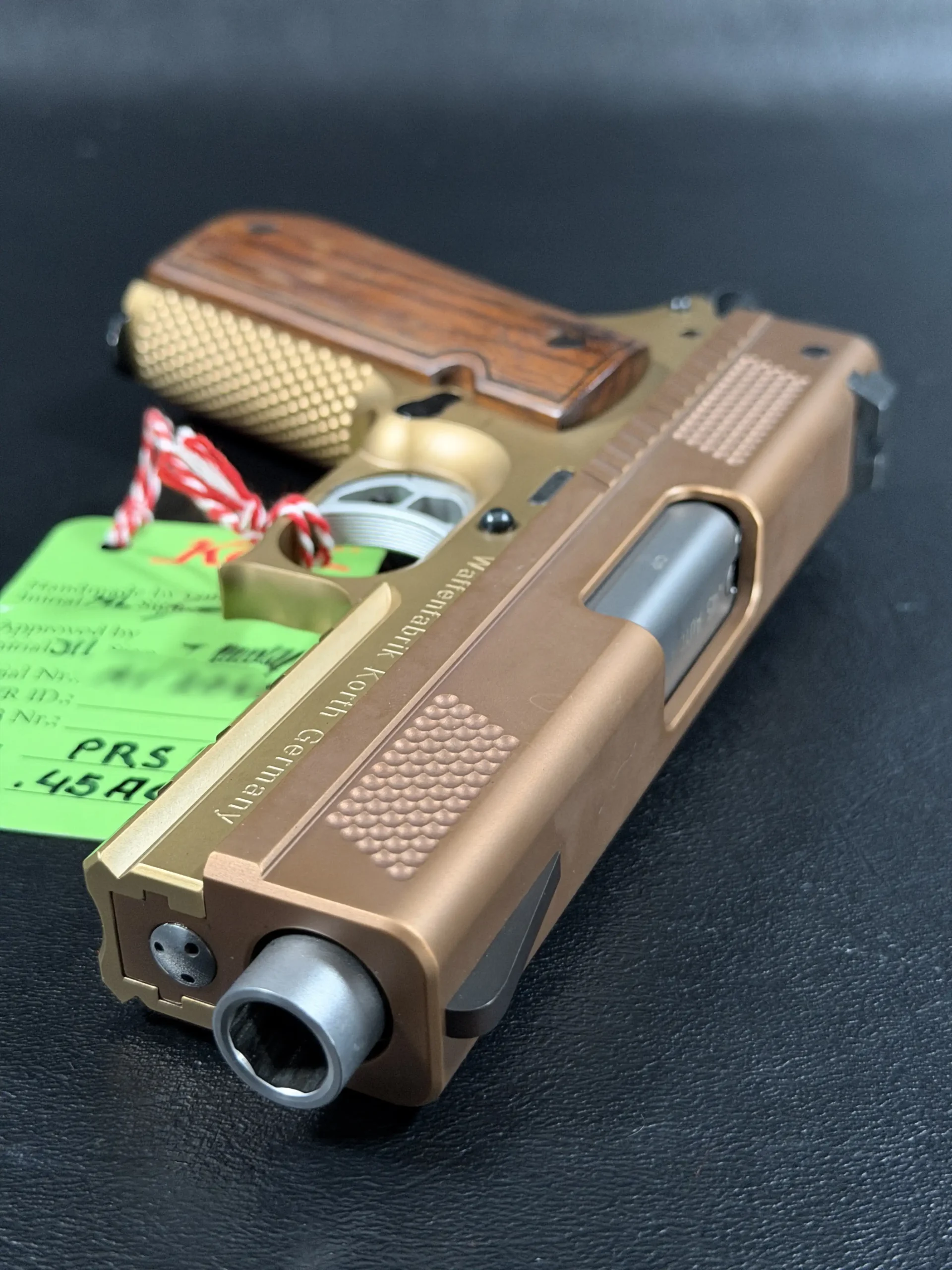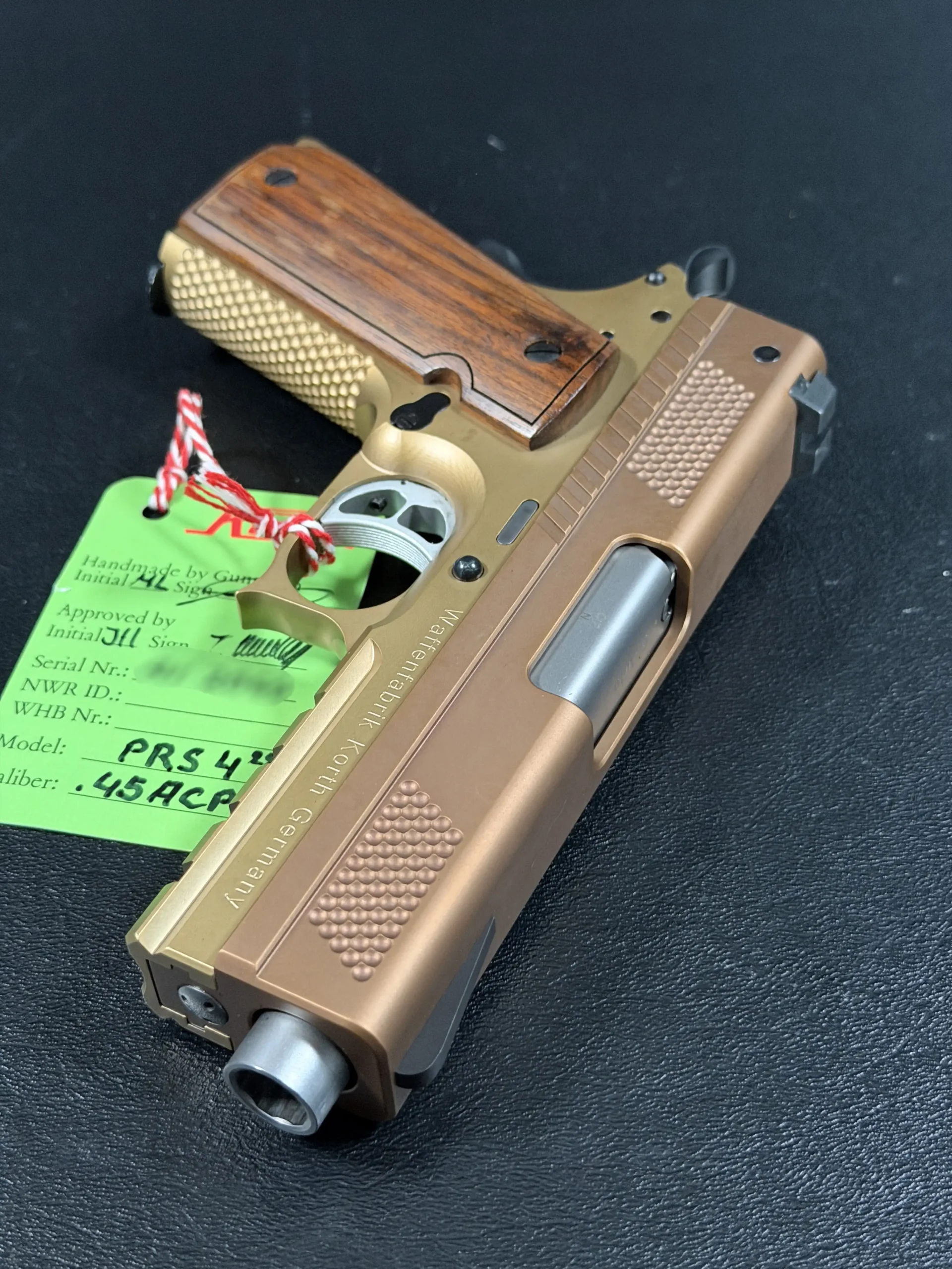 The 4.25-inch configuration gives this PRS a compact, purposeful profile, while the two-tone finish sets it apart immediately. The warm brown slide contrasts beautifully against the gold-toned frame, creating a layered look that feels both modern and unmistakably European. Under light, the finishes shift subtly, revealing the depth and texture of Korth’s surface work rather than a flat, uniform coat.