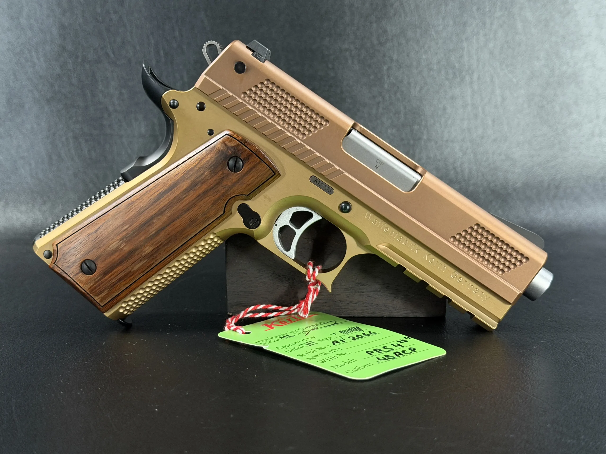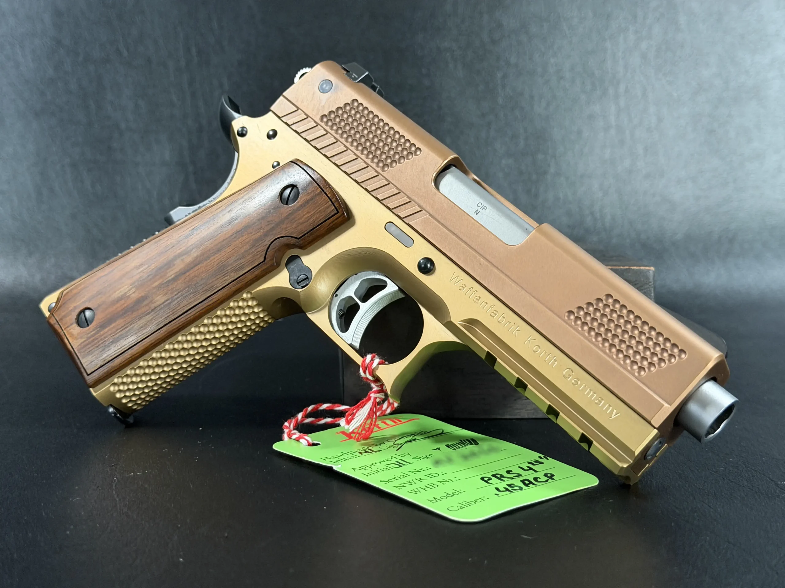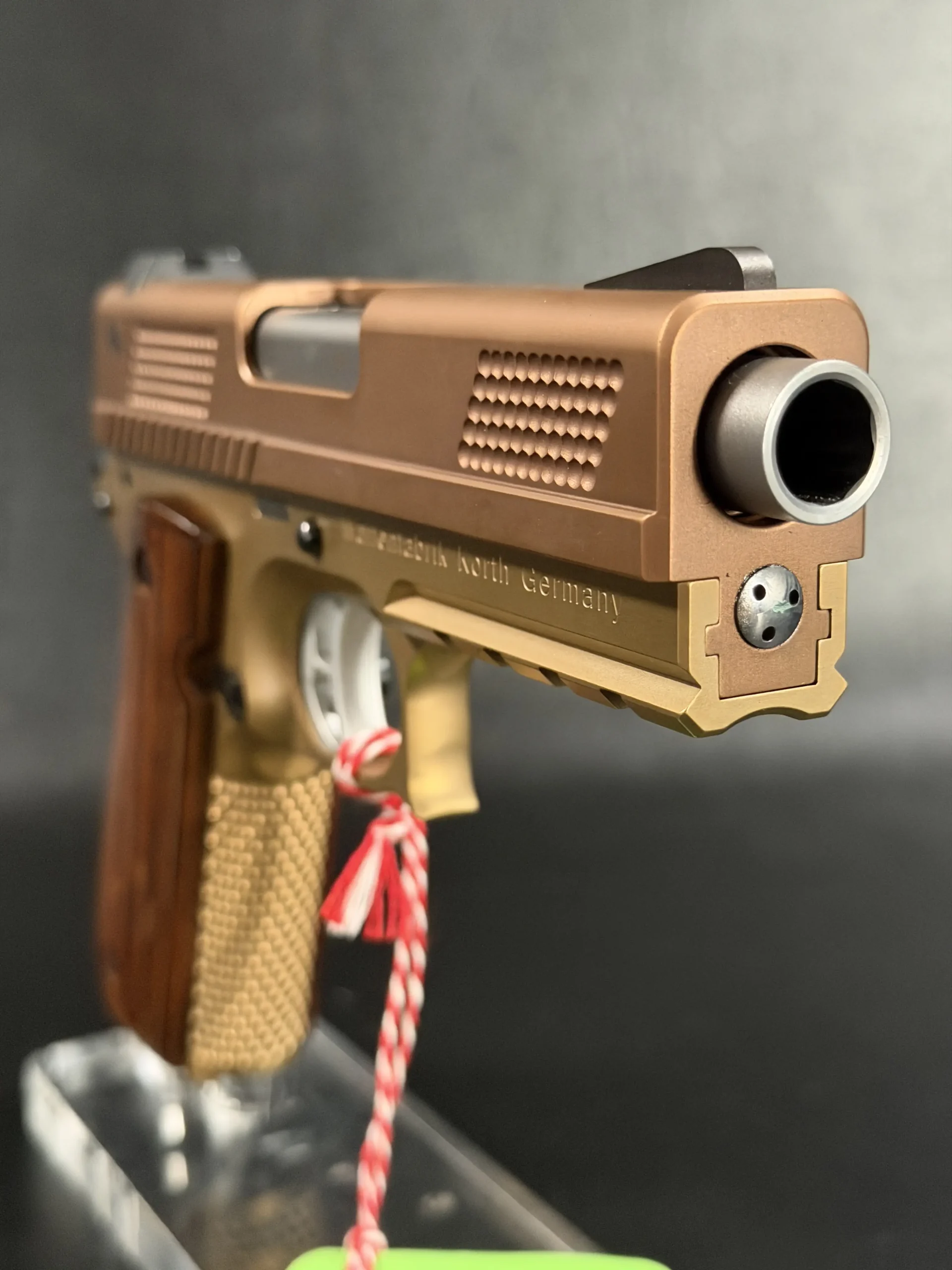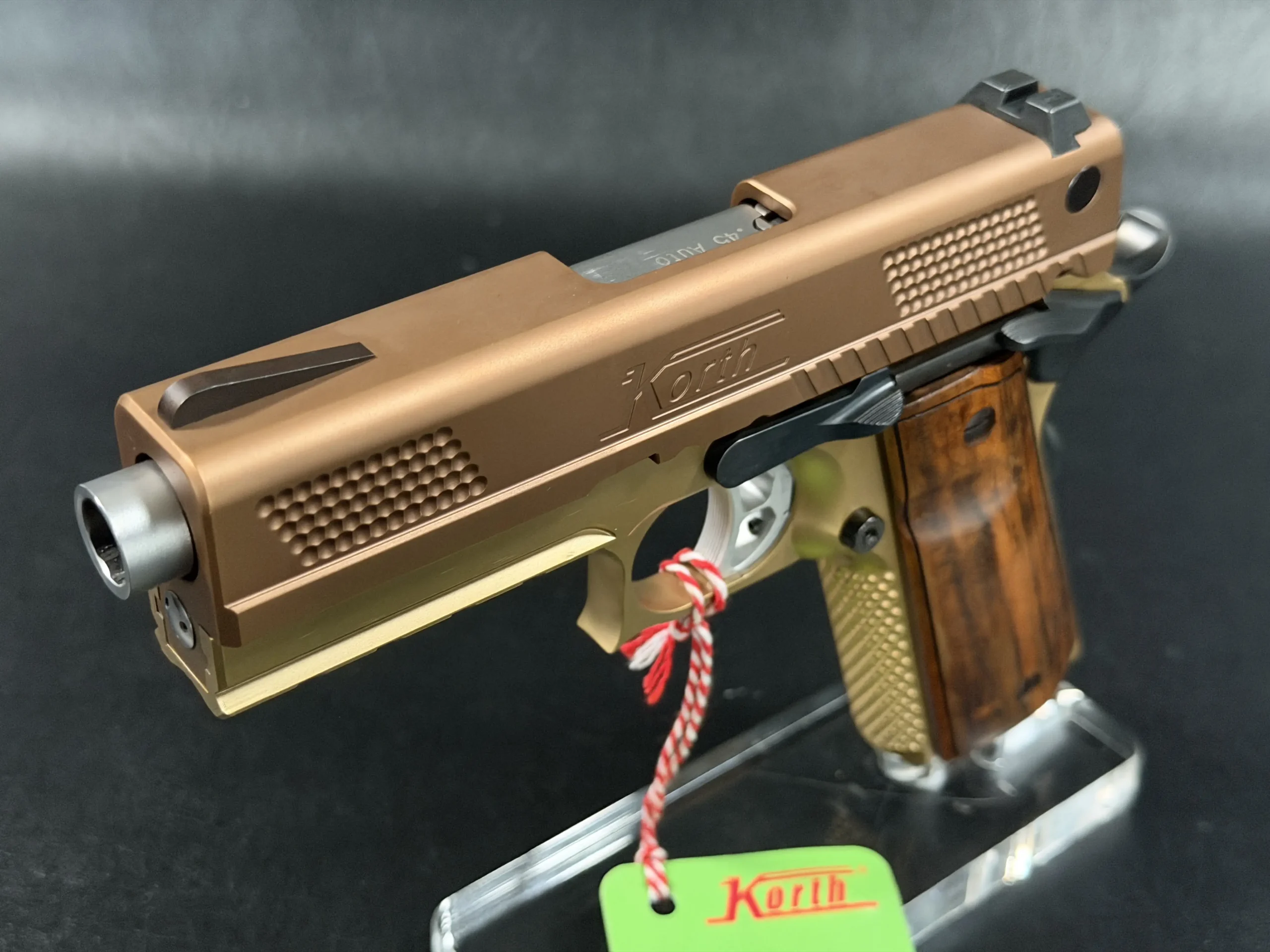 The 4.25-inch configuration gives this PRS a compact, purposeful profile, while the two-tone finish sets it apart immediately. The warm brown slide contrasts beautifully against the gold-toned frame, creating a layered look that feels both modern and unmistakably European. Under light, the finishes shift subtly, revealing the depth and texture of Korth’s surface work rather than a flat, uniform coat.