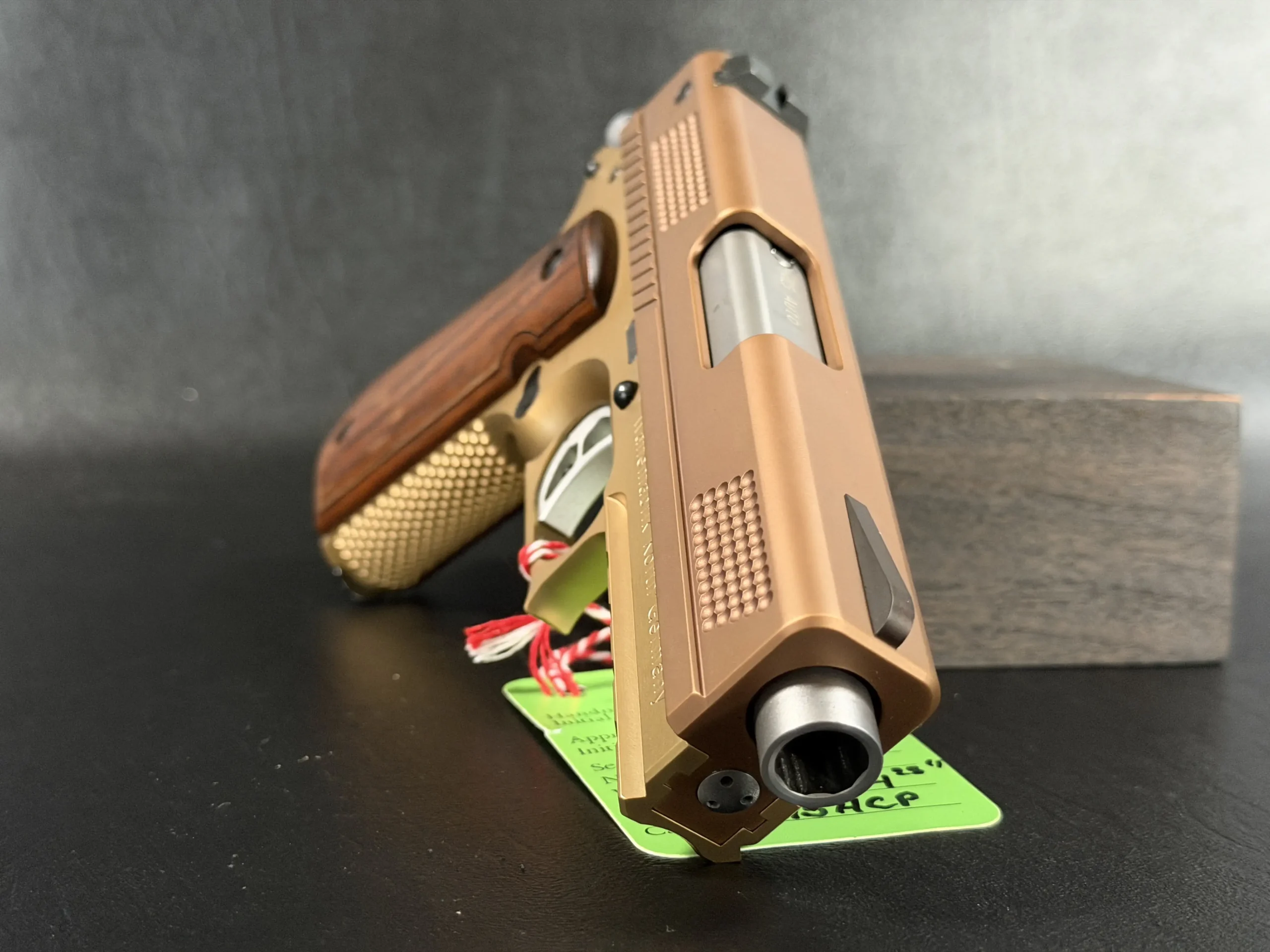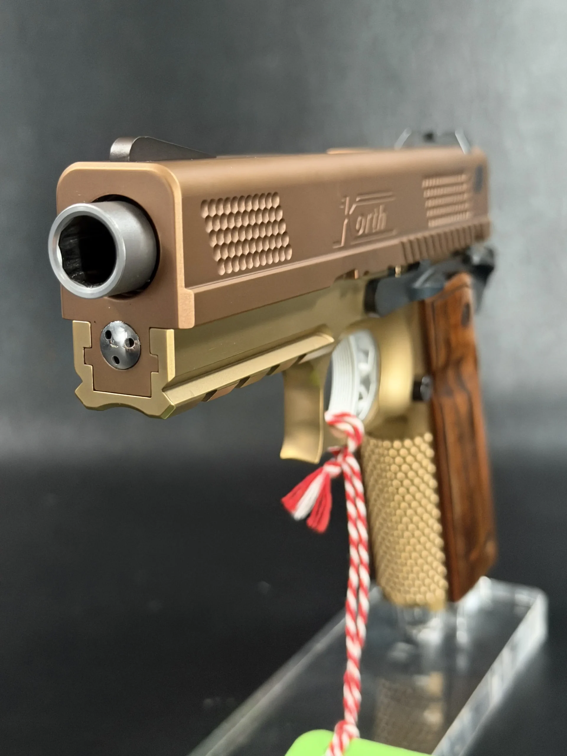 The wood grips add warmth and character, grounding the metalwork with natural contrast. Their tone complements the brown slide perfectly, tying the entire piece together into a cohesive whole. This isn’t a collection of parts, it’s a composition.