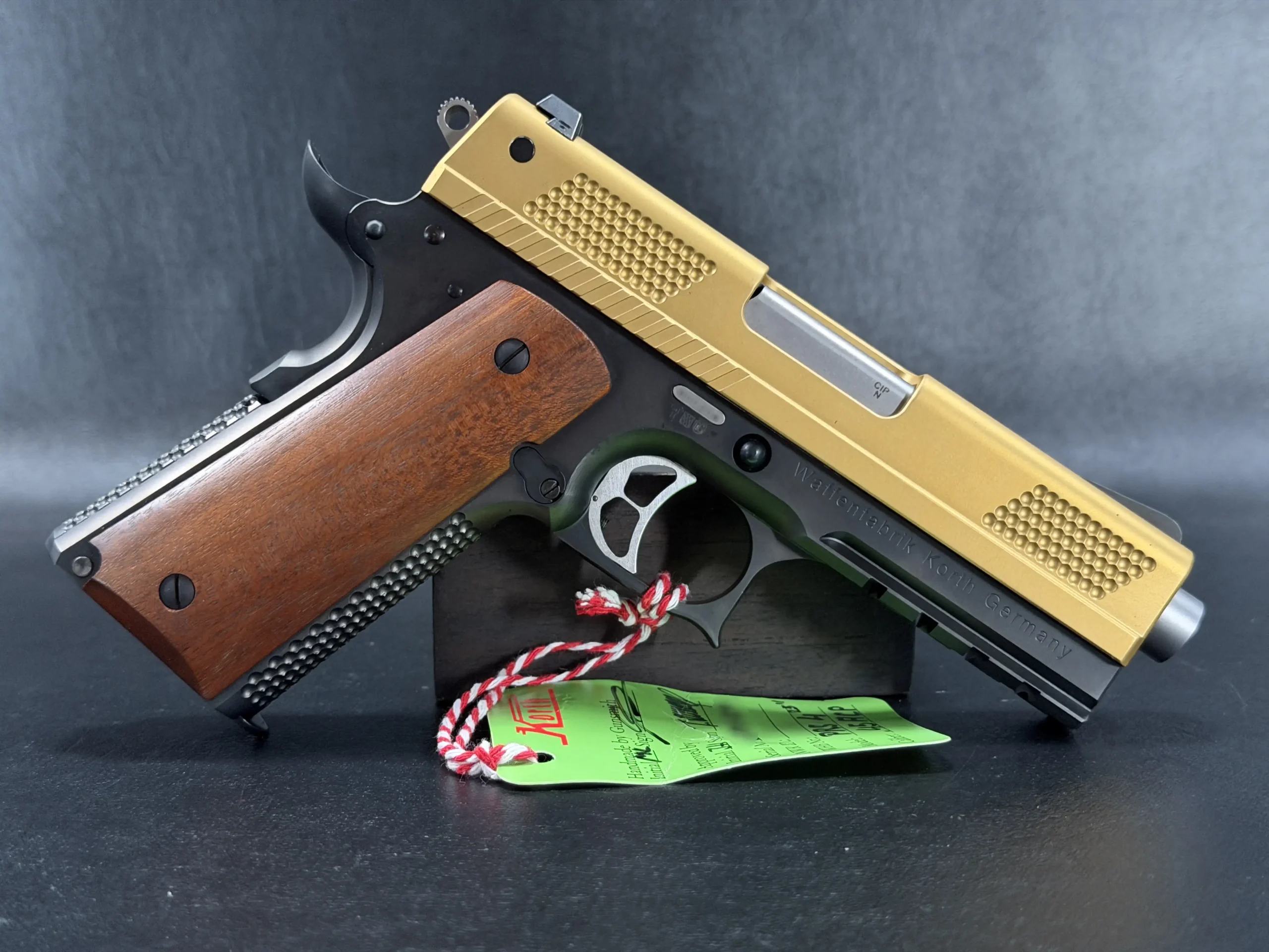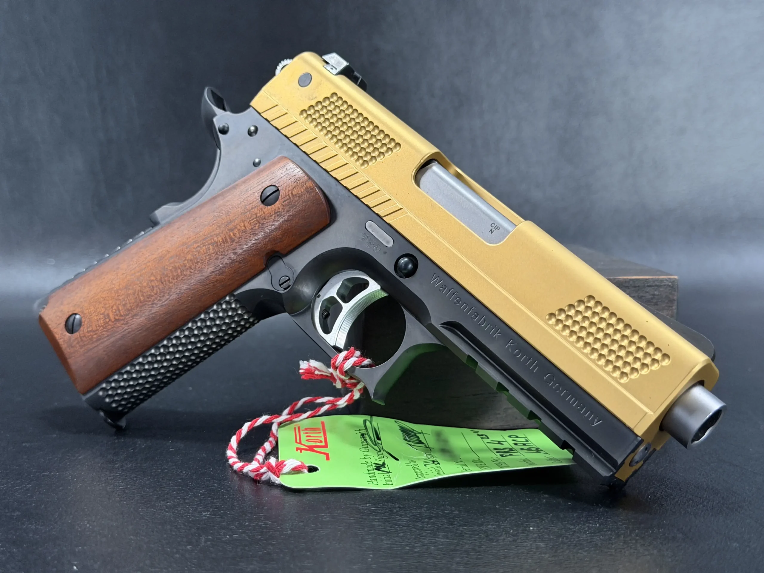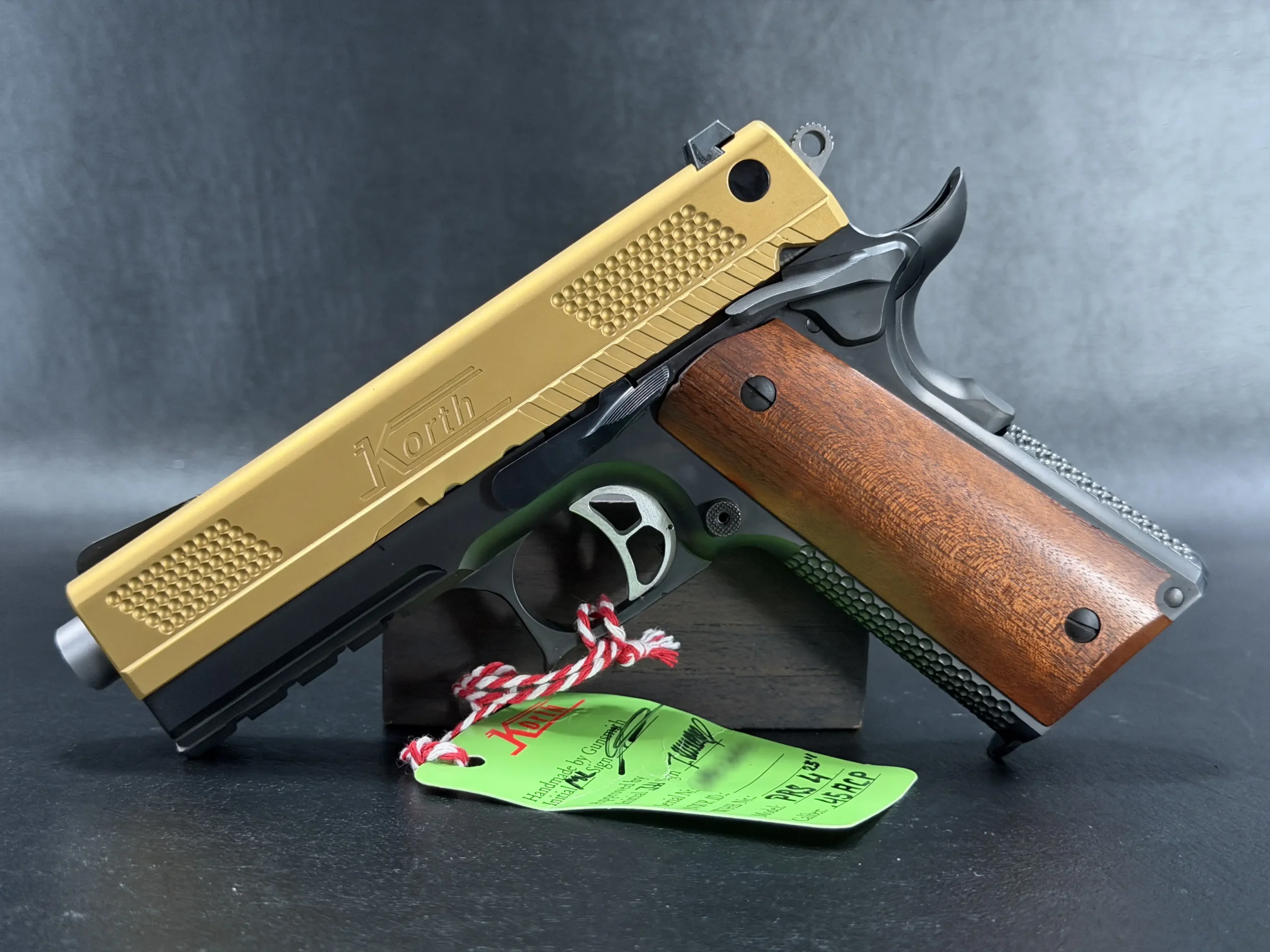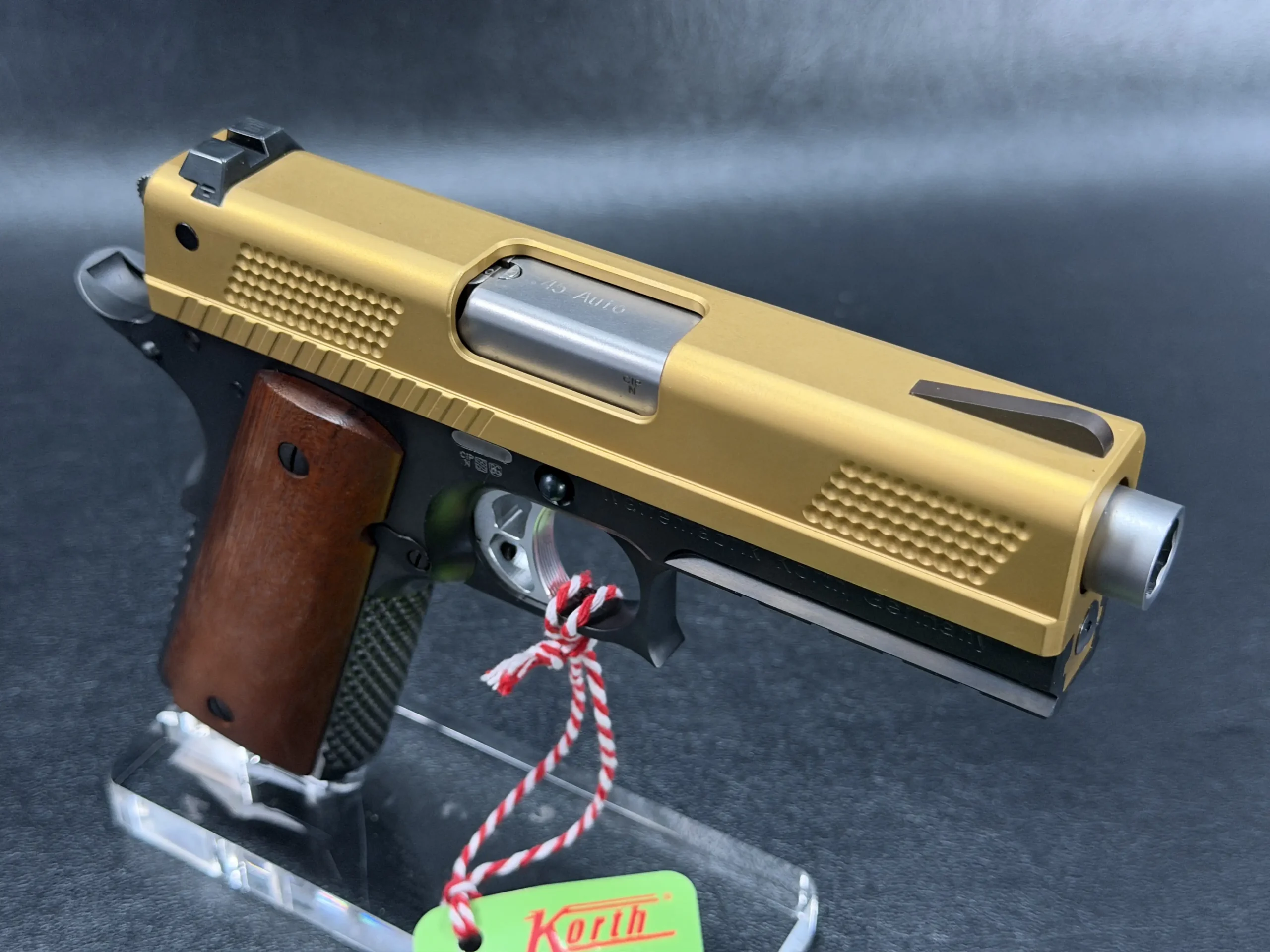 The 4.25-inch PRS platform strikes a deliberate balance, compact enough to feel purposeful, yet substantial enough to showcase Korth’s obsessive machining and finish work. The gold-tone slide immediately draws the eye, its precision-cut texturing catching light from every angle, while the contrasting black frame anchors the pistol with a sense of restraint and mechanical seriousness. Together, the finishes feel intentional rather than ornamental, bold, but disciplined.