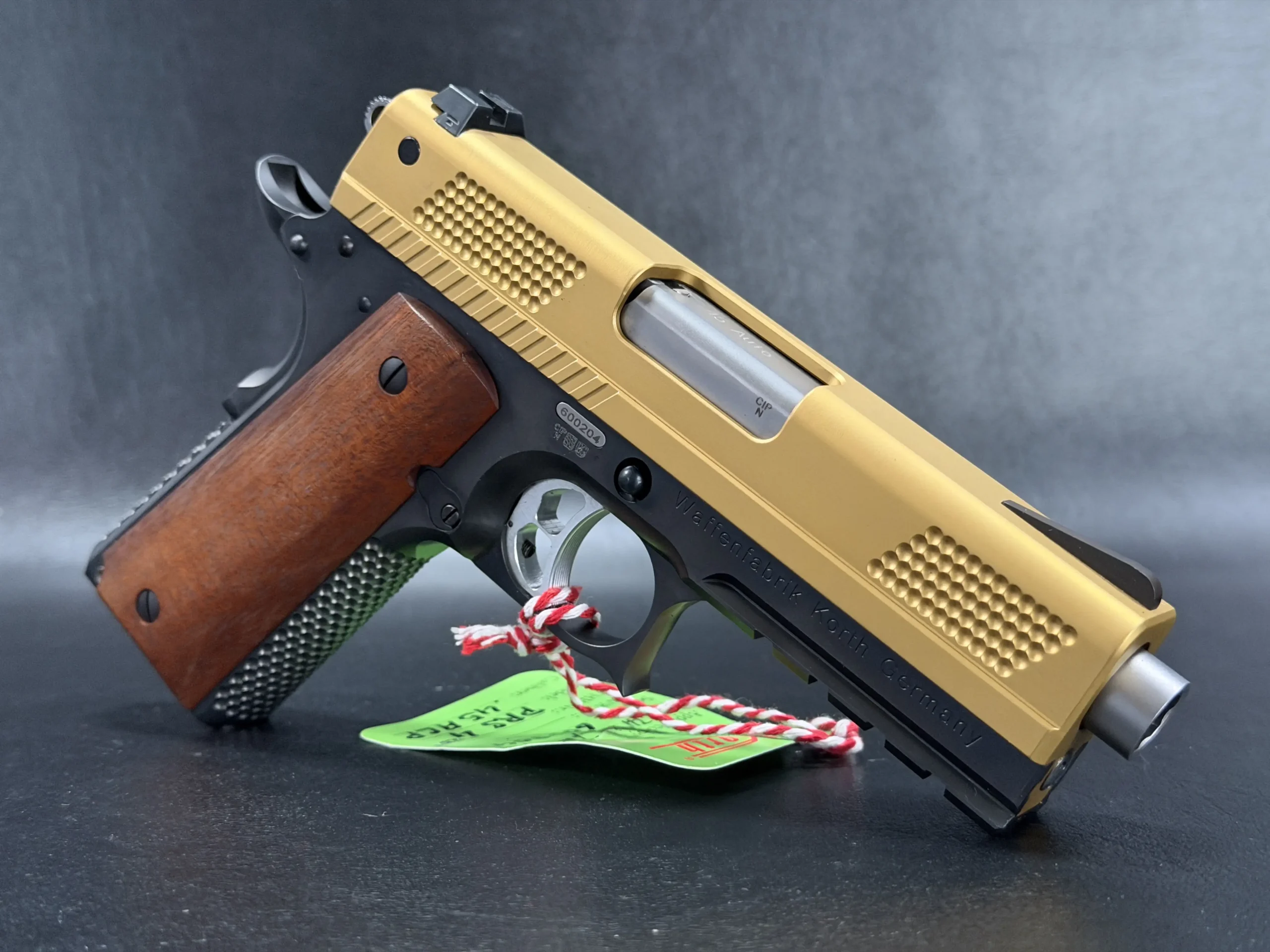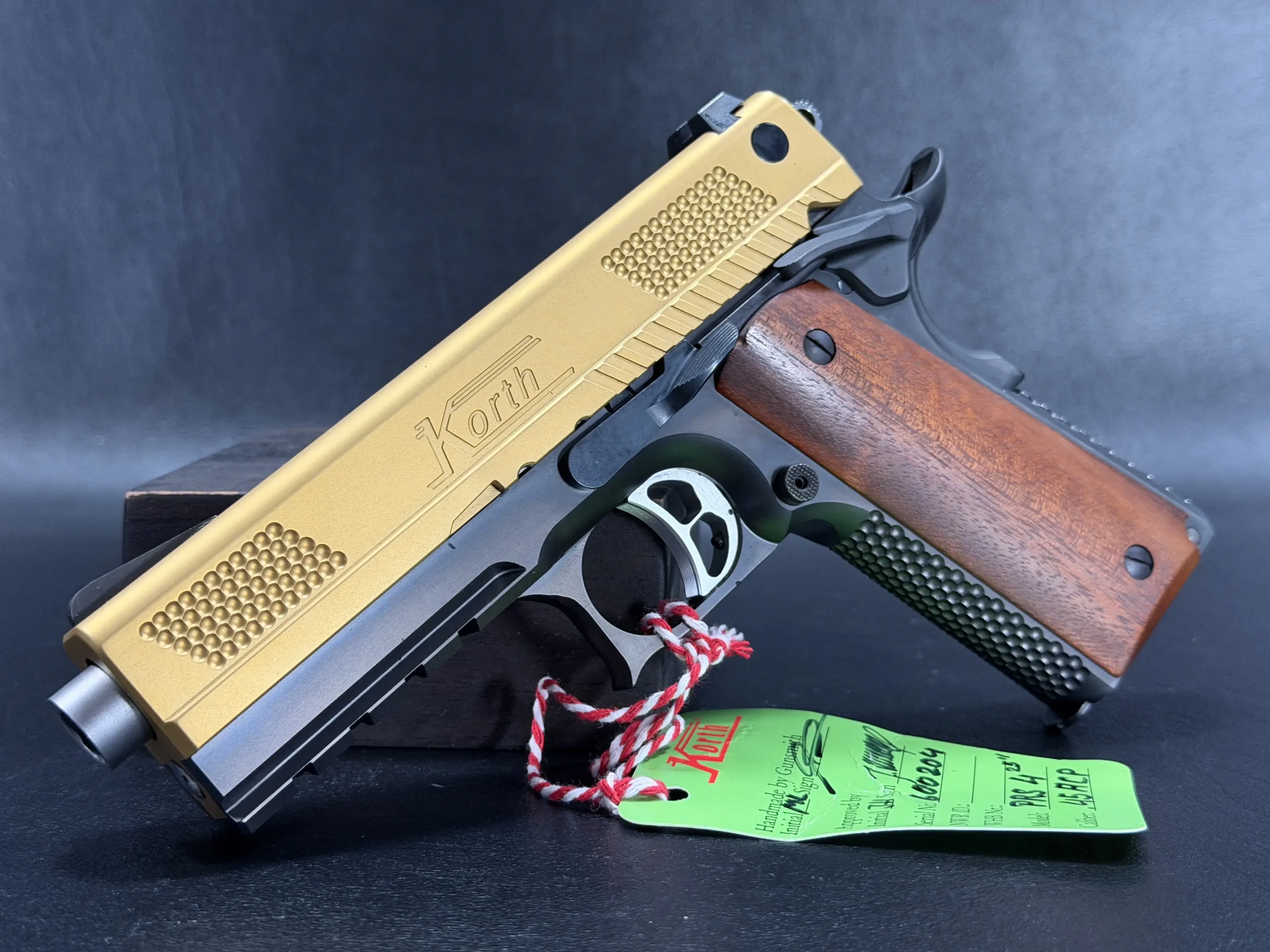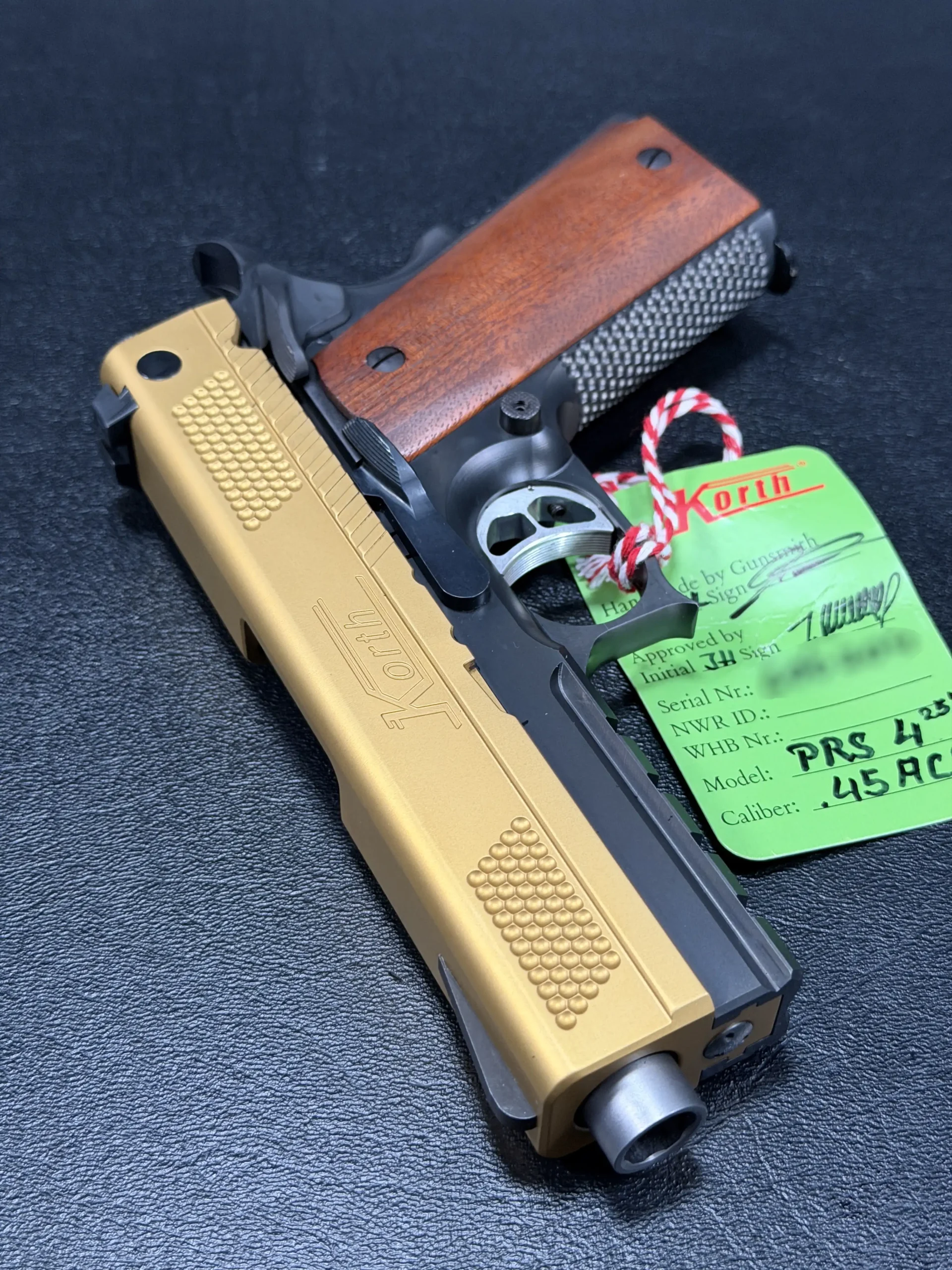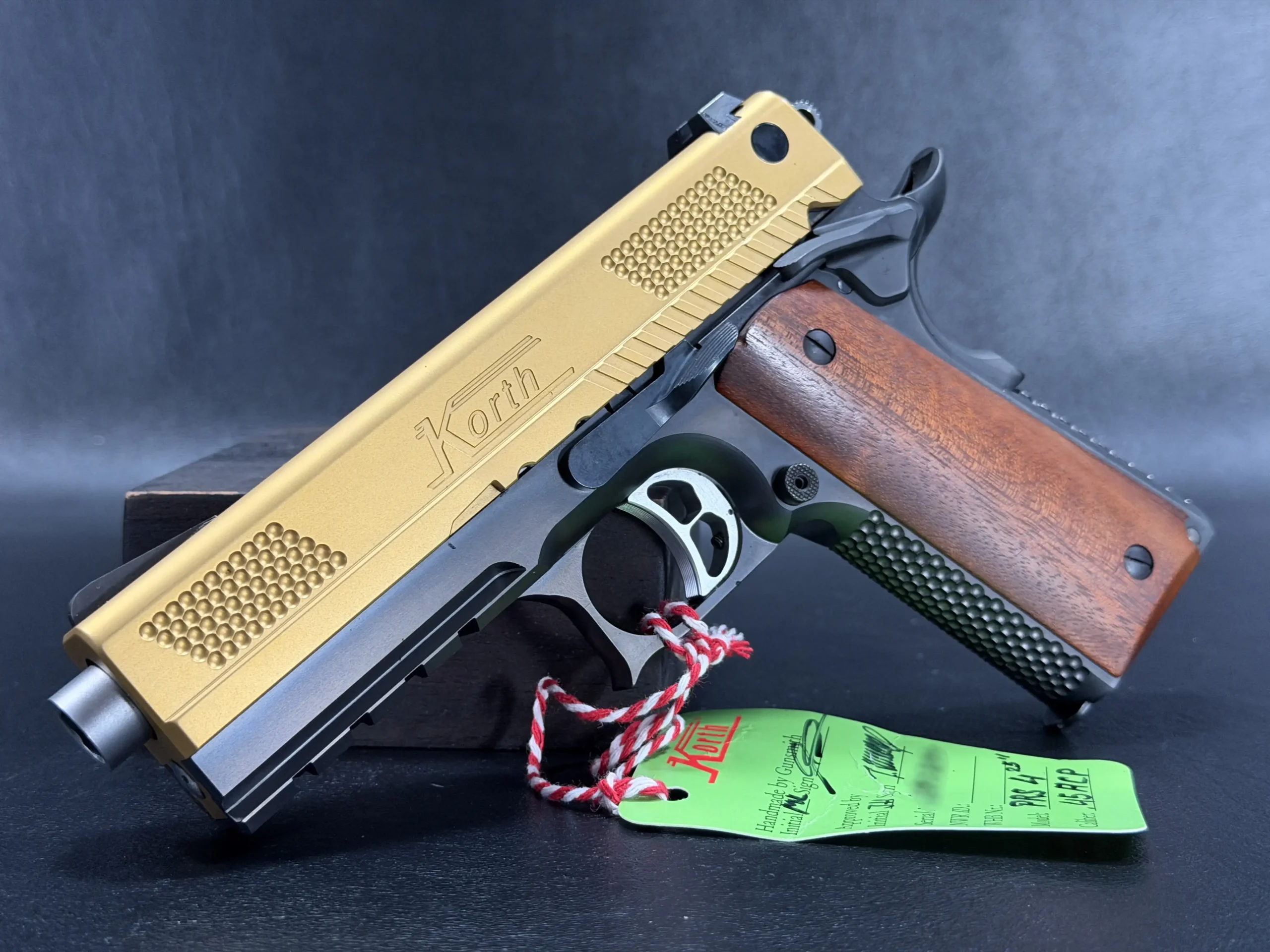 The 4.25-inch PRS platform strikes a deliberate balance, compact enough to feel purposeful, yet substantial enough to showcase Korth’s obsessive machining and finish work. The gold-tone slide immediately draws the eye, its precision-cut texturing catching light from every angle, while the contrasting black frame anchors the pistol with a sense of restraint and mechanical seriousness. Together, the finishes feel intentional rather than ornamental, bold, but disciplined.