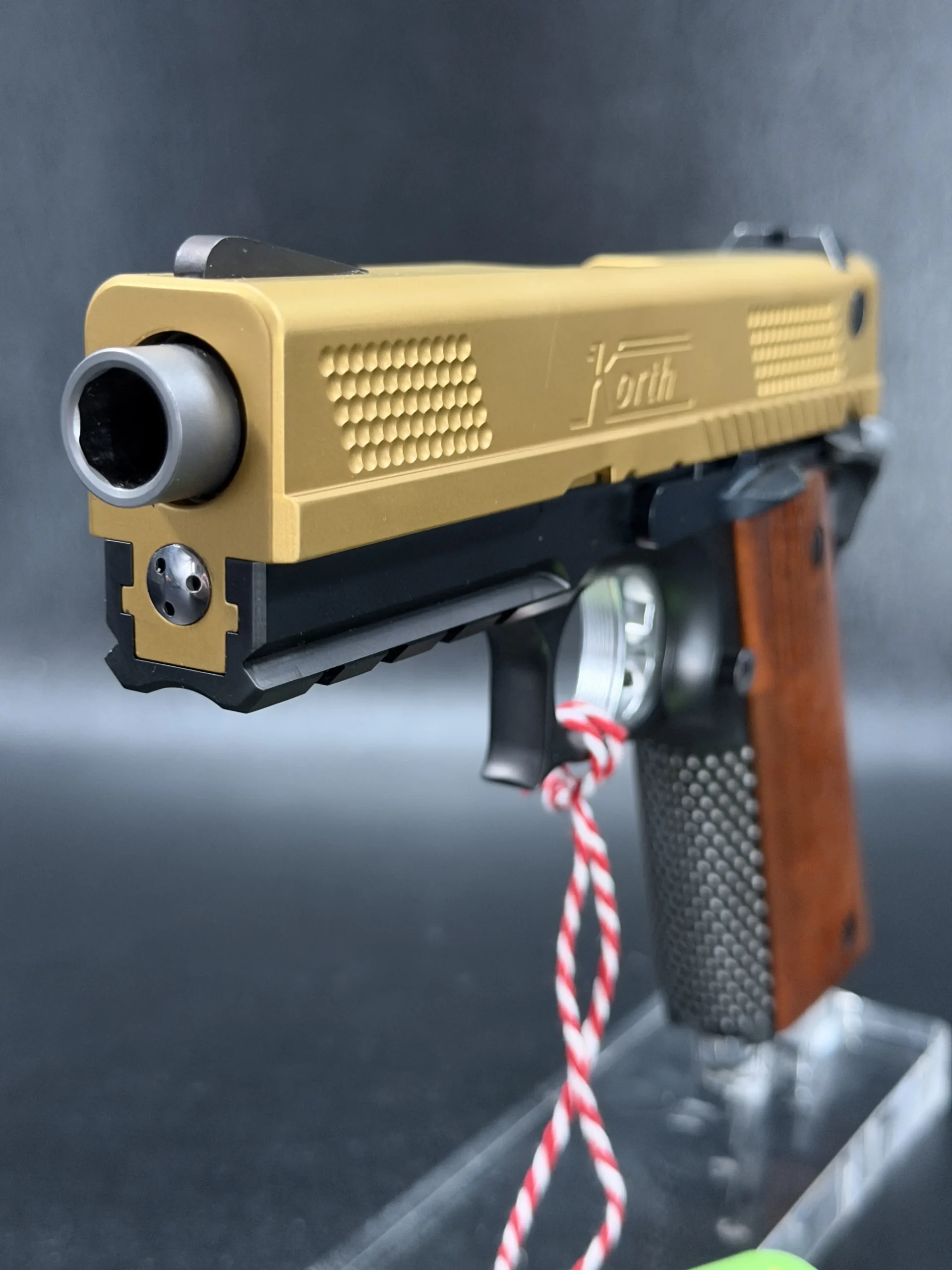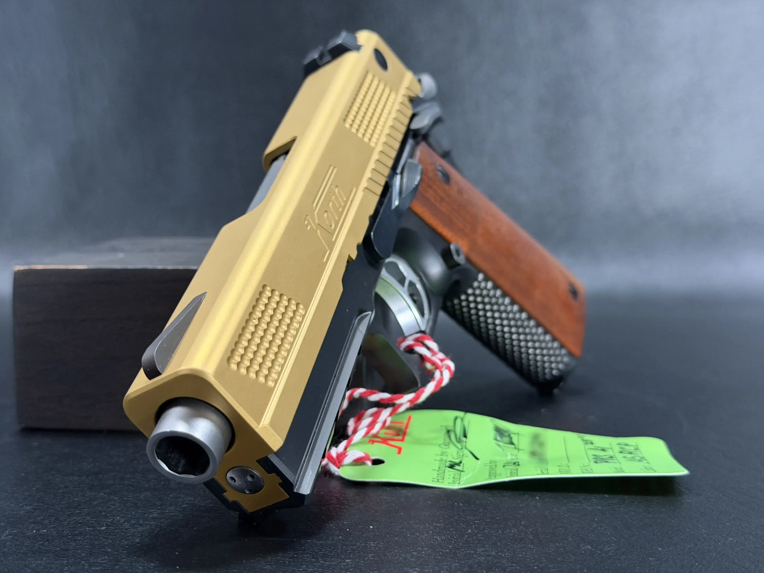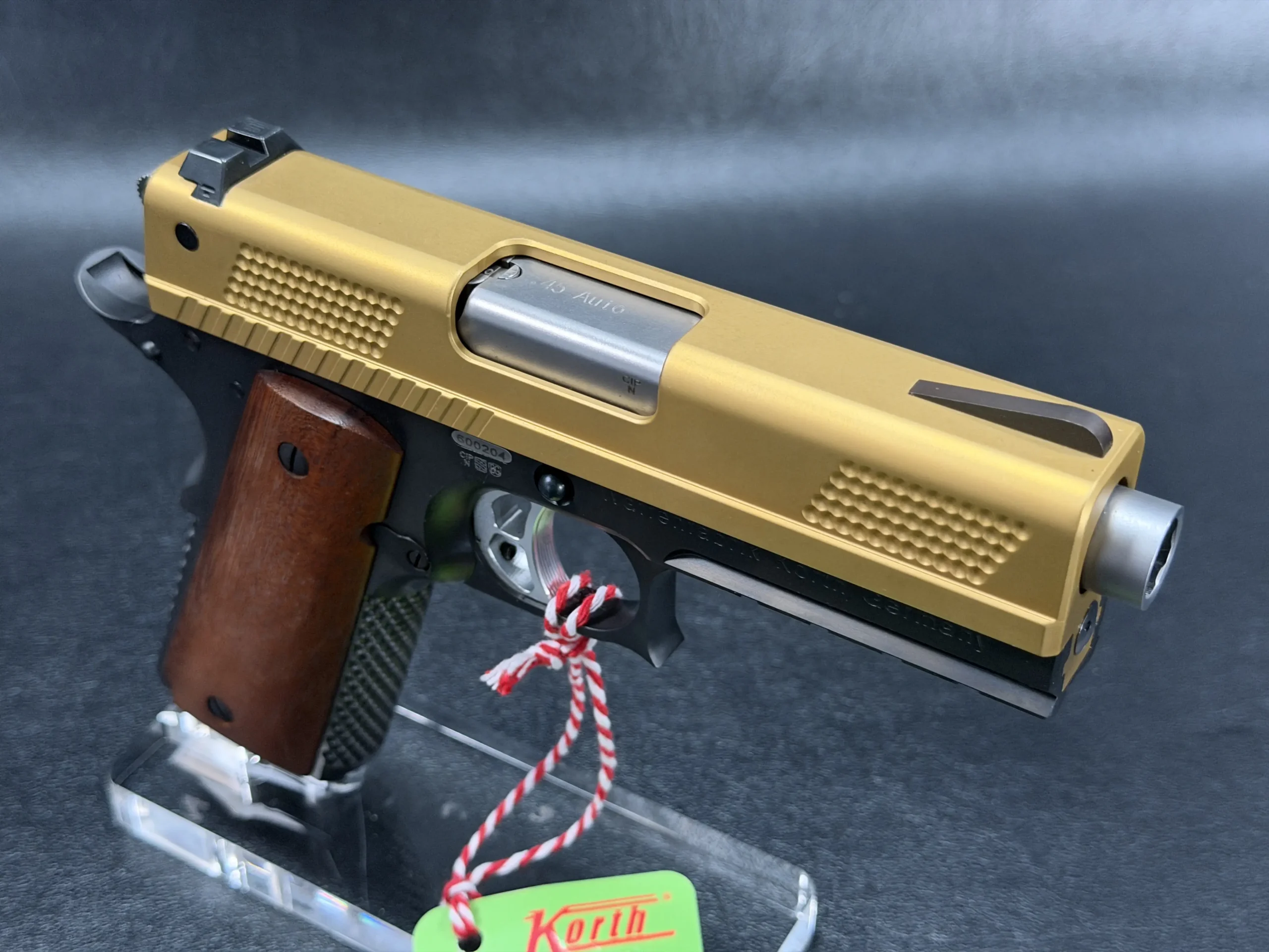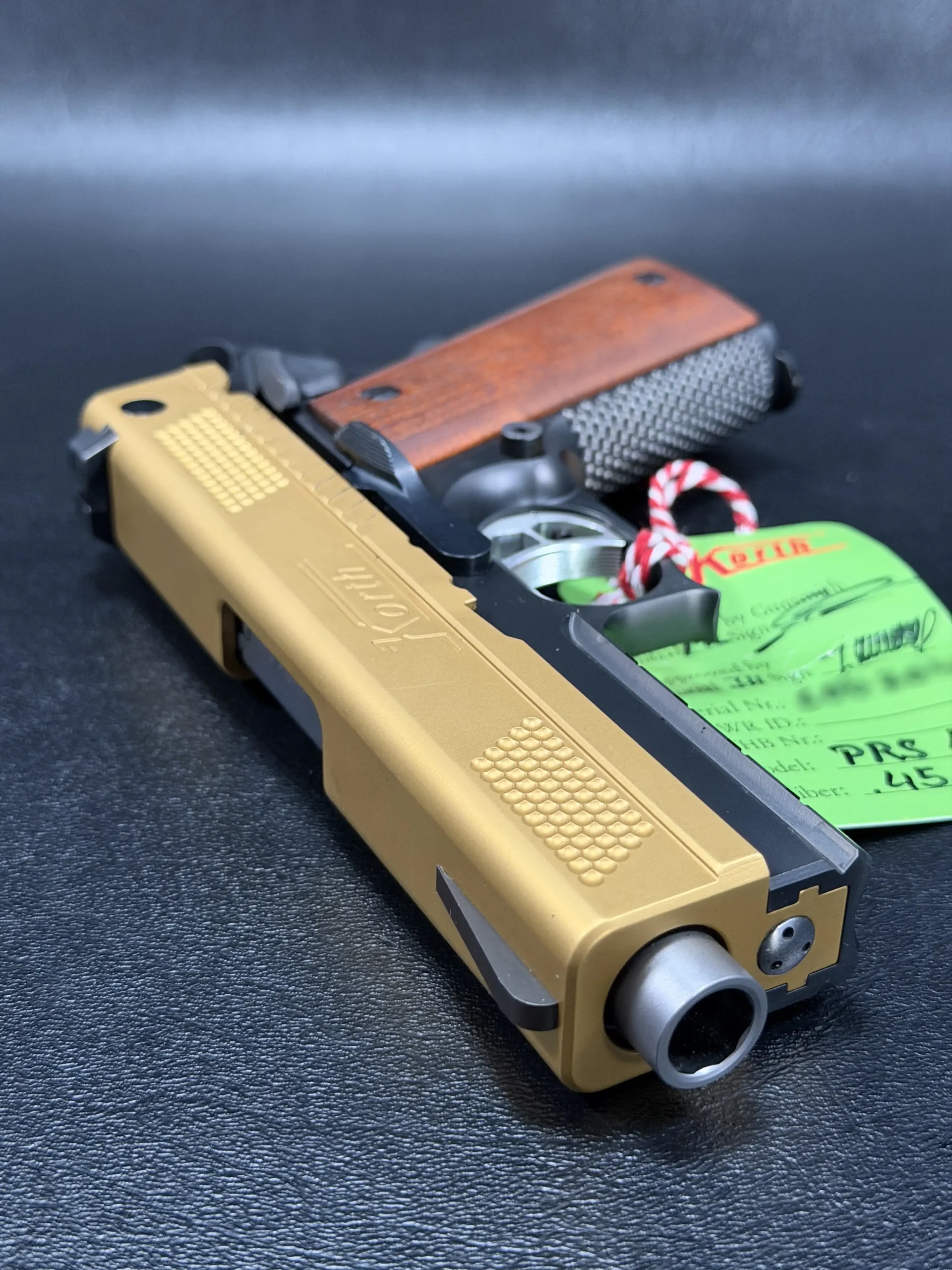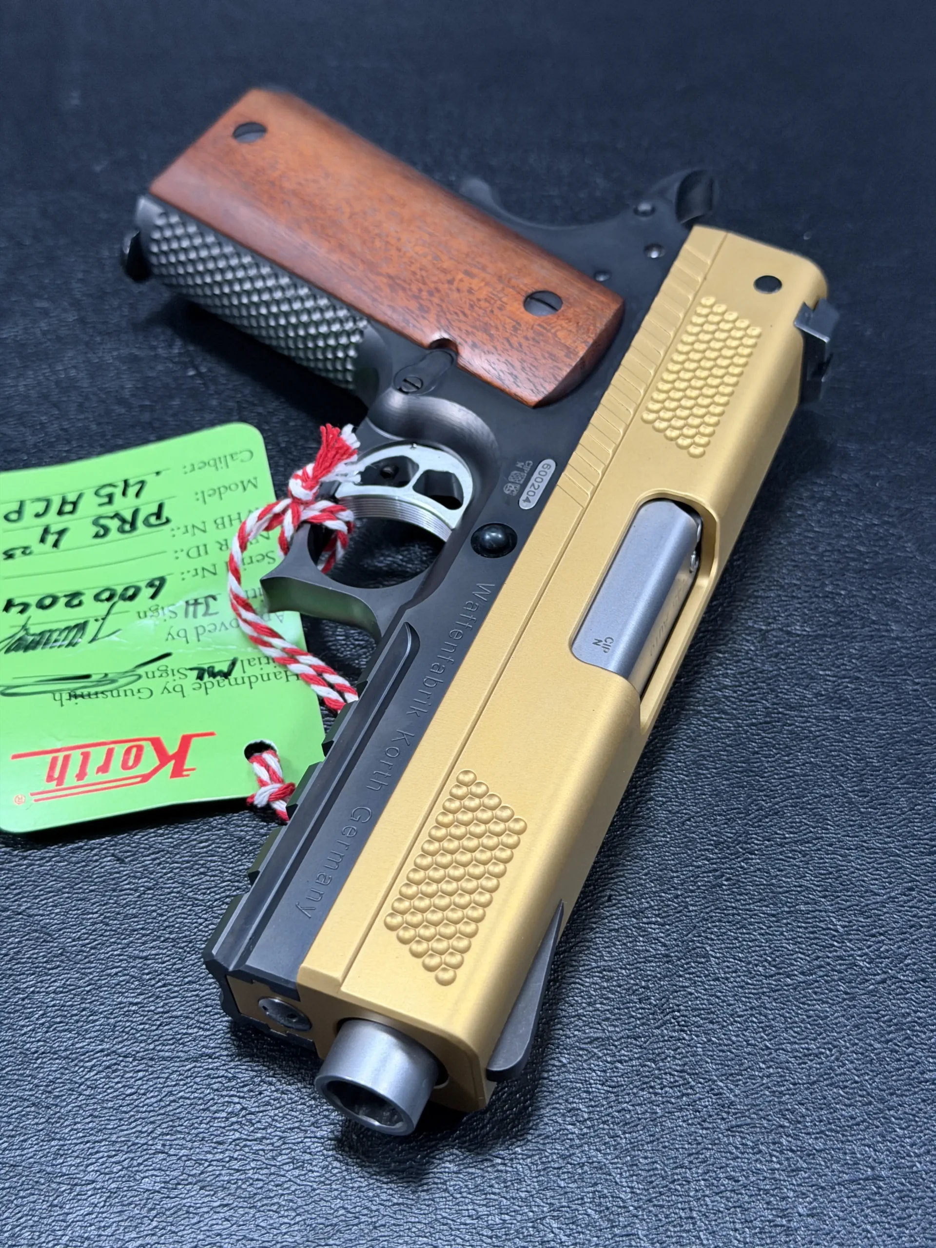 The 4.25-inch PRS platform strikes a deliberate balance, compact enough to feel purposeful, yet substantial enough to showcase Korth’s obsessive machining and finish work. The gold-tone slide immediately draws the eye, its precision-cut texturing catching light from every angle, while the contrasting black frame anchors the pistol with a sense of restraint and mechanical seriousness. Together, the finishes feel intentional rather than ornamental, bold, but disciplined.