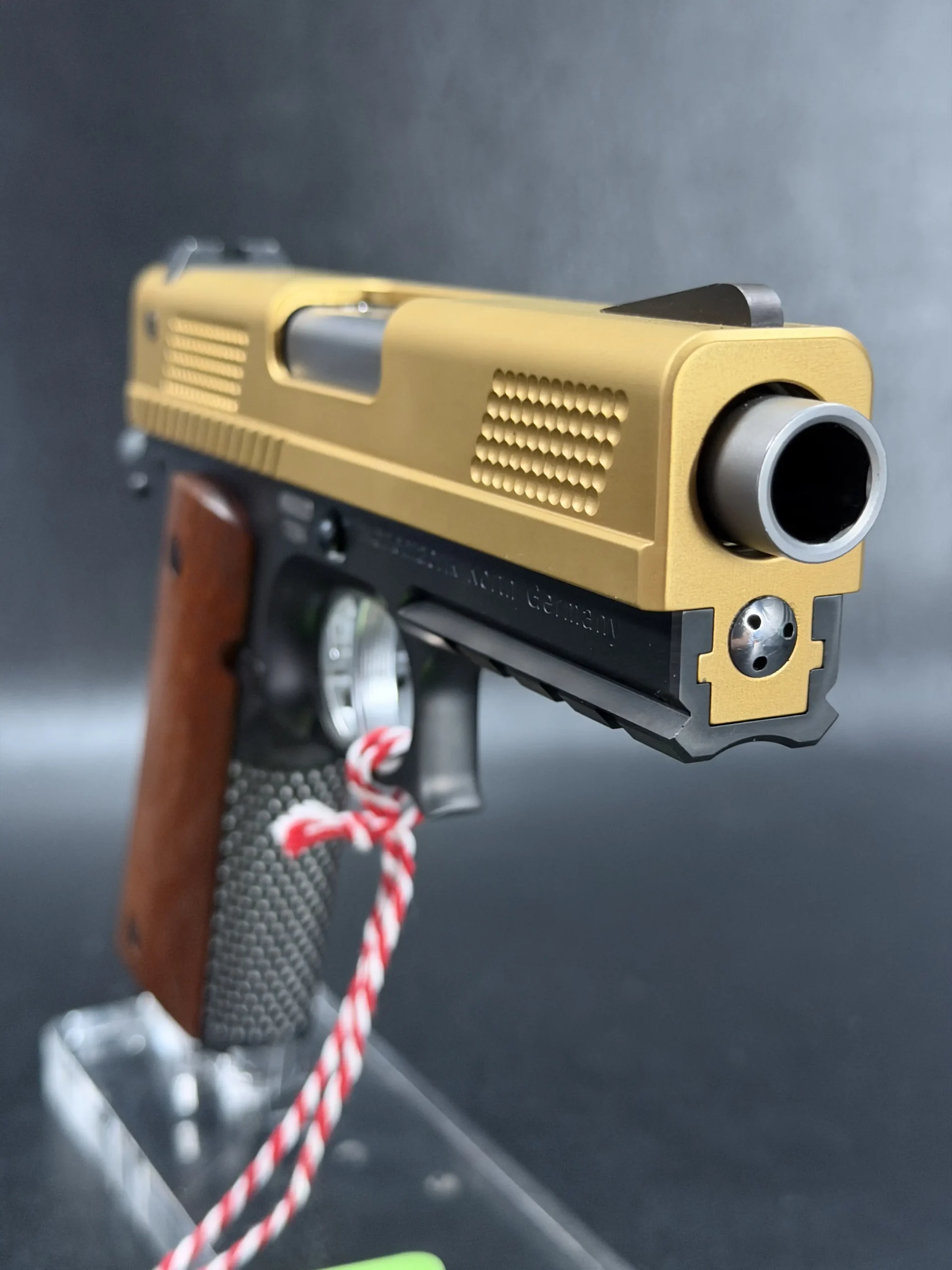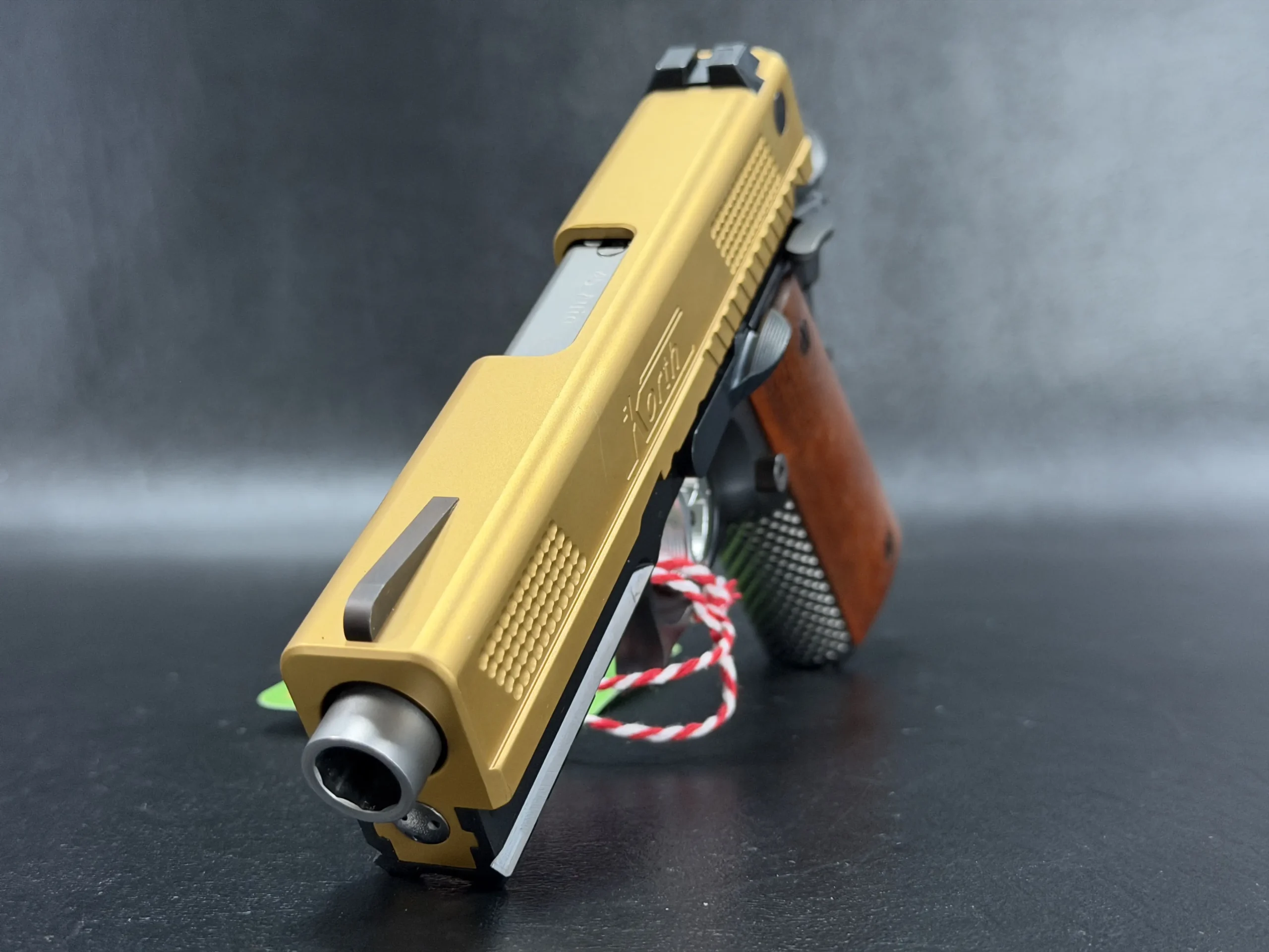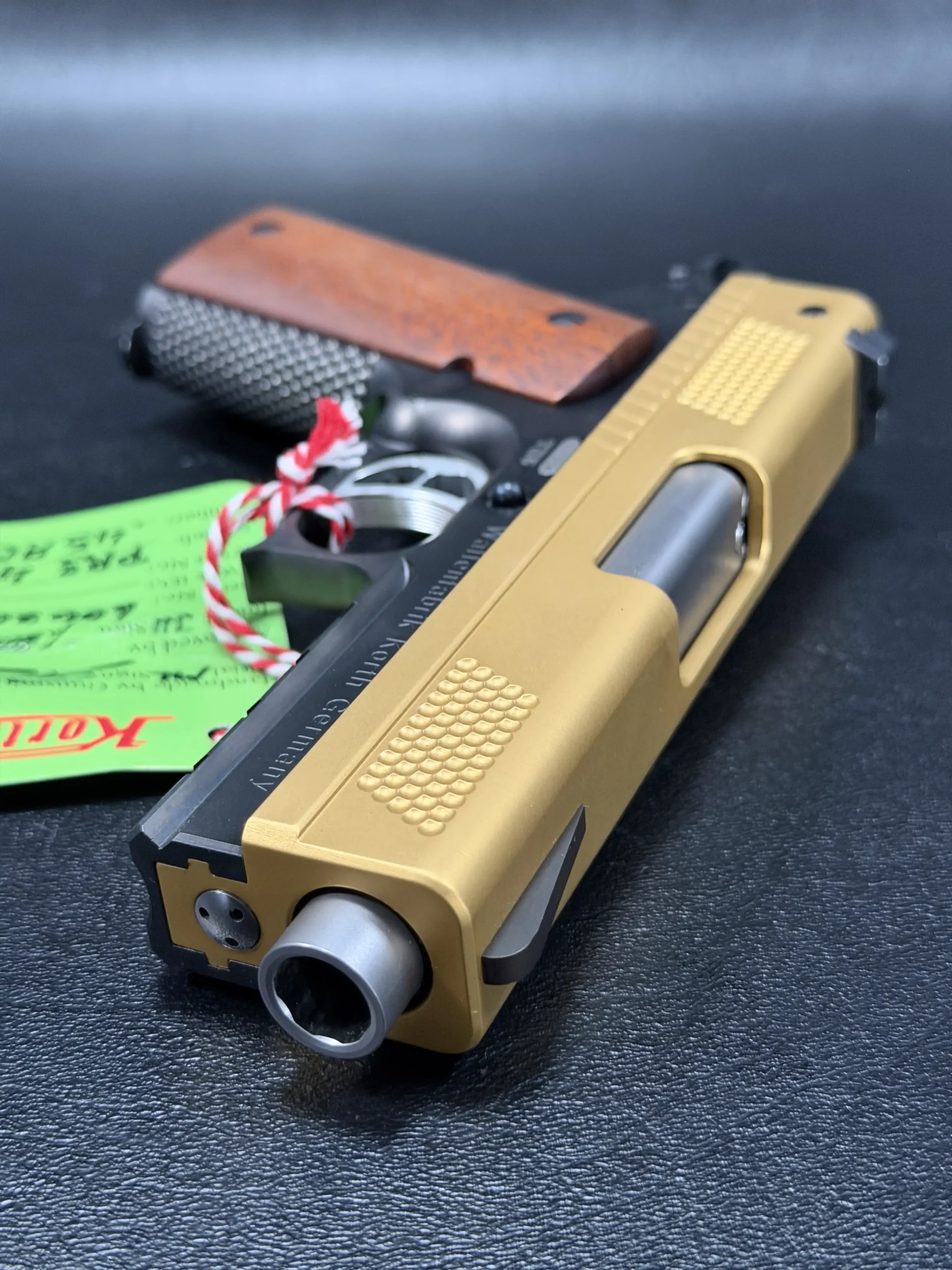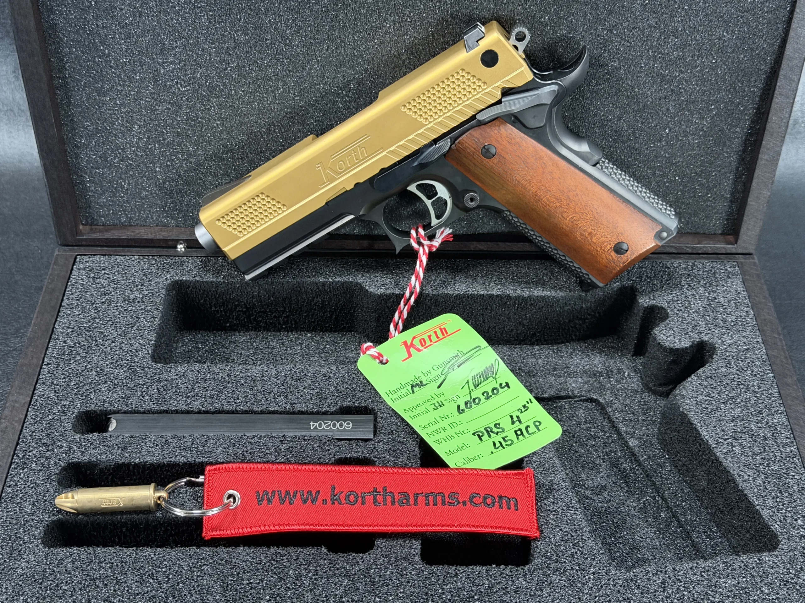 The 4.25-inch PRS platform strikes a deliberate balance, compact enough to feel purposeful, yet substantial enough to showcase Korth’s obsessive machining and finish work. The gold-tone slide immediately draws the eye, its precision-cut texturing catching light from every angle, while the contrasting black frame anchors the pistol with a sense of restraint and mechanical seriousness. Together, the finishes feel intentional rather than ornamental, bold, but disciplined.