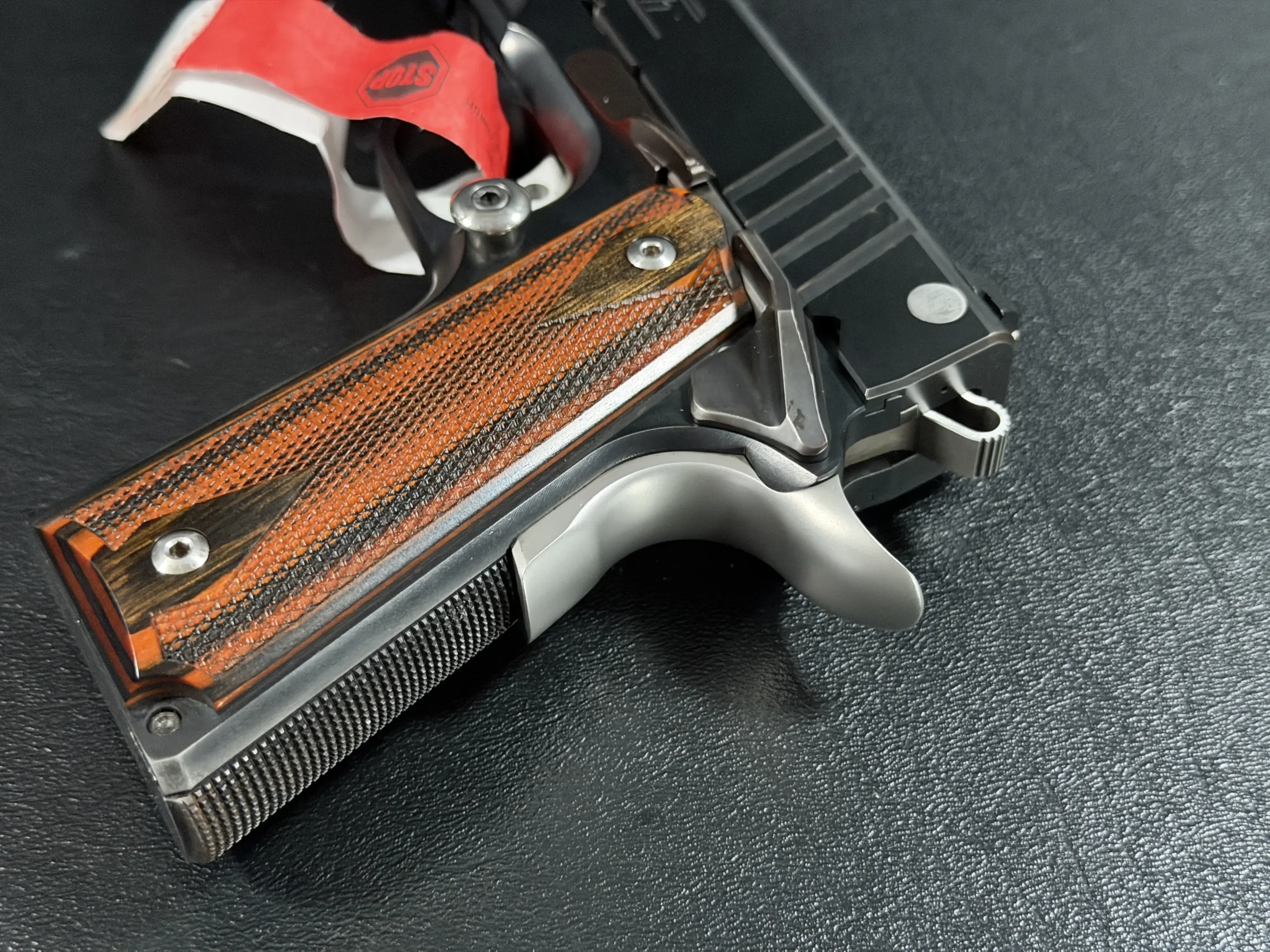 The slide wears Korth’s deep, lustrous finish, contrasted by the stainless steel accents that frame the hammer, beavertail, and control surfaces. The custom wood grips add a warm, textured balance to the otherwise technical aesthetic, giving the pistol both presence and personality. Even in the hand, the PRS feels unmistakably Korth: dense, smooth, and engineered to an extraordinarily tight standard.