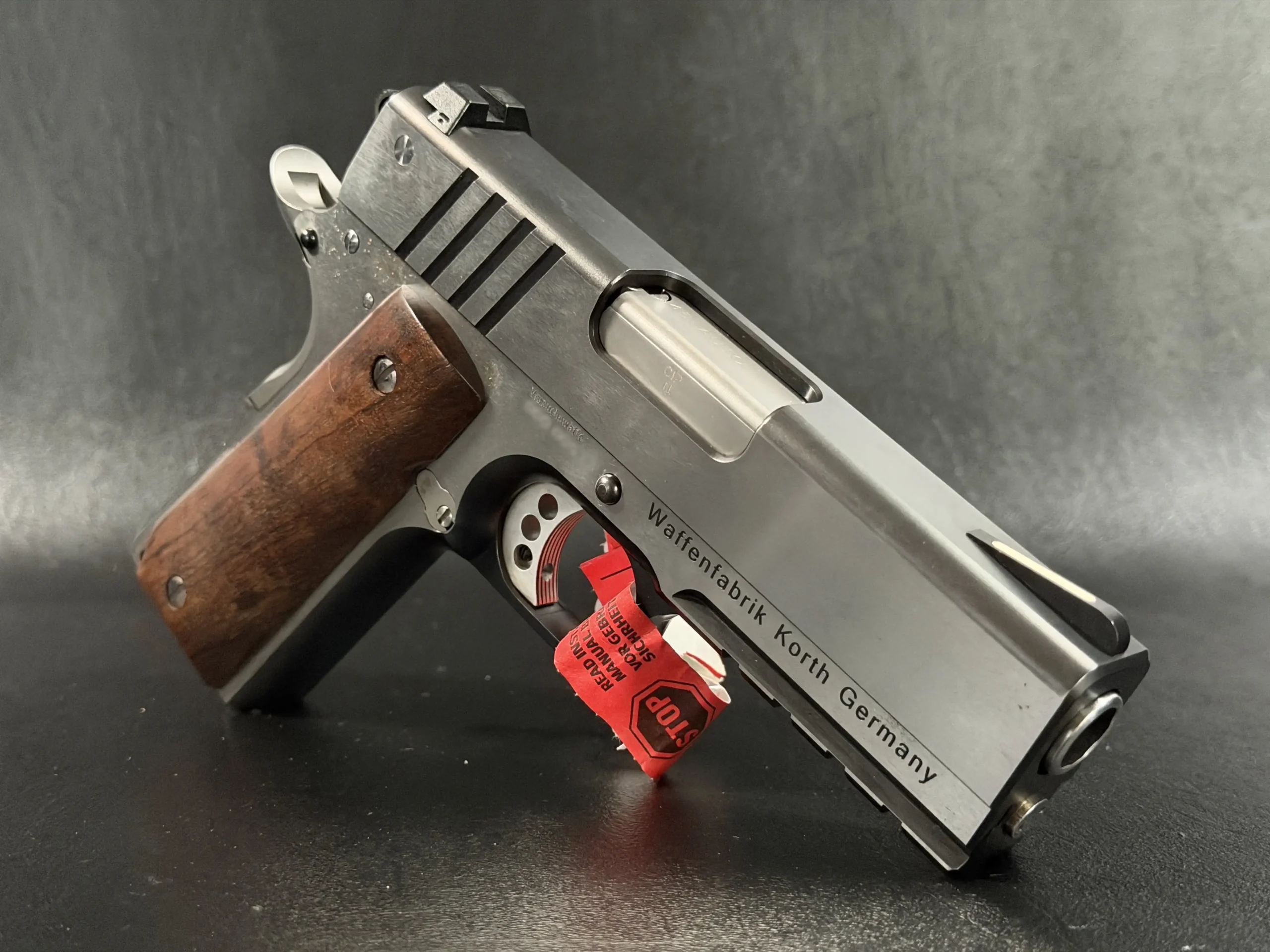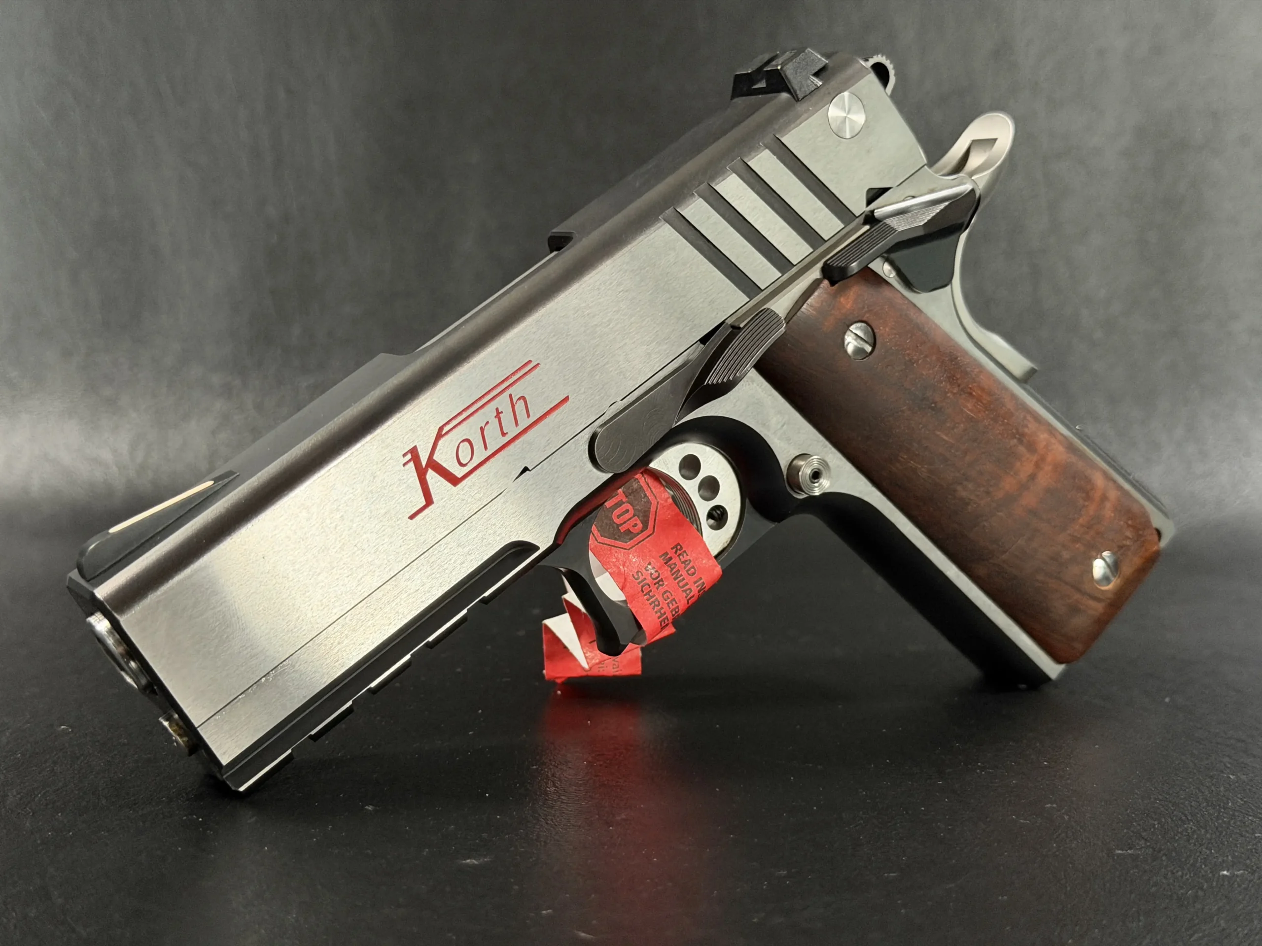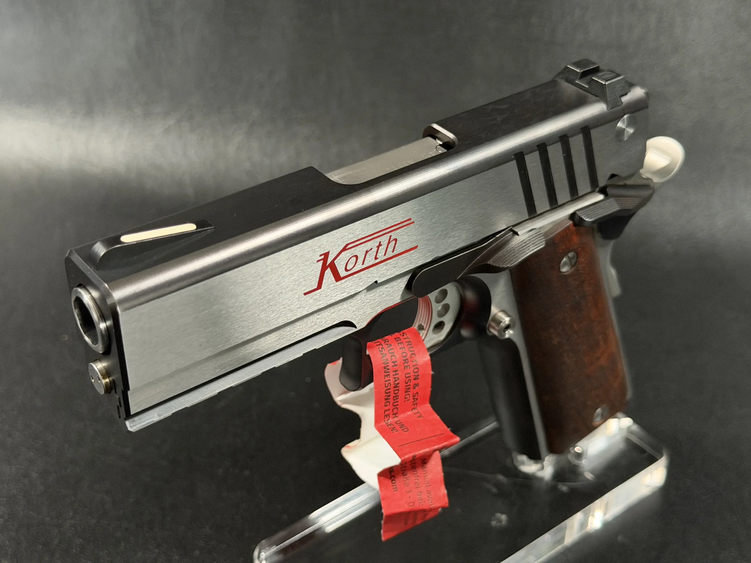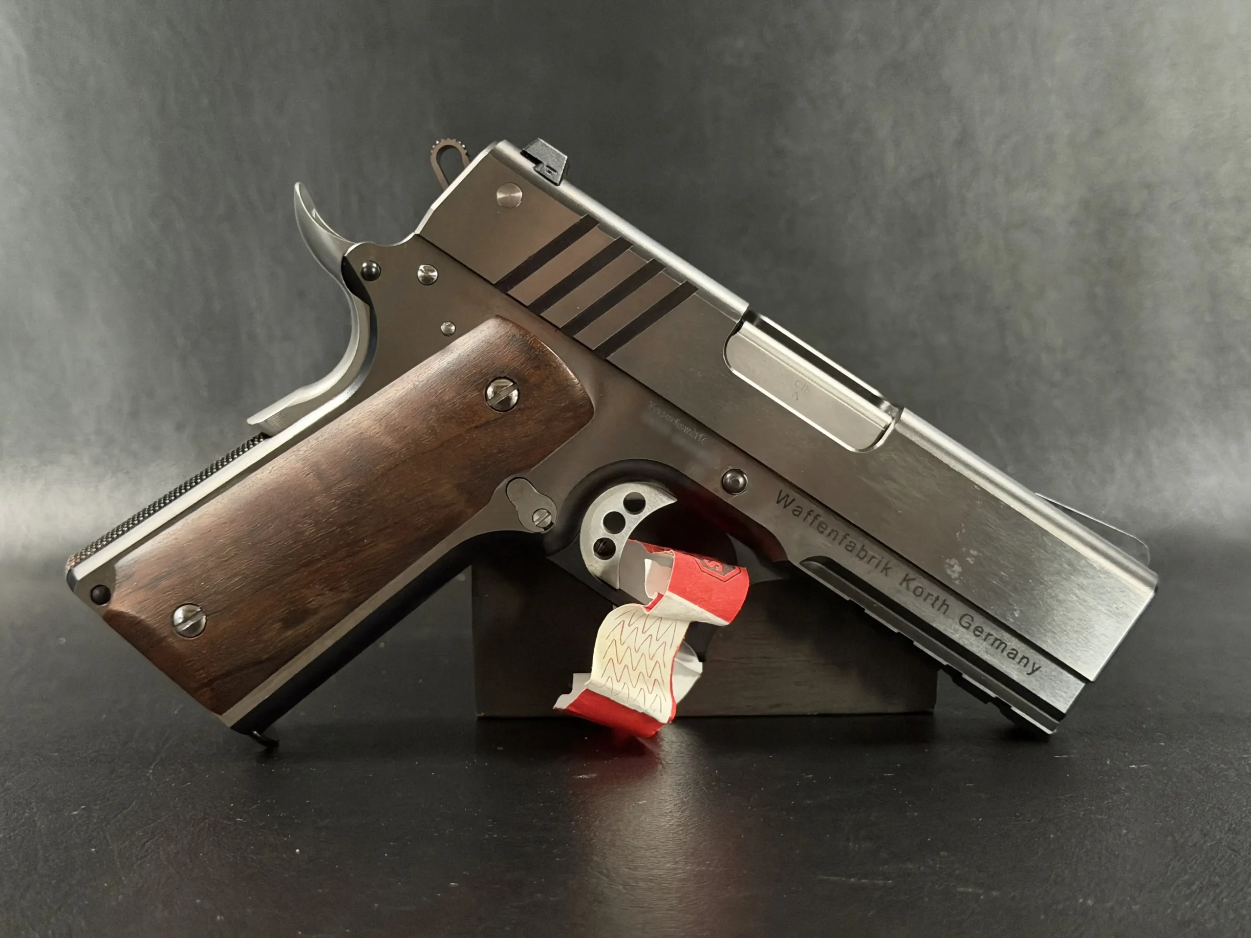 A set of warm, beautifully grained walnut grips anchors the gun visually and balances the metalwork with an organic touch. Every edge, cut, and mechanical interface reflects Korth’s reputation for uncompromising craftsmanship. From the precisely machined barrel to the finely tuned fire-control components, nothing on this .45 ACP is accidental.