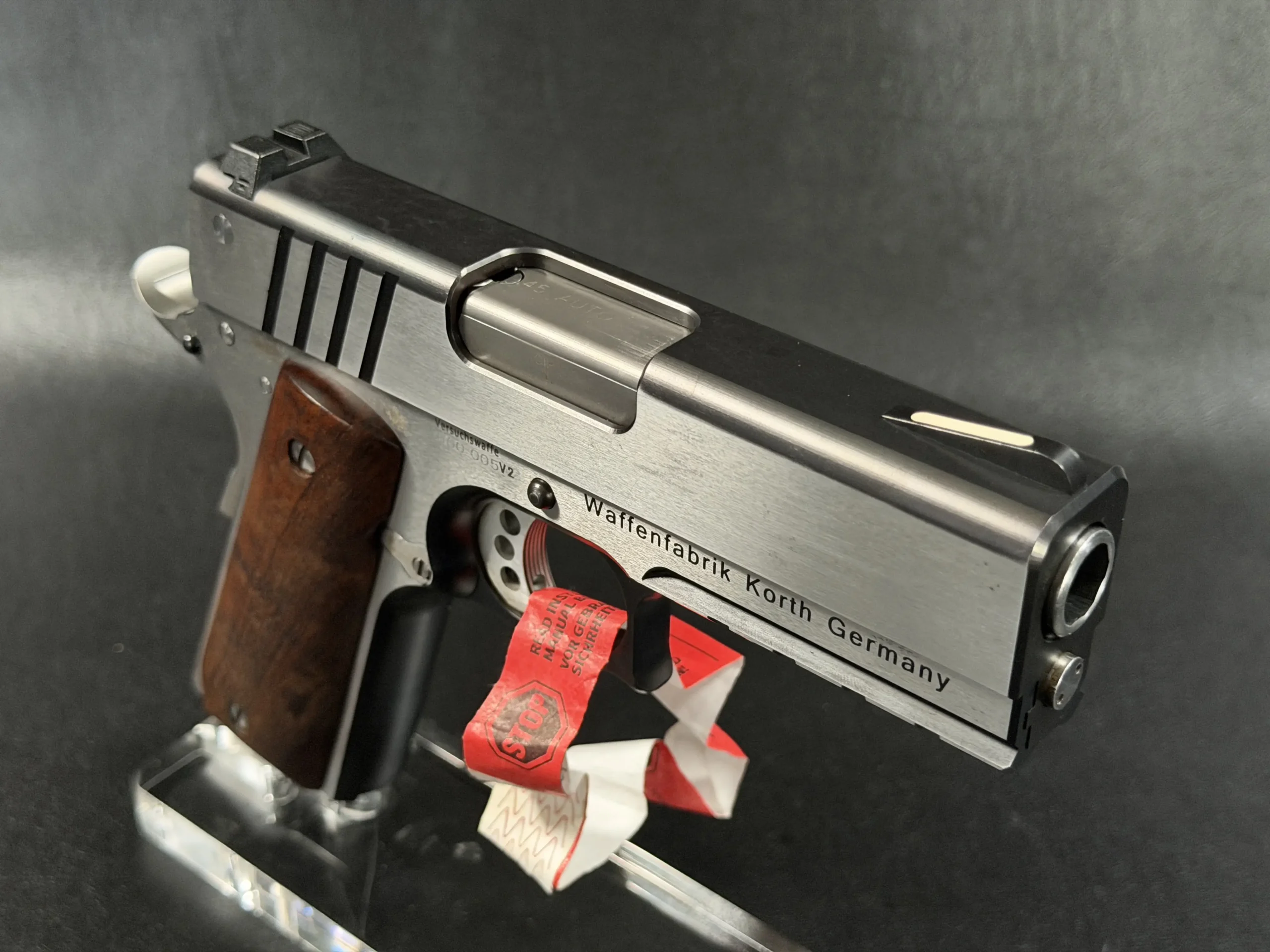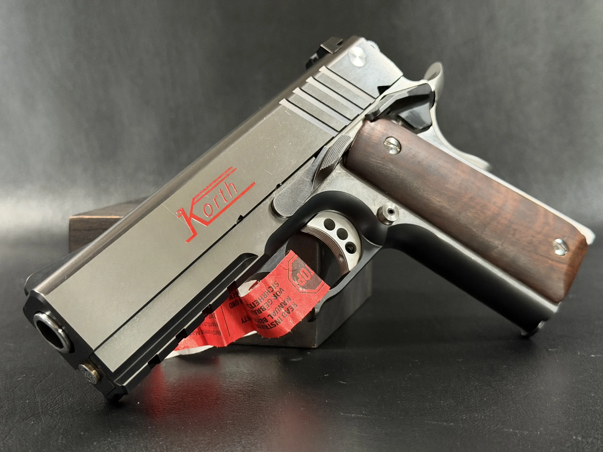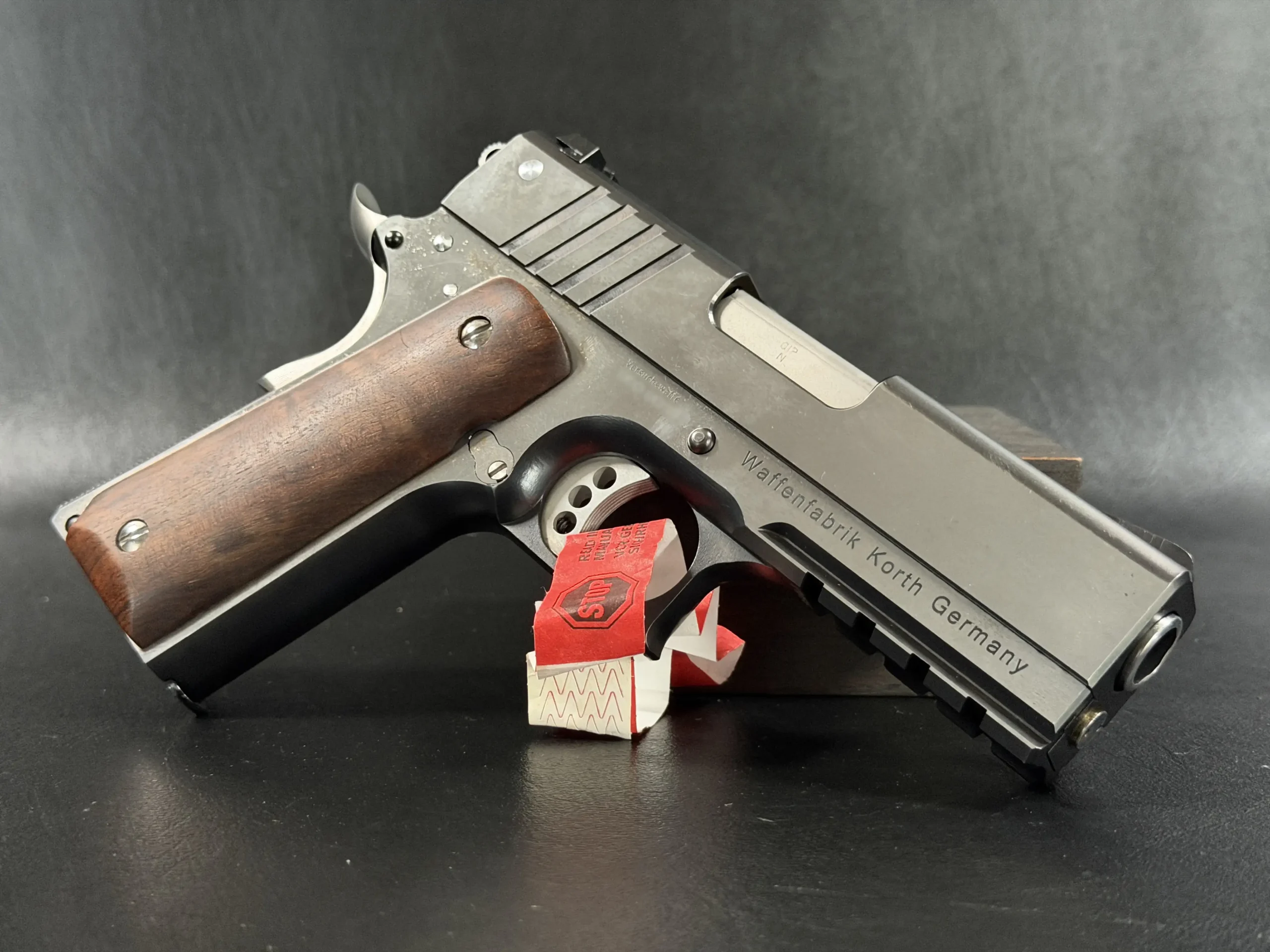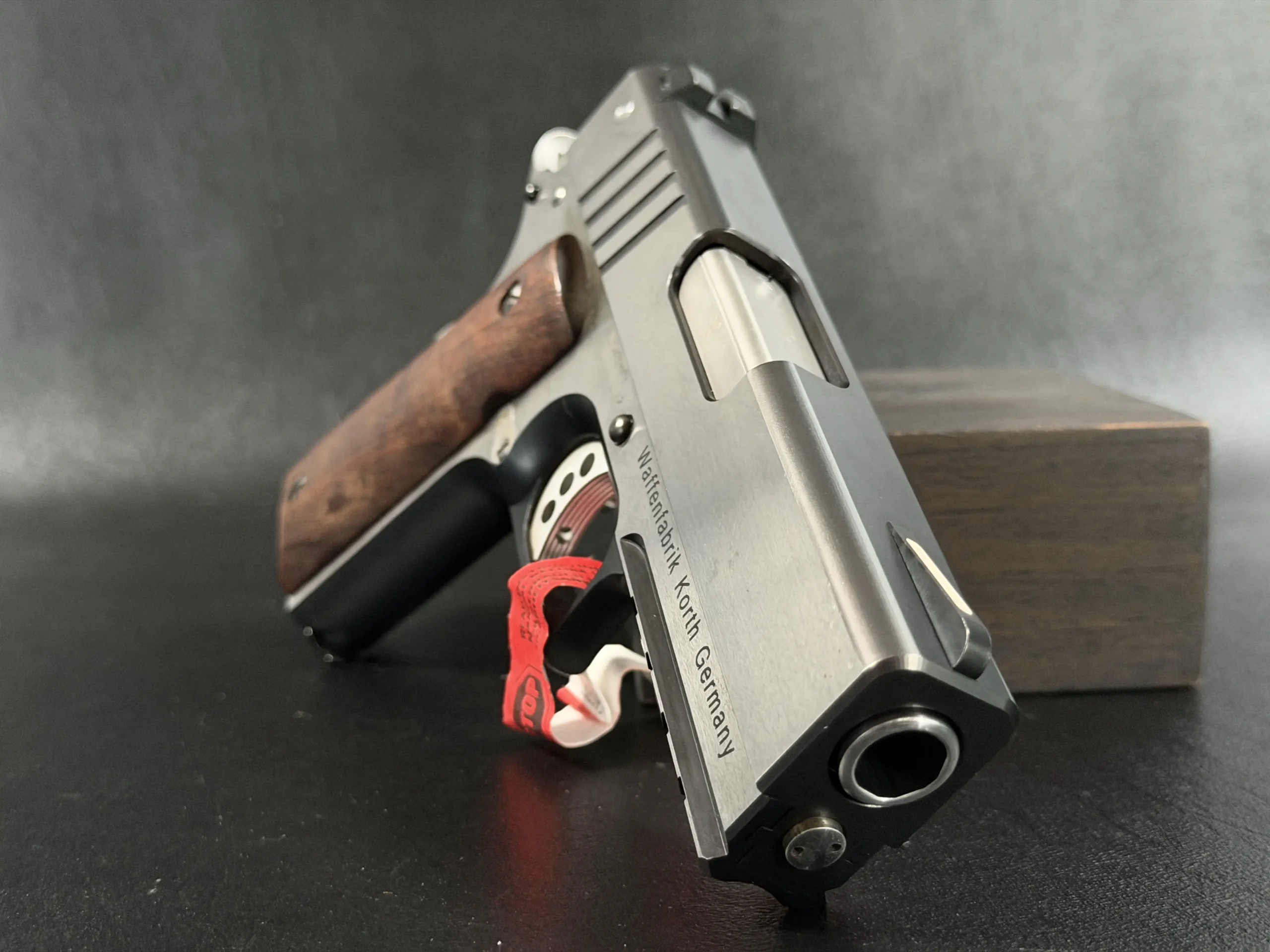 A set of warm, beautifully grained walnut grips anchors the gun visually and balances the metalwork with an organic touch. Every edge, cut, and mechanical interface reflects Korth’s reputation for uncompromising craftsmanship. From the precisely machined barrel to the finely tuned fire-control components, nothing on this .45 ACP is accidental.