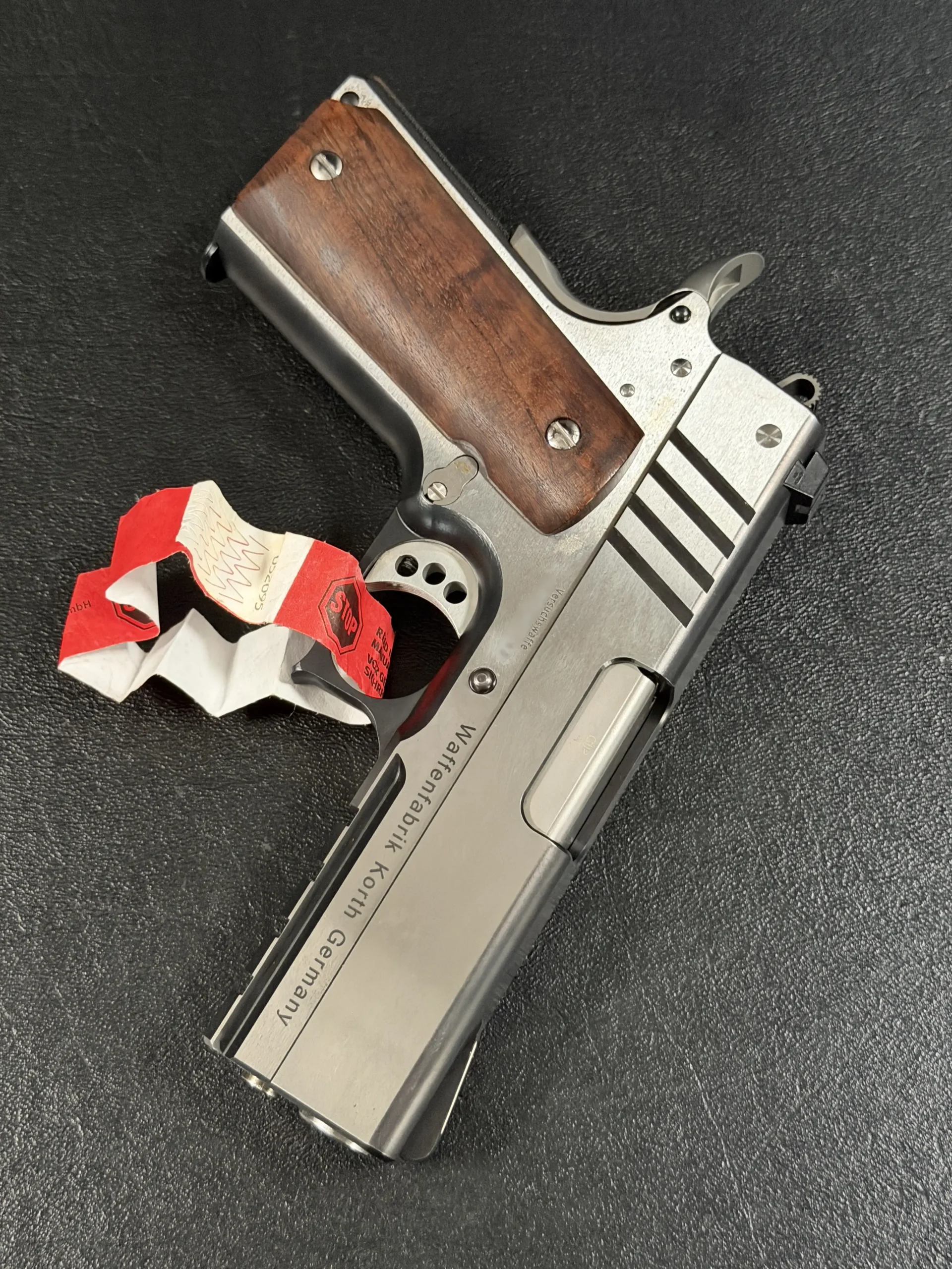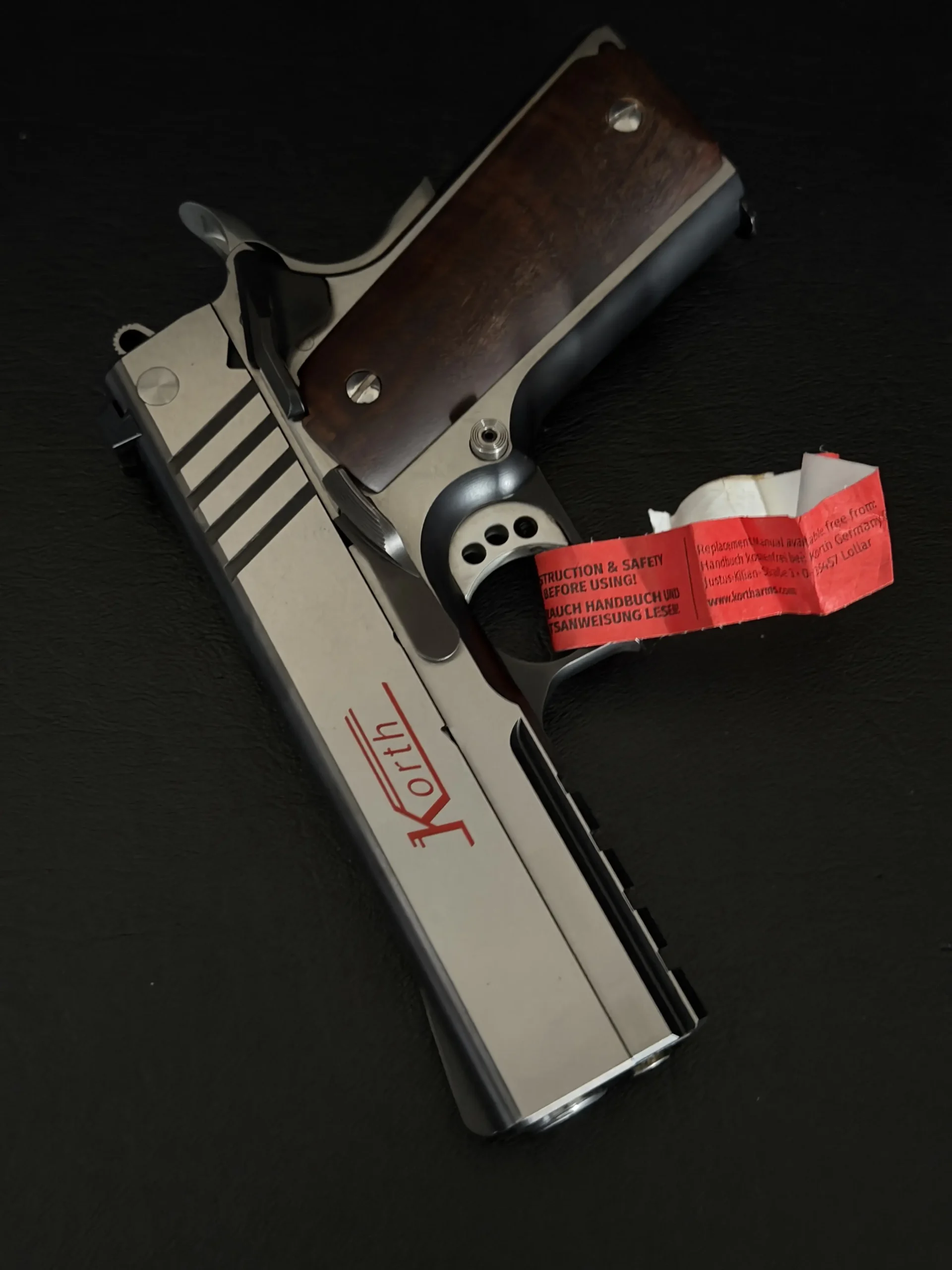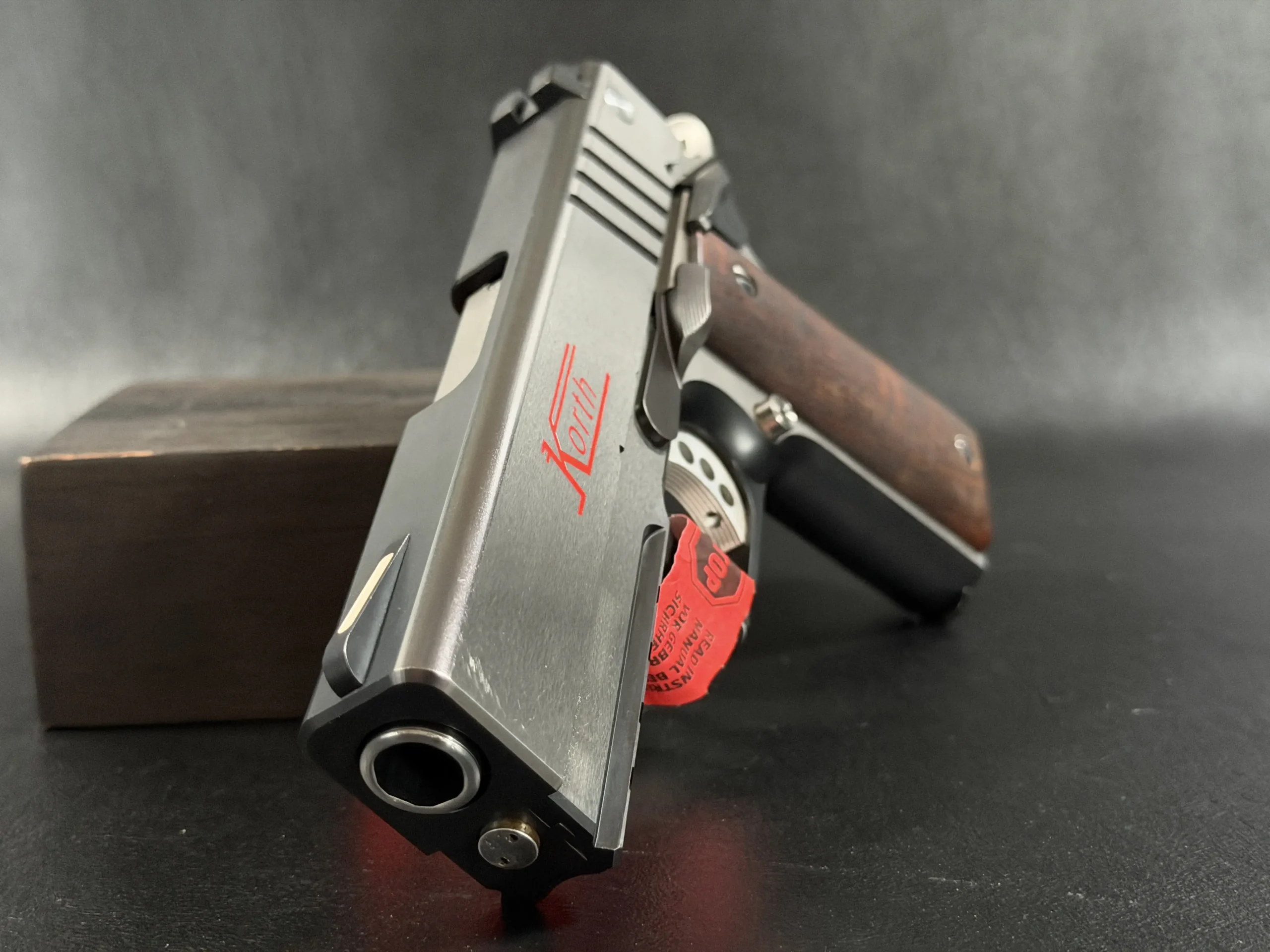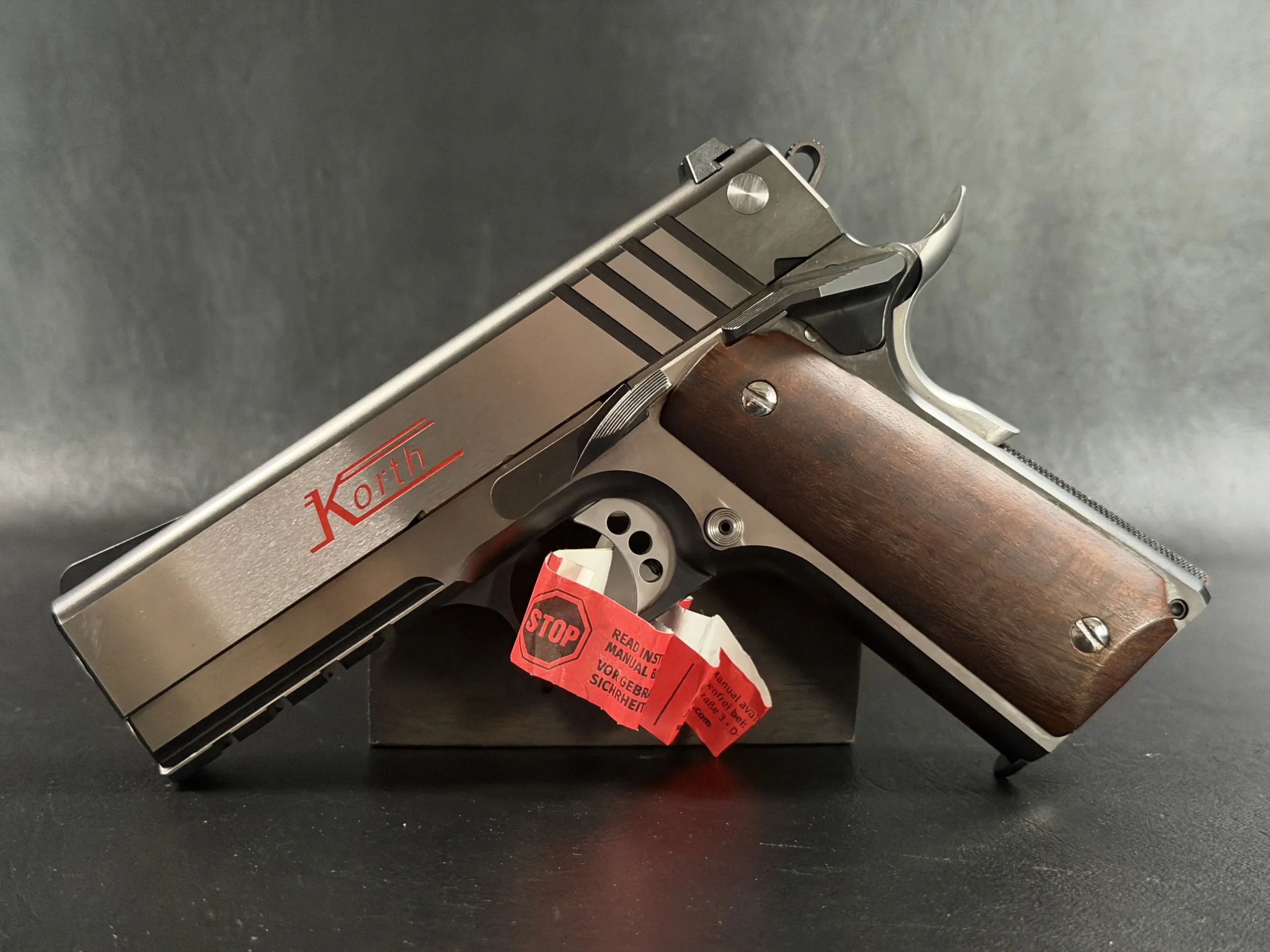 A set of warm, beautifully grained walnut grips anchors the gun visually and balances the metalwork with an organic touch. Every edge, cut, and mechanical interface reflects Korth’s reputation for uncompromising craftsmanship. From the precisely machined barrel to the finely tuned fire-control components, nothing on this .45 ACP is accidental.