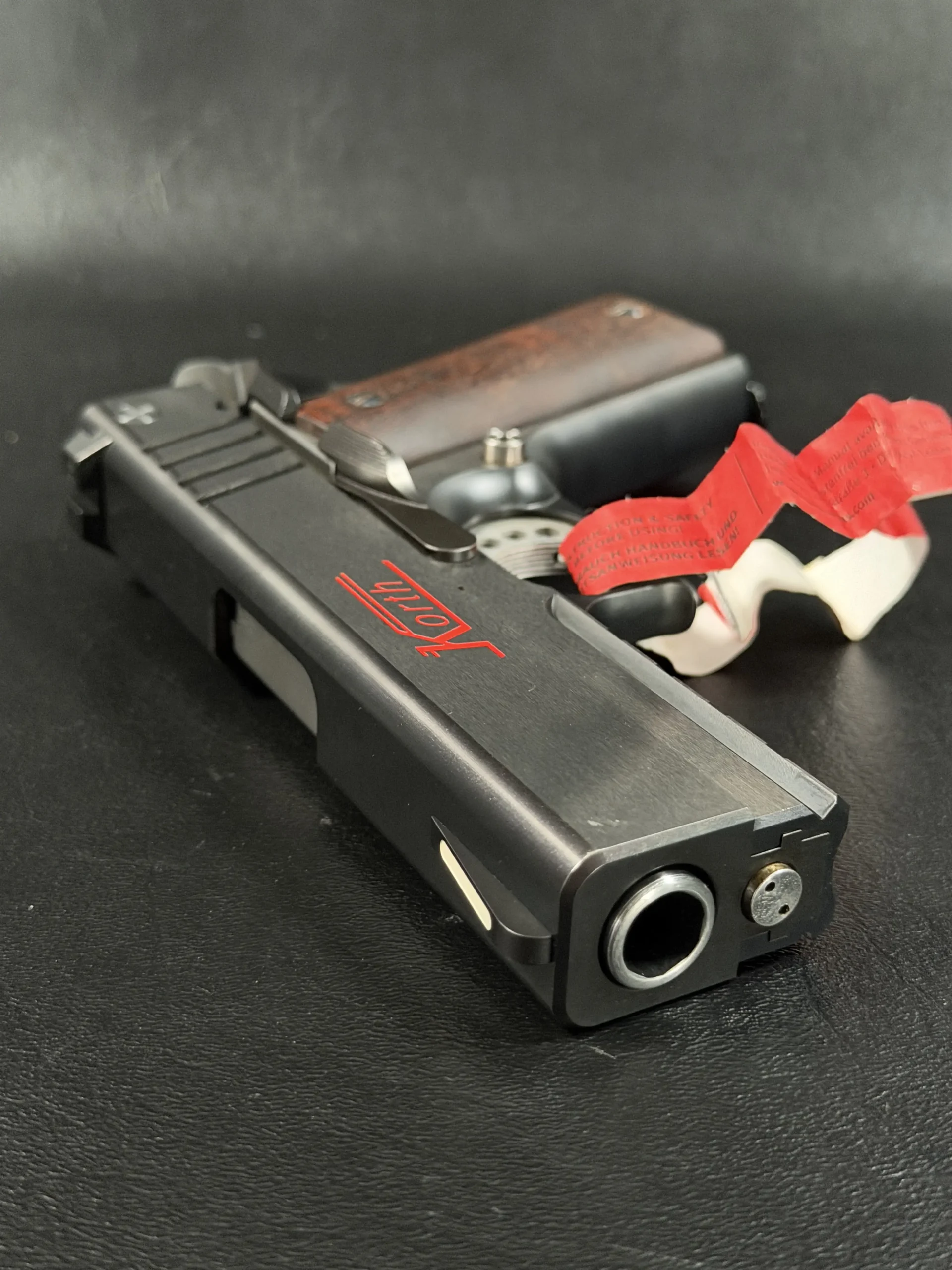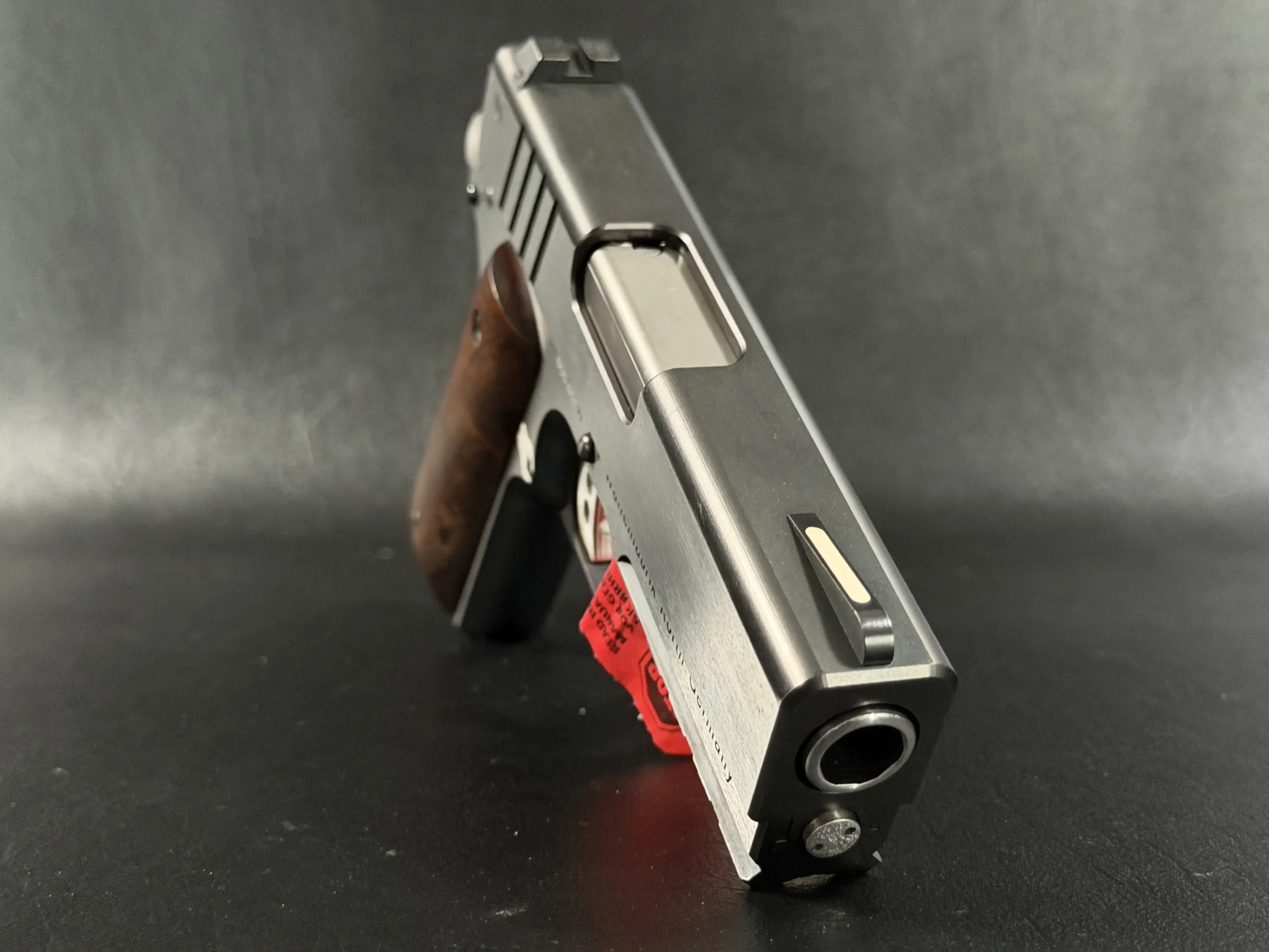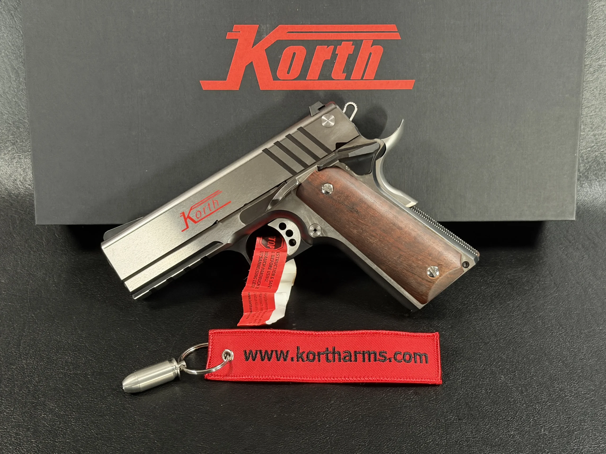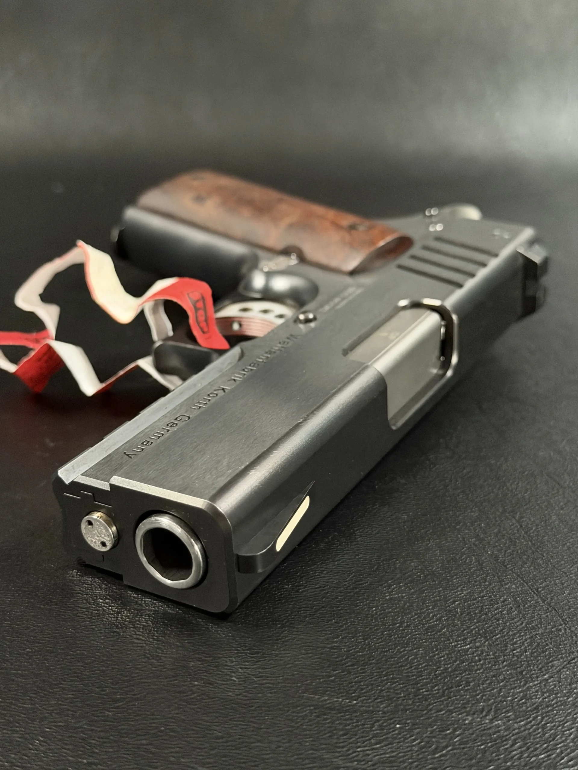 A set of warm, beautifully grained walnut grips anchors the gun visually and balances the metalwork with an organic touch. Every edge, cut, and mechanical interface reflects Korth’s reputation for uncompromising craftsmanship. From the precisely machined barrel to the finely tuned fire-control components, nothing on this .45 ACP is accidental.