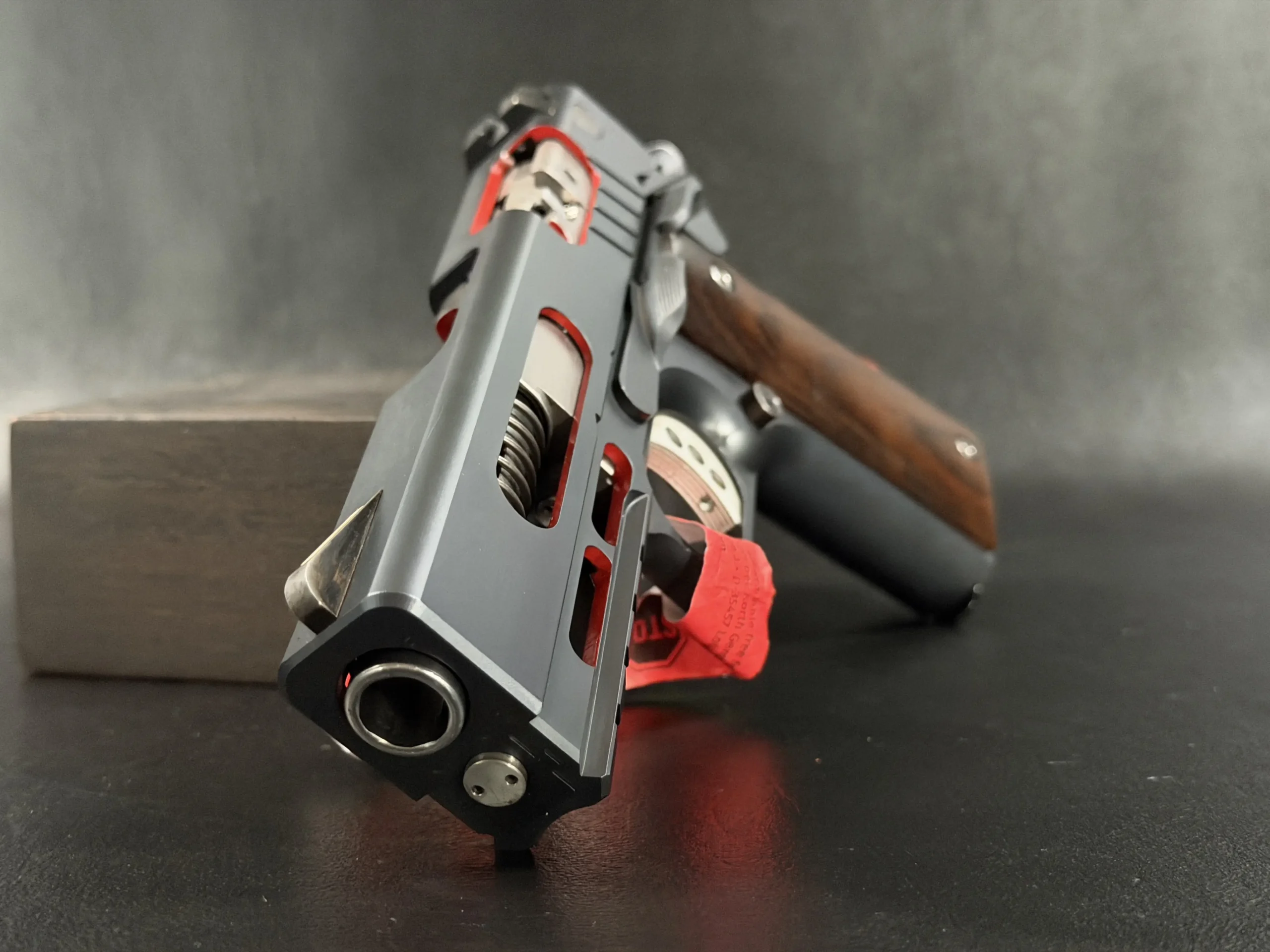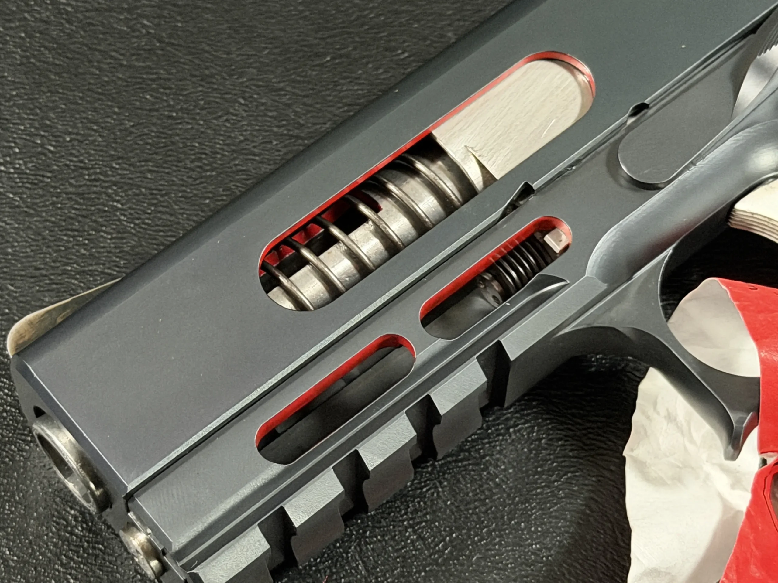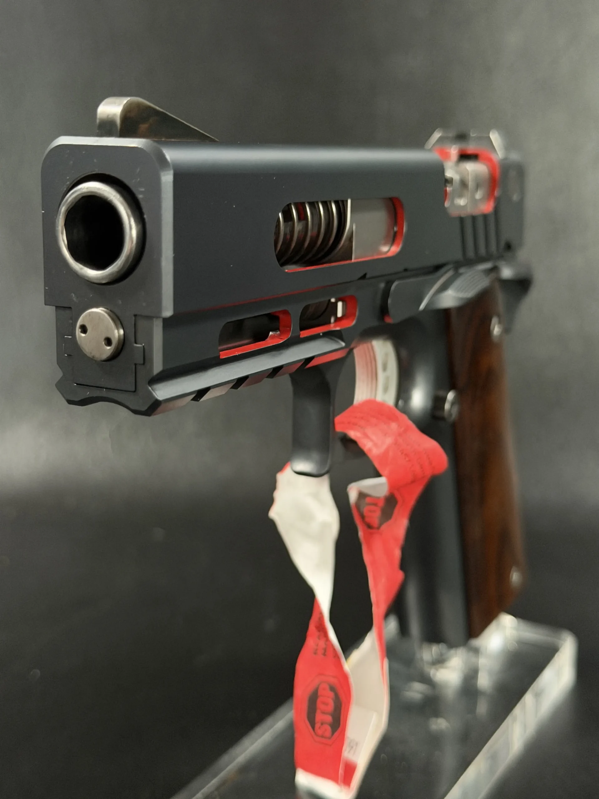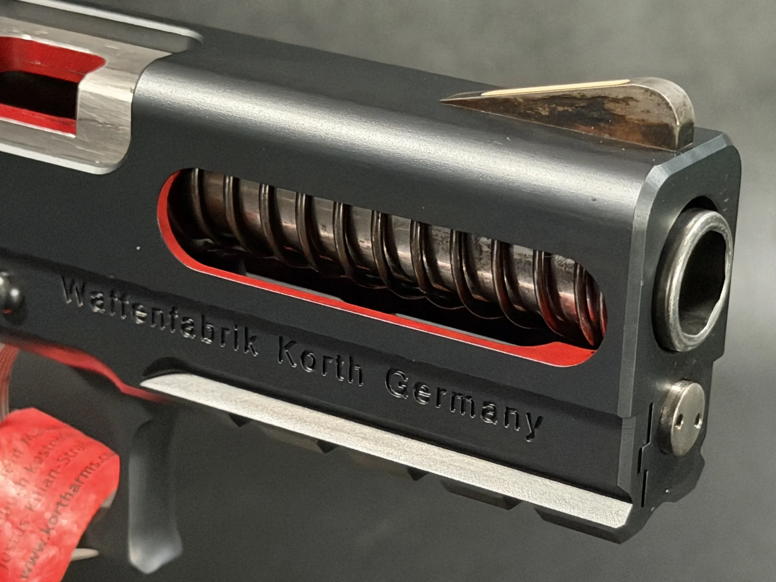 The 4” slide is skeletonized with deliberate, architectural openings that frame the recoil system, barrel hood, and fire-control components. Red anodized accents highlight the mechanical pathways, giving each cycle a sense of choreography. The frame retains the elegance and geometry Korth is known for, while the cutaway machining turns it into a teaching tool, a showcase, and ultimately a collectible unlike any standard-production PRS.
