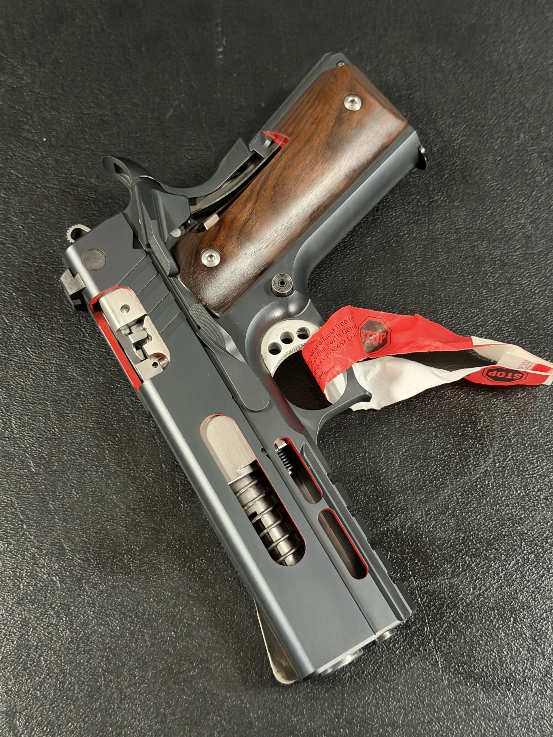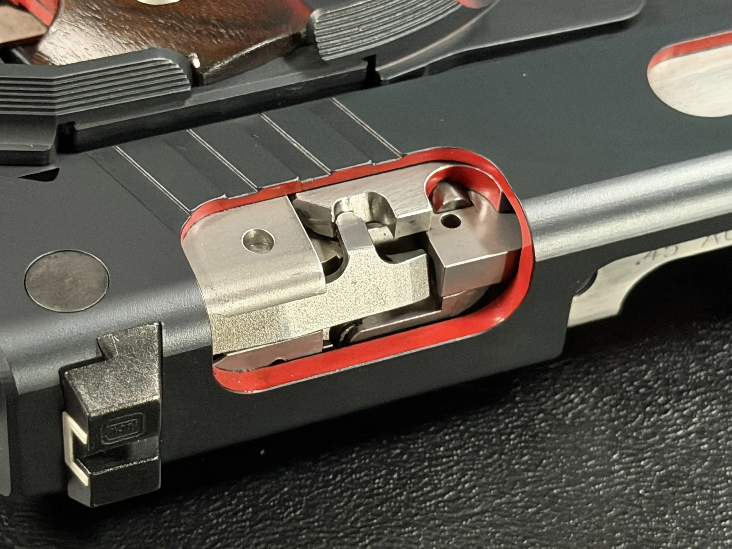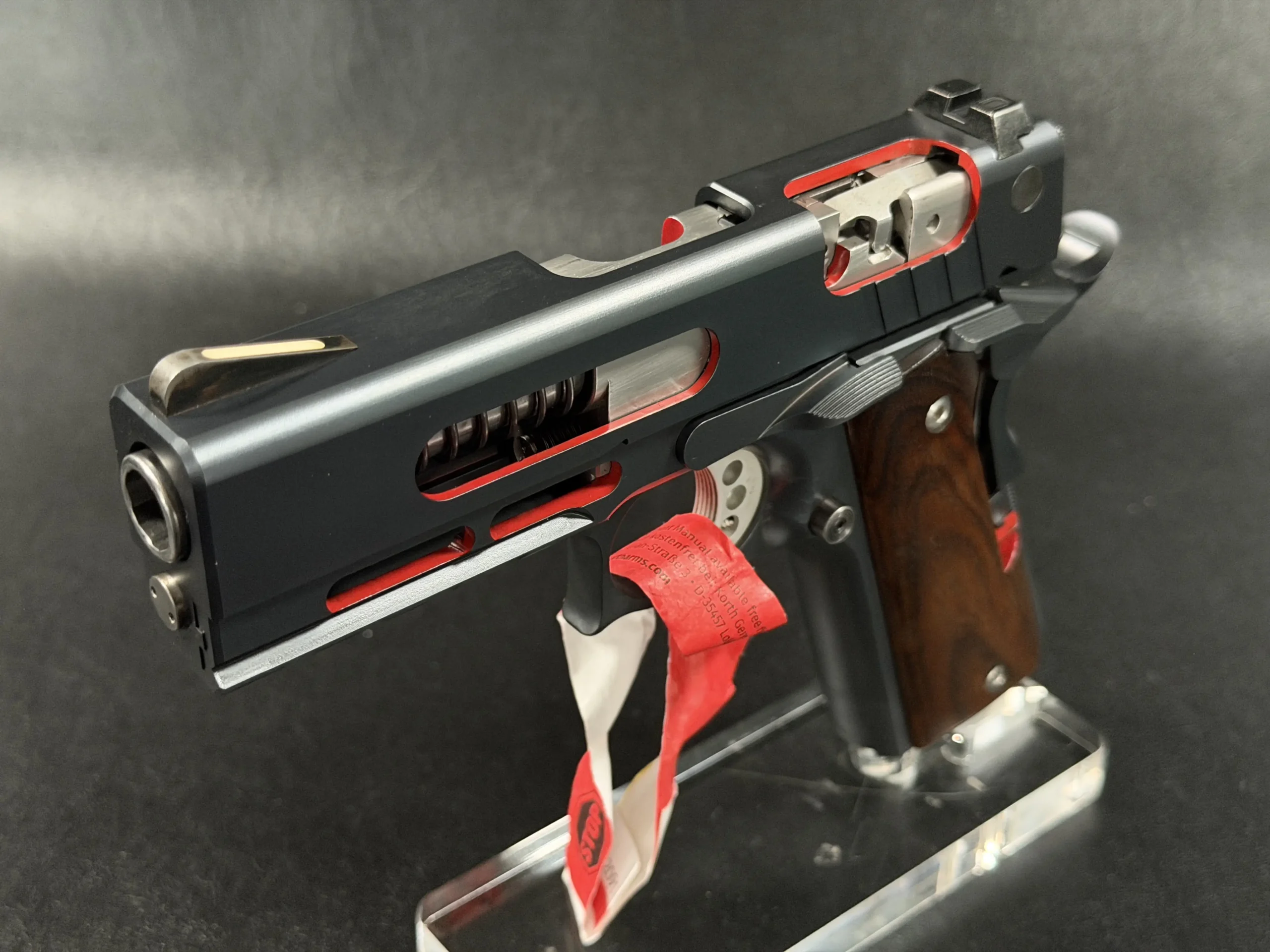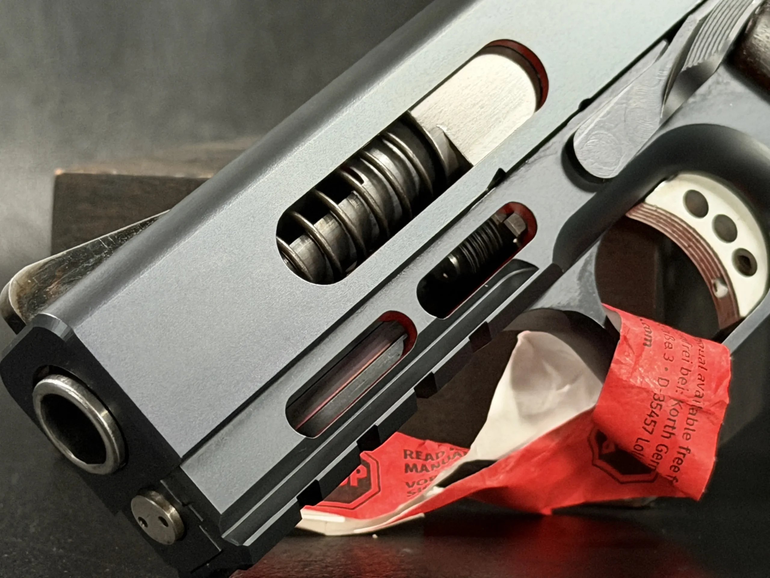 The 4” slide is skeletonized with deliberate, architectural openings that frame the recoil system, barrel hood, and fire-control components. Red anodized accents highlight the mechanical pathways, giving each cycle a sense of choreography. The frame retains the elegance and geometry Korth is known for, while the cutaway machining turns it into a teaching tool, a showcase, and ultimately a collectible unlike any standard-production PRS.