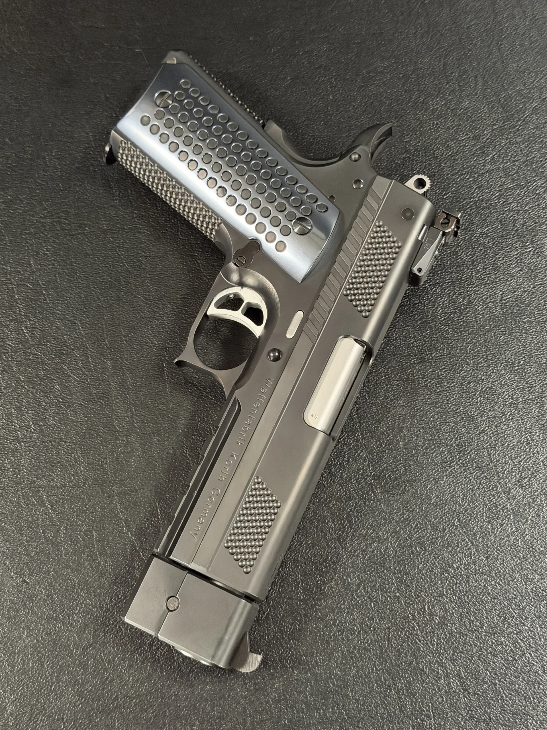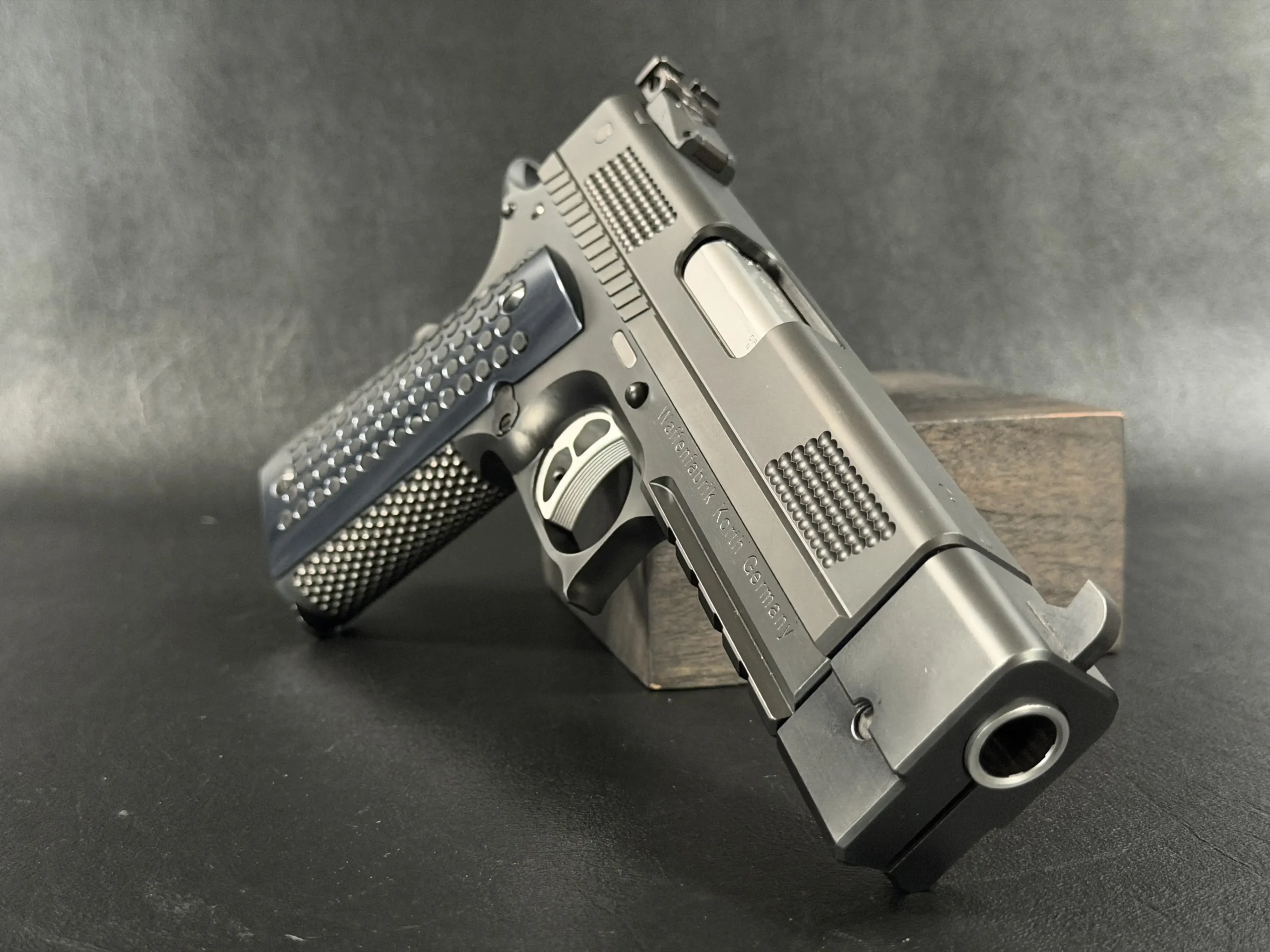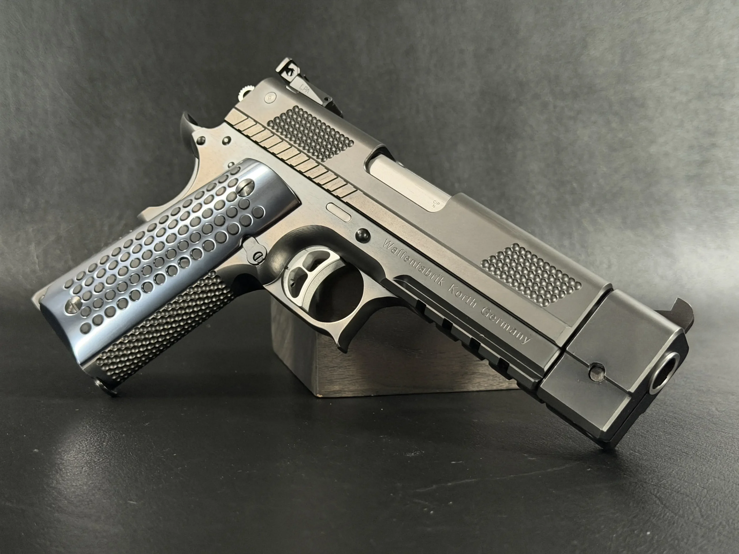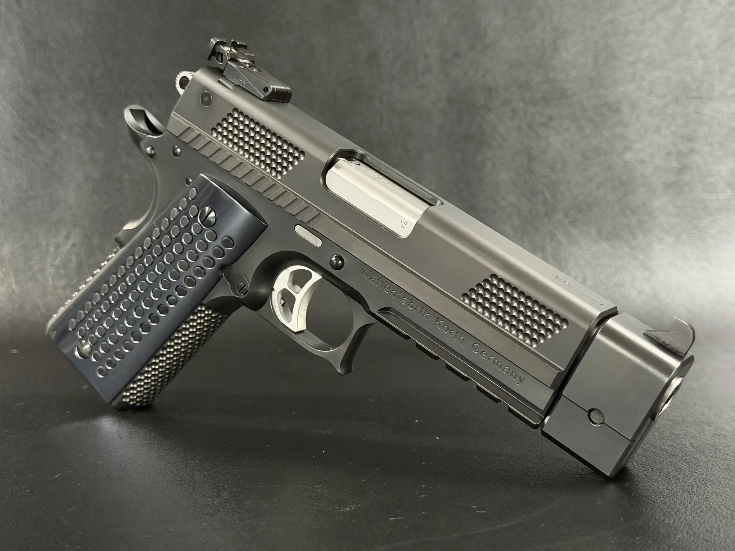 Finished in a deep black treatment, the pistol presents a cohesive, technical aesthetic that highlights Korth’s machining rather than distracting from it. The slide features Korth’s signature hemispherical texturing at the front and rear, providing both visual balance and functional grip without resorting to aggressive serrations. The integrated barrel weight system reinforces the PRS’s competition pedigree, contributing to exceptional recoil control and balance.