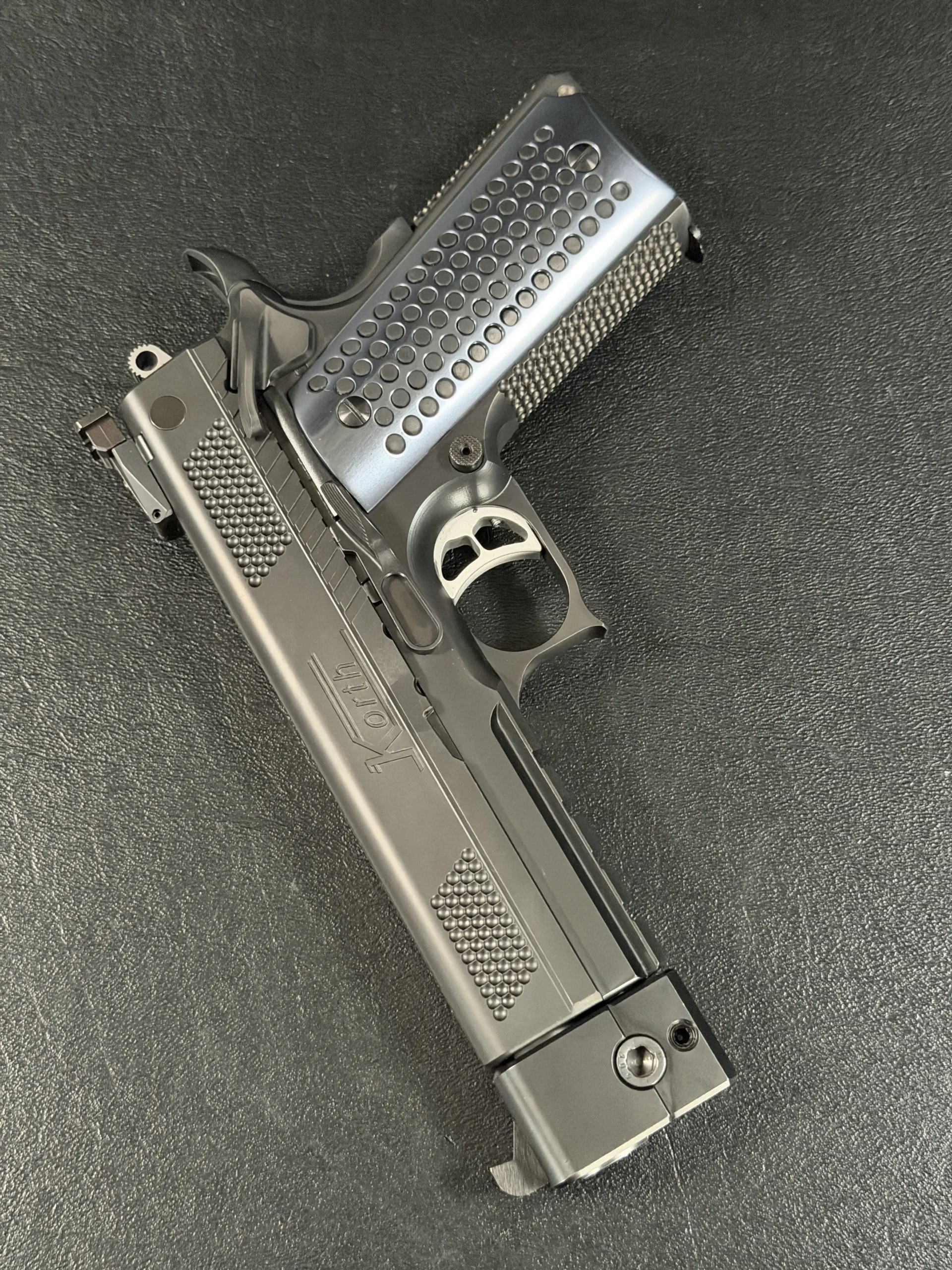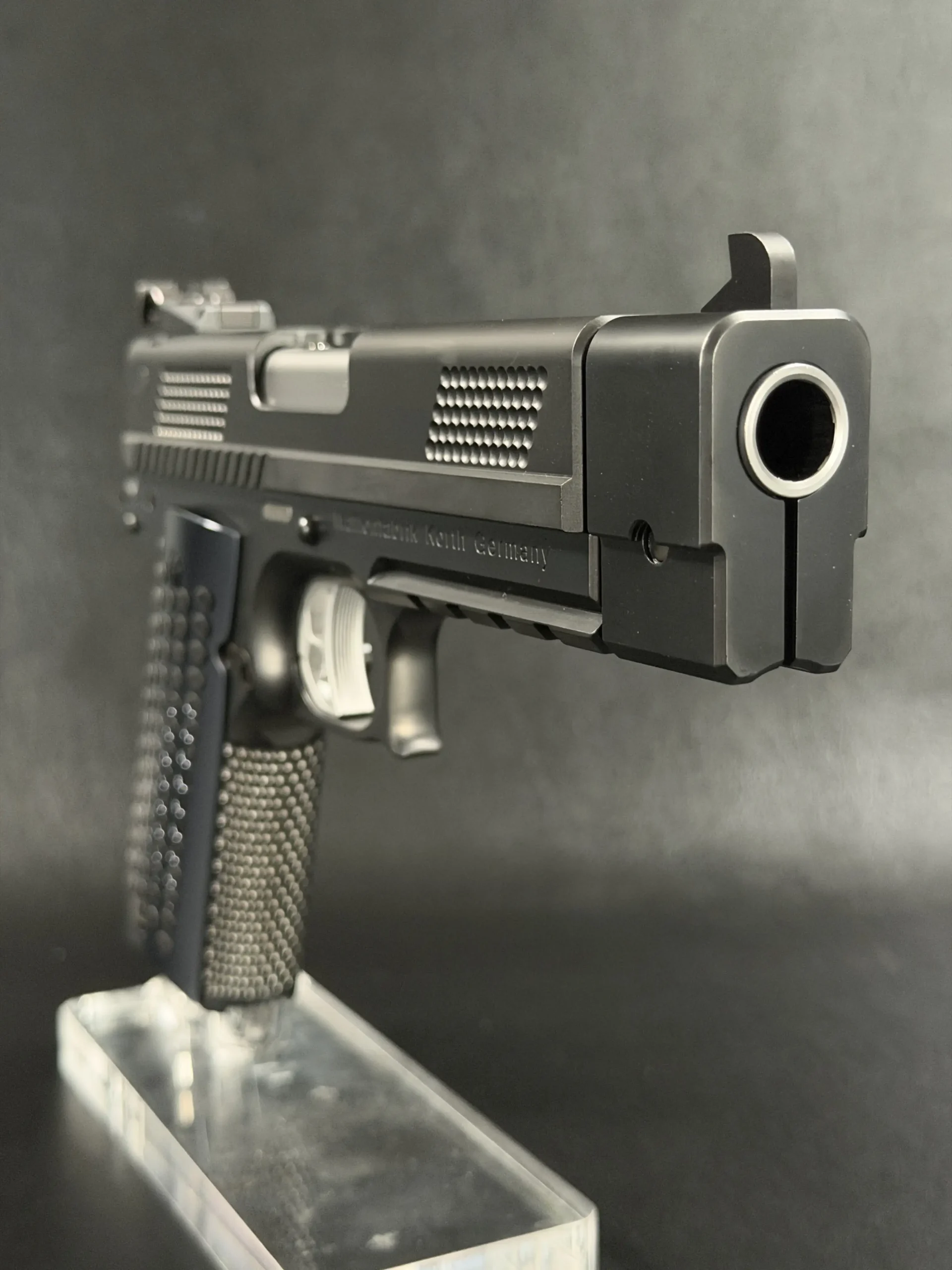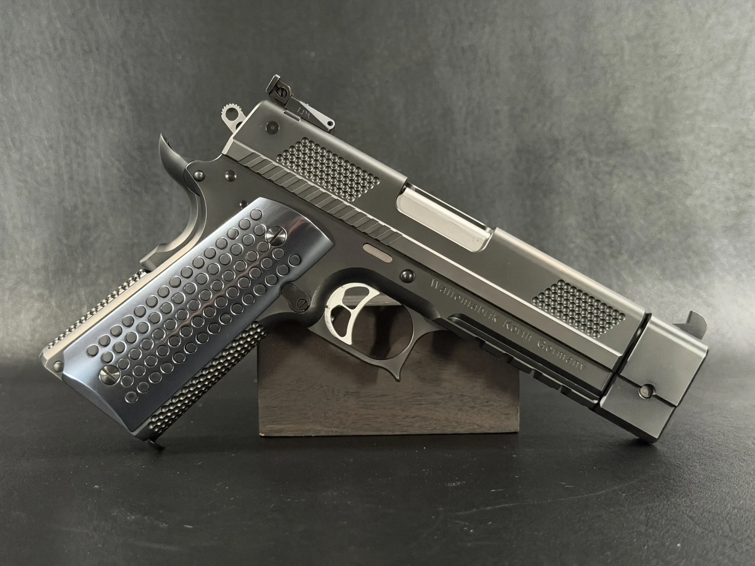 Finished in a deep black treatment, the pistol presents a cohesive, technical aesthetic that highlights Korth’s machining rather than distracting from it. The slide features Korth’s signature hemispherical texturing at the front and rear, providing both visual balance and functional grip without resorting to aggressive serrations. The integrated barrel weight system reinforces the PRS’s competition pedigree, contributing to exceptional recoil control and balance.