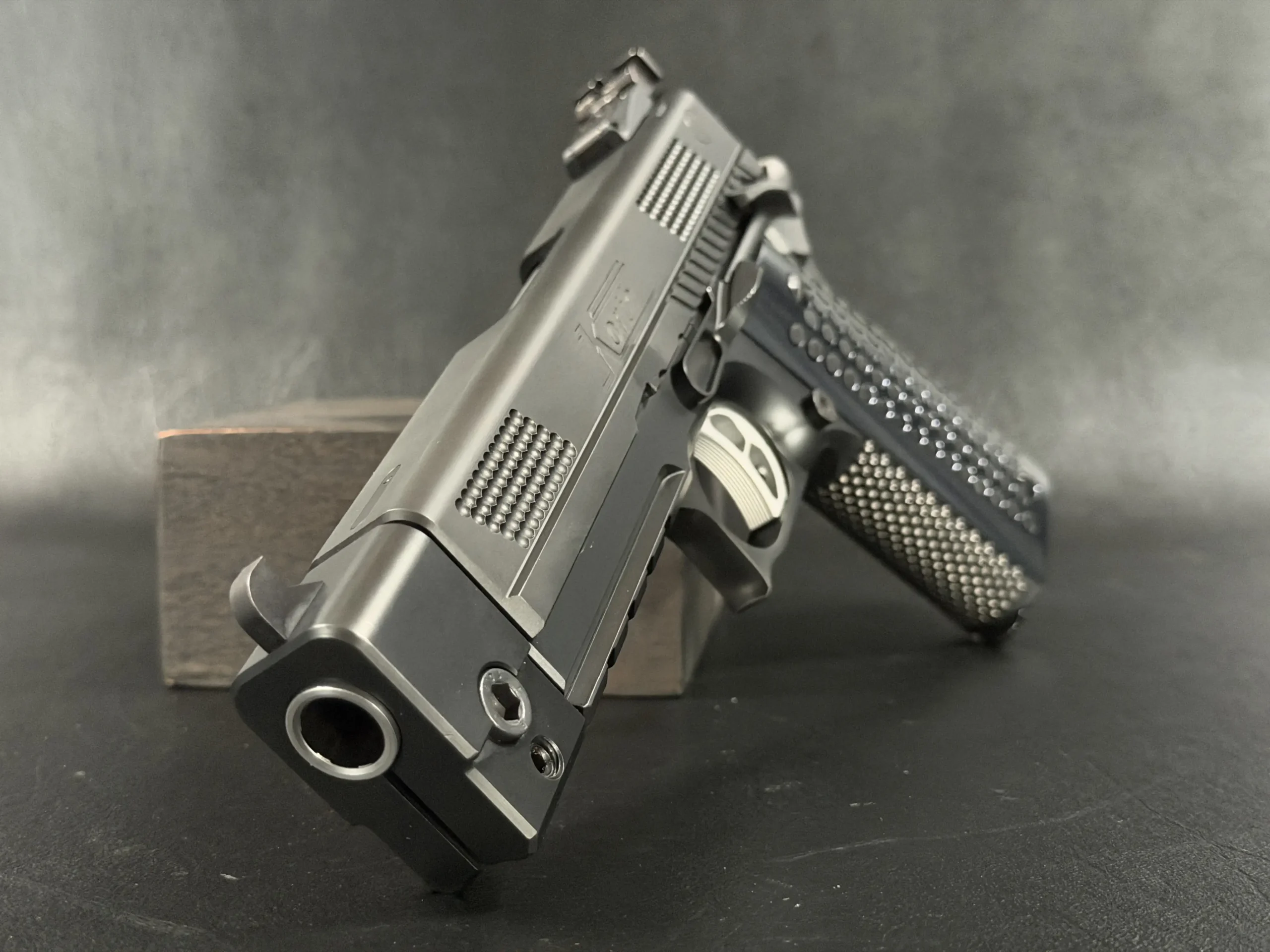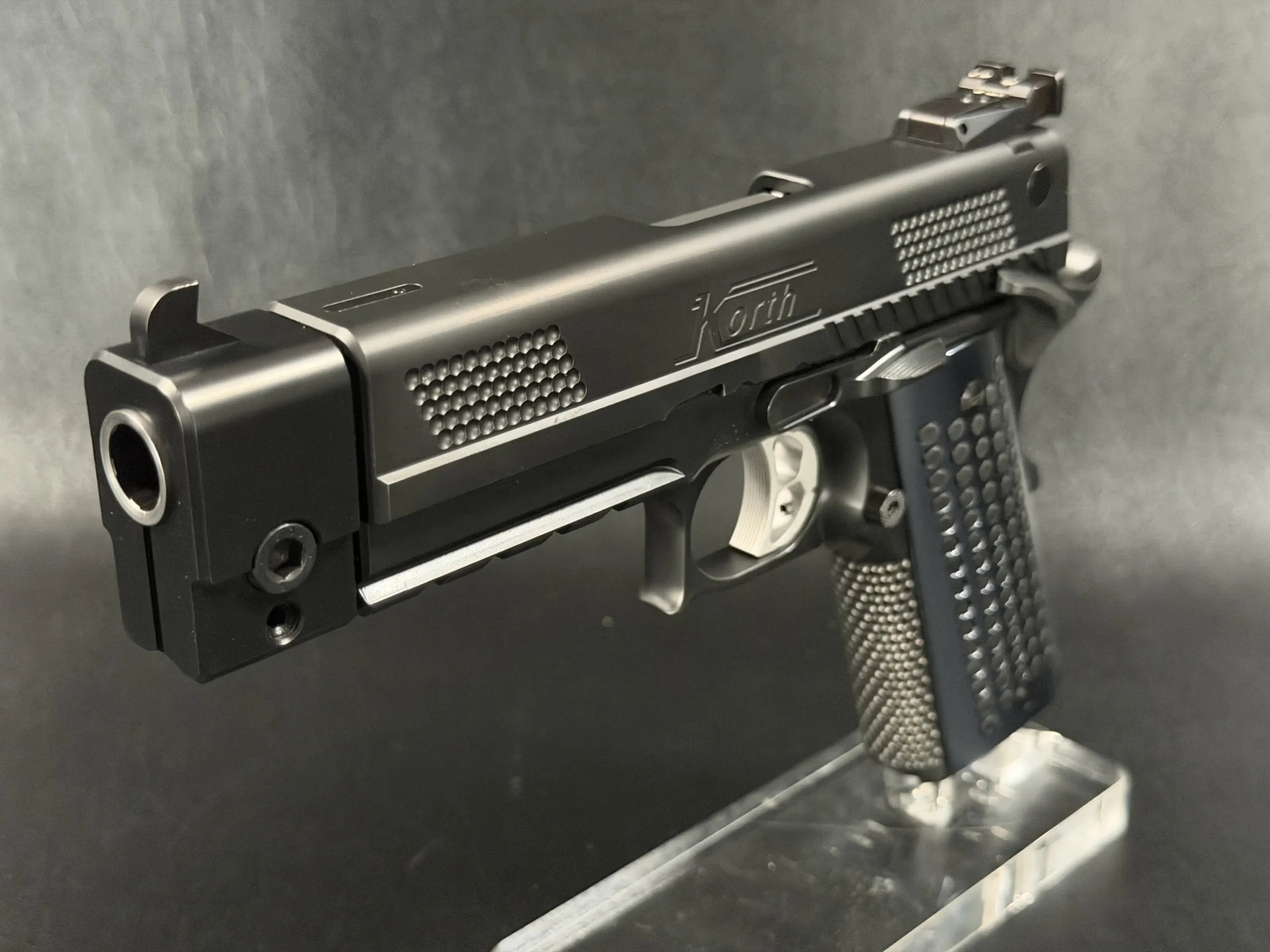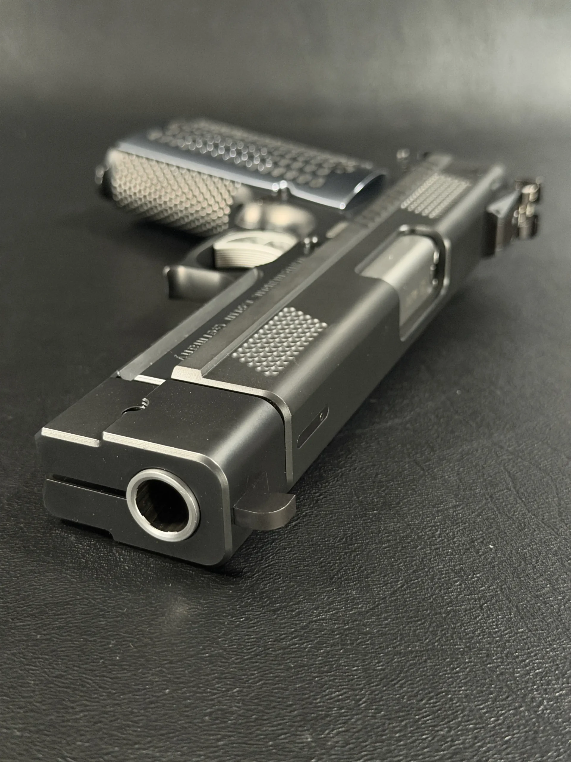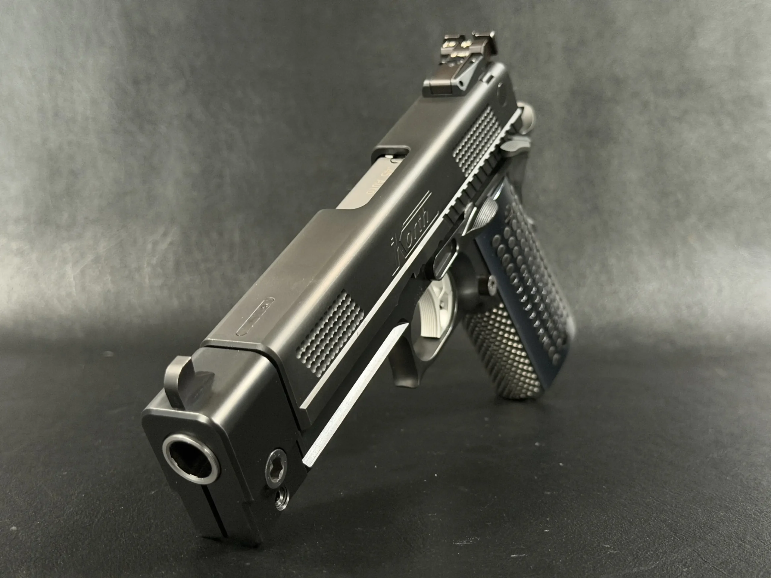 Finished in a deep black treatment, the pistol presents a cohesive, technical aesthetic that highlights Korth’s machining rather than distracting from it. The slide features Korth’s signature hemispherical texturing at the front and rear, providing both visual balance and functional grip without resorting to aggressive serrations. The integrated barrel weight system reinforces the PRS’s competition pedigree, contributing to exceptional recoil control and balance.