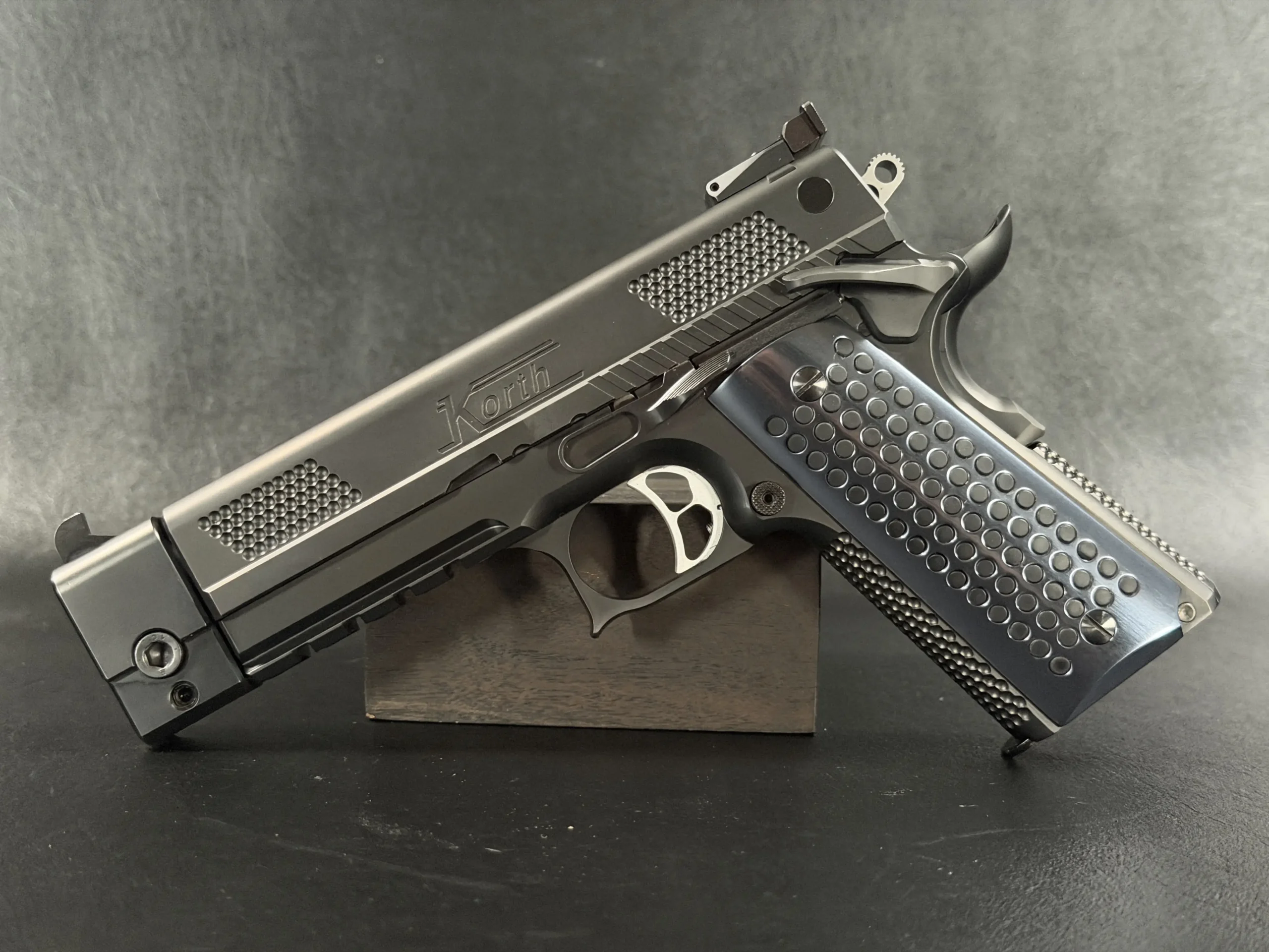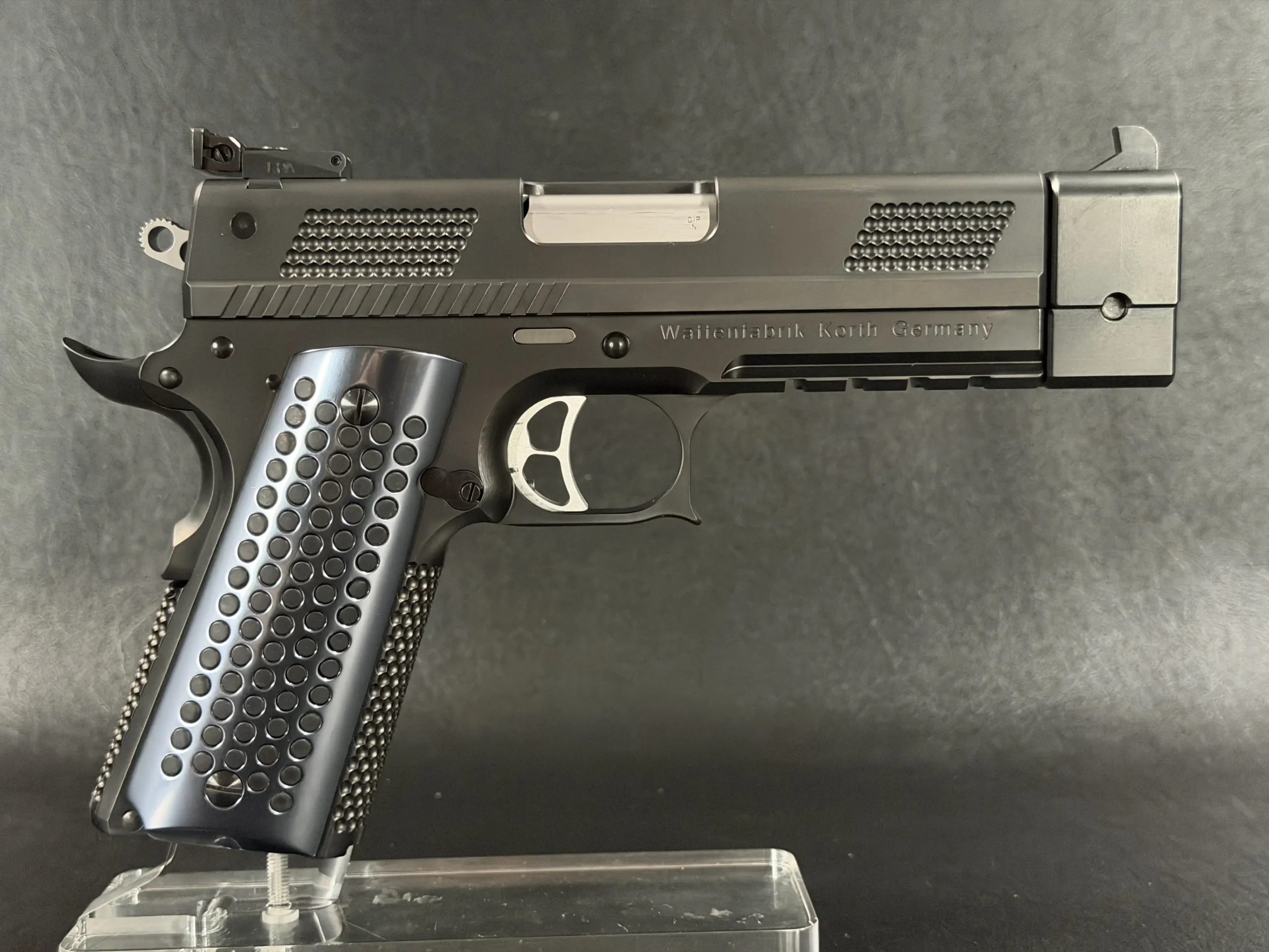 Fitted with Korth’s distinctive textured grips, the pistol offers a secure, tactile interface while maintaining a clean, modern appearance. All numbered components are factory-matched, underscoring the integrity of the build and Korth’s commitment to precision assembly.