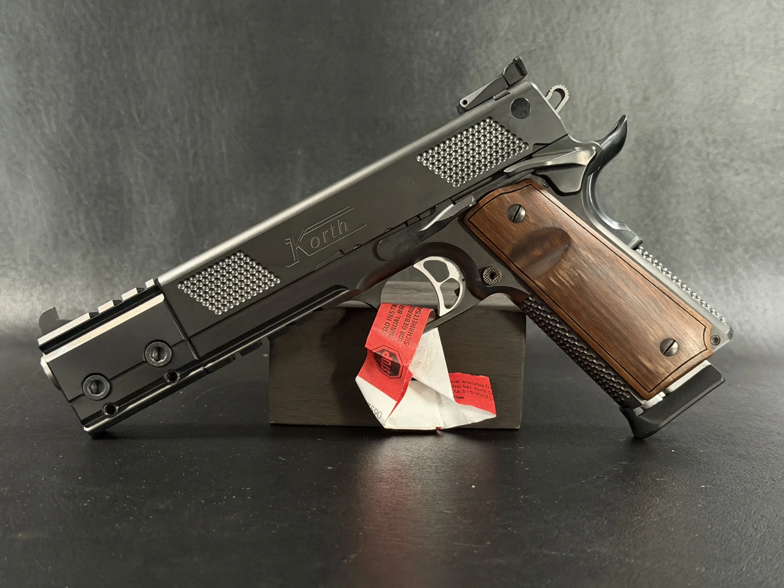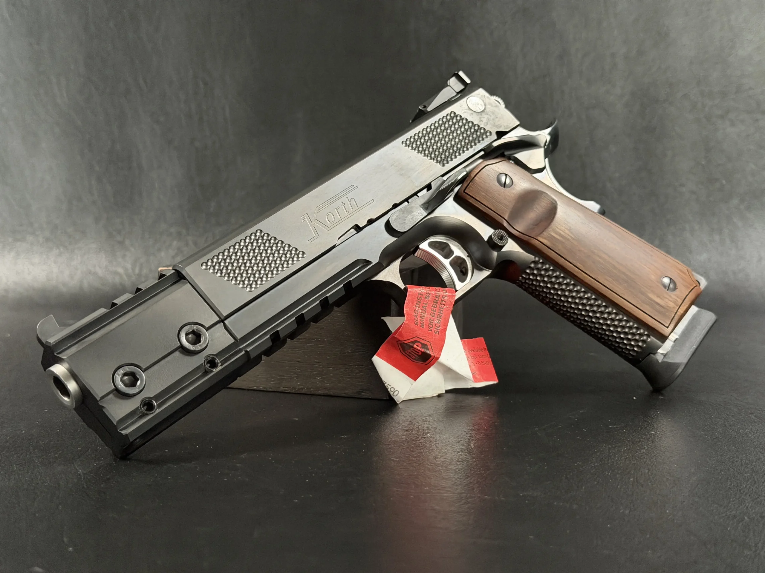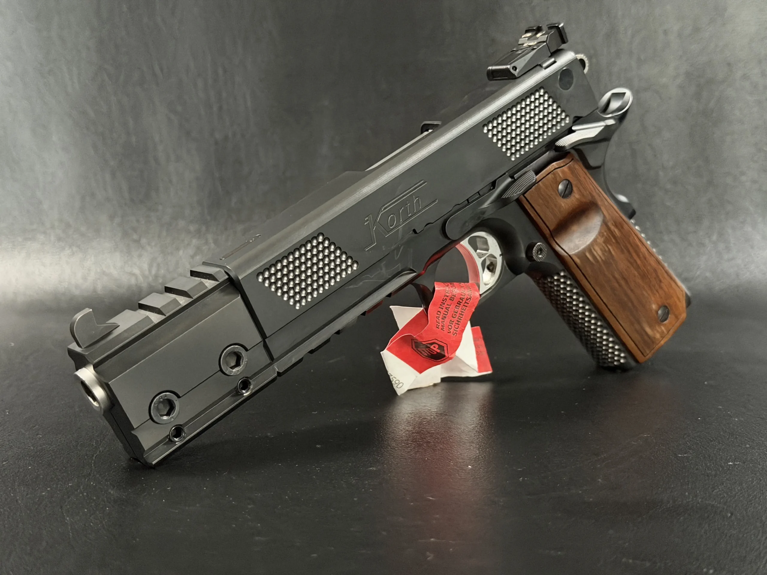 The Korth PRS Black 6 Inch stands as one of the most distinctive and technically advanced semi-automatic pistols ever produced by Waffenfabrik Korth. Built around the familiar ergonomics of a 1911-style platform but elevated through Korth’s uncompromising machining standards, this pistol blends competition-grade precision with the kind of severe industrial aesthetic only Korth can achieve.