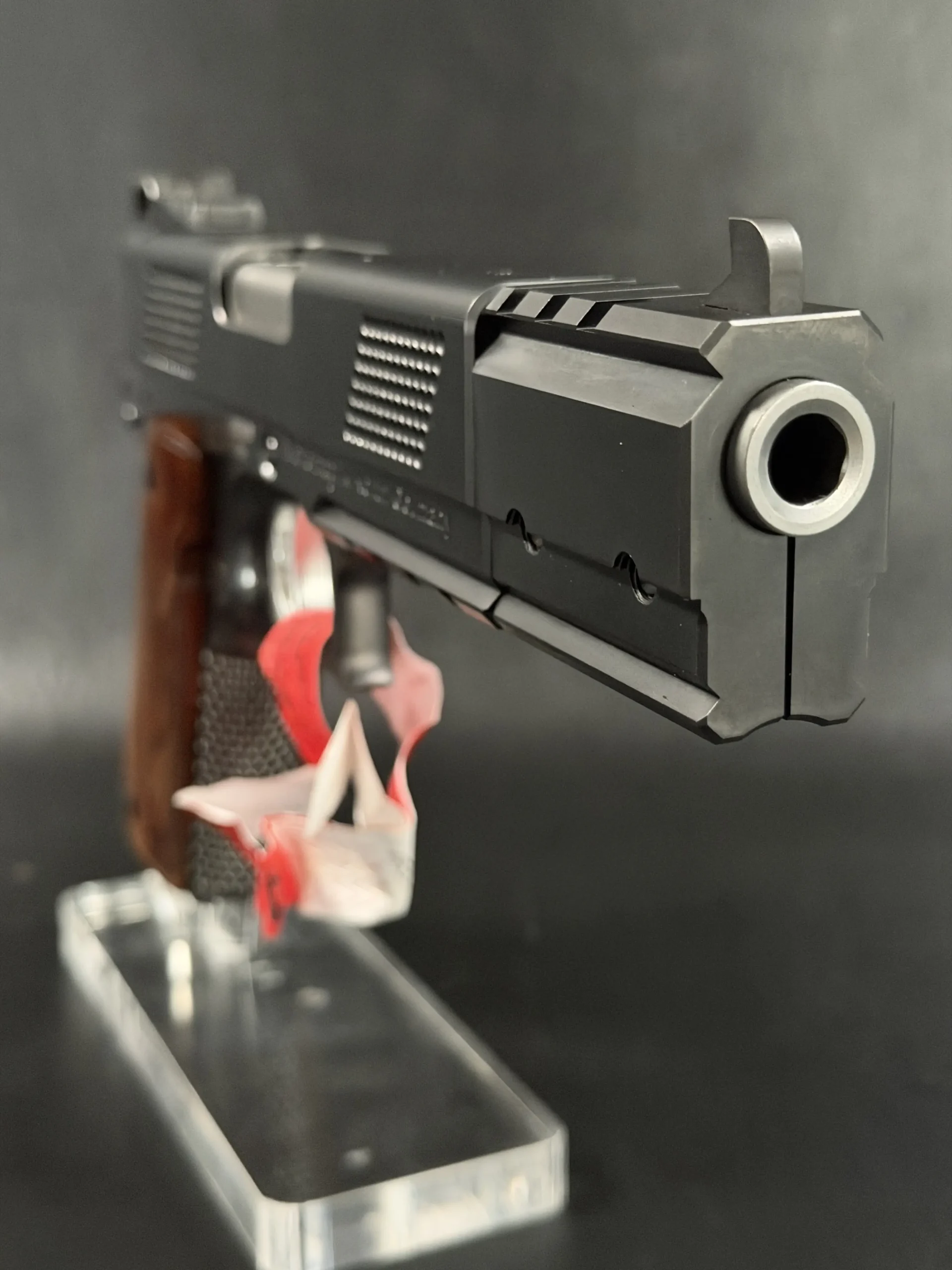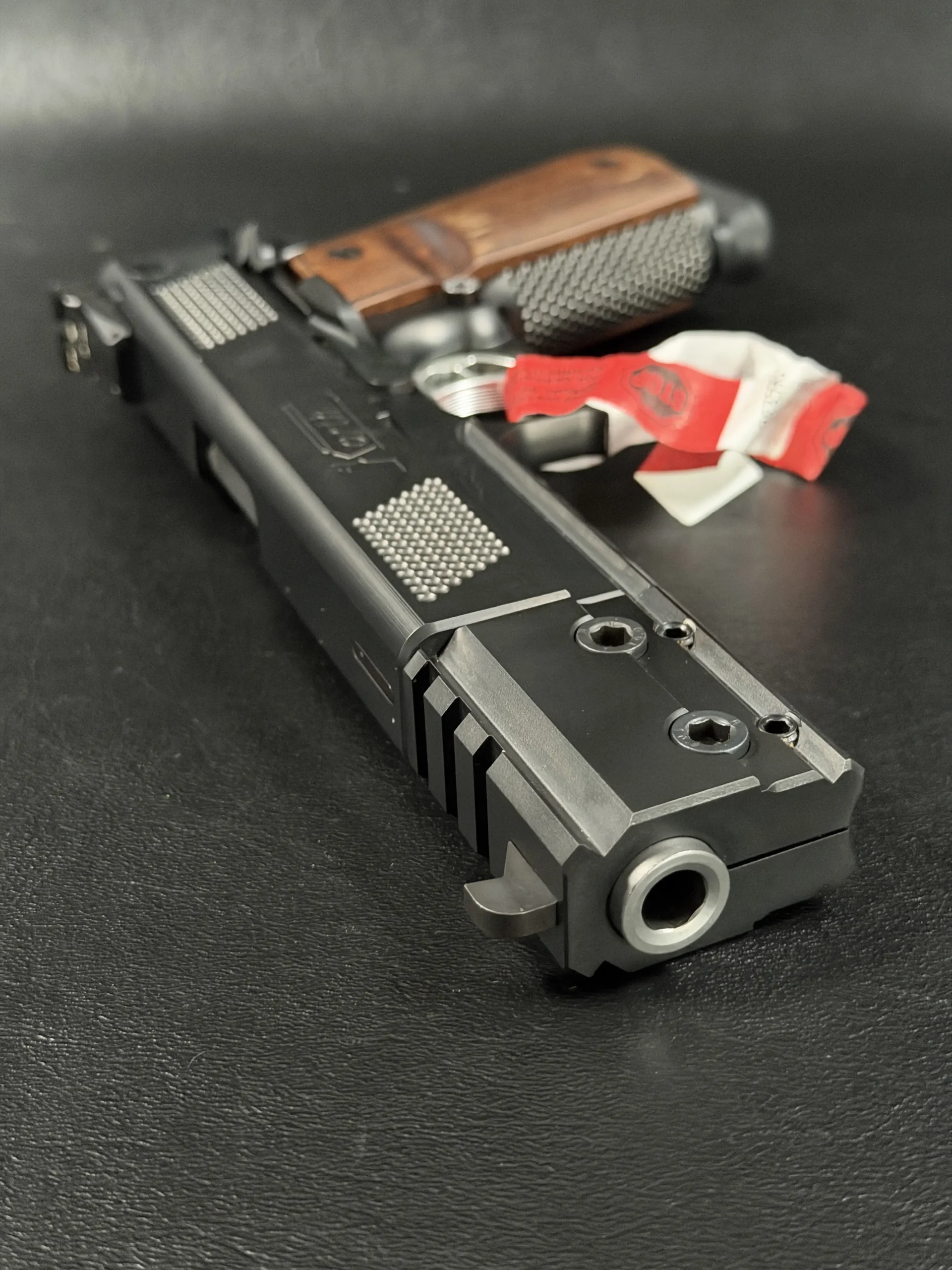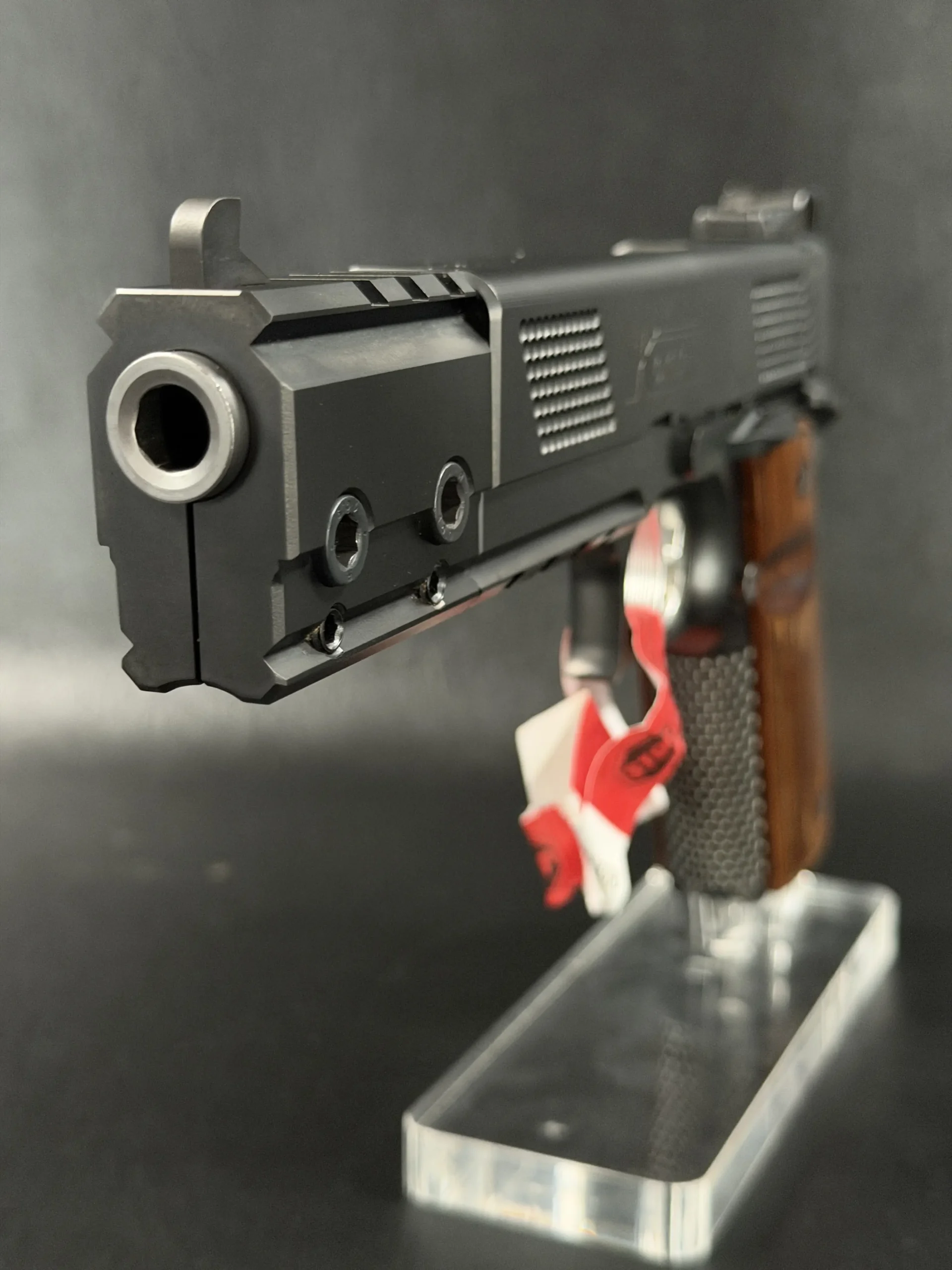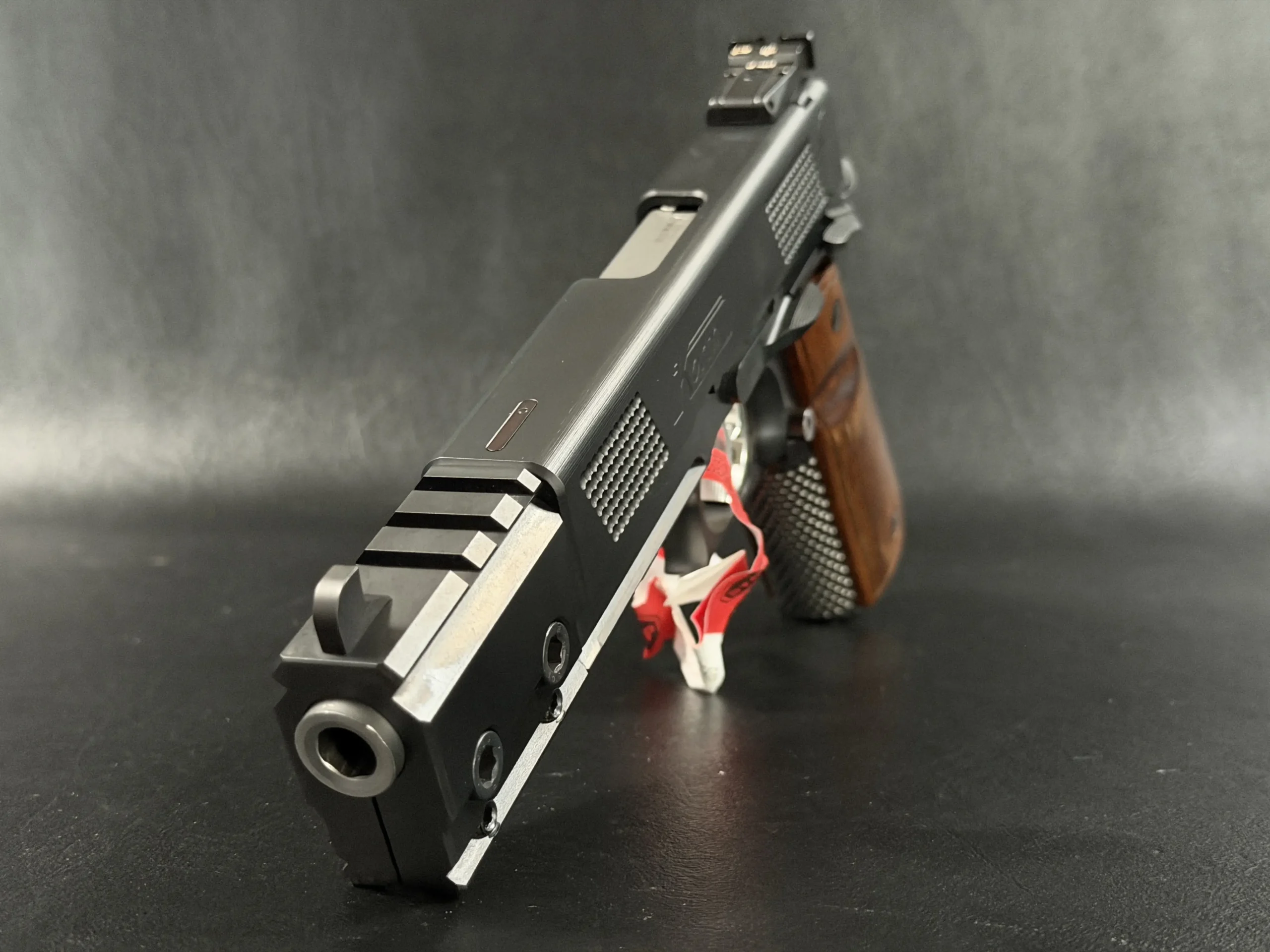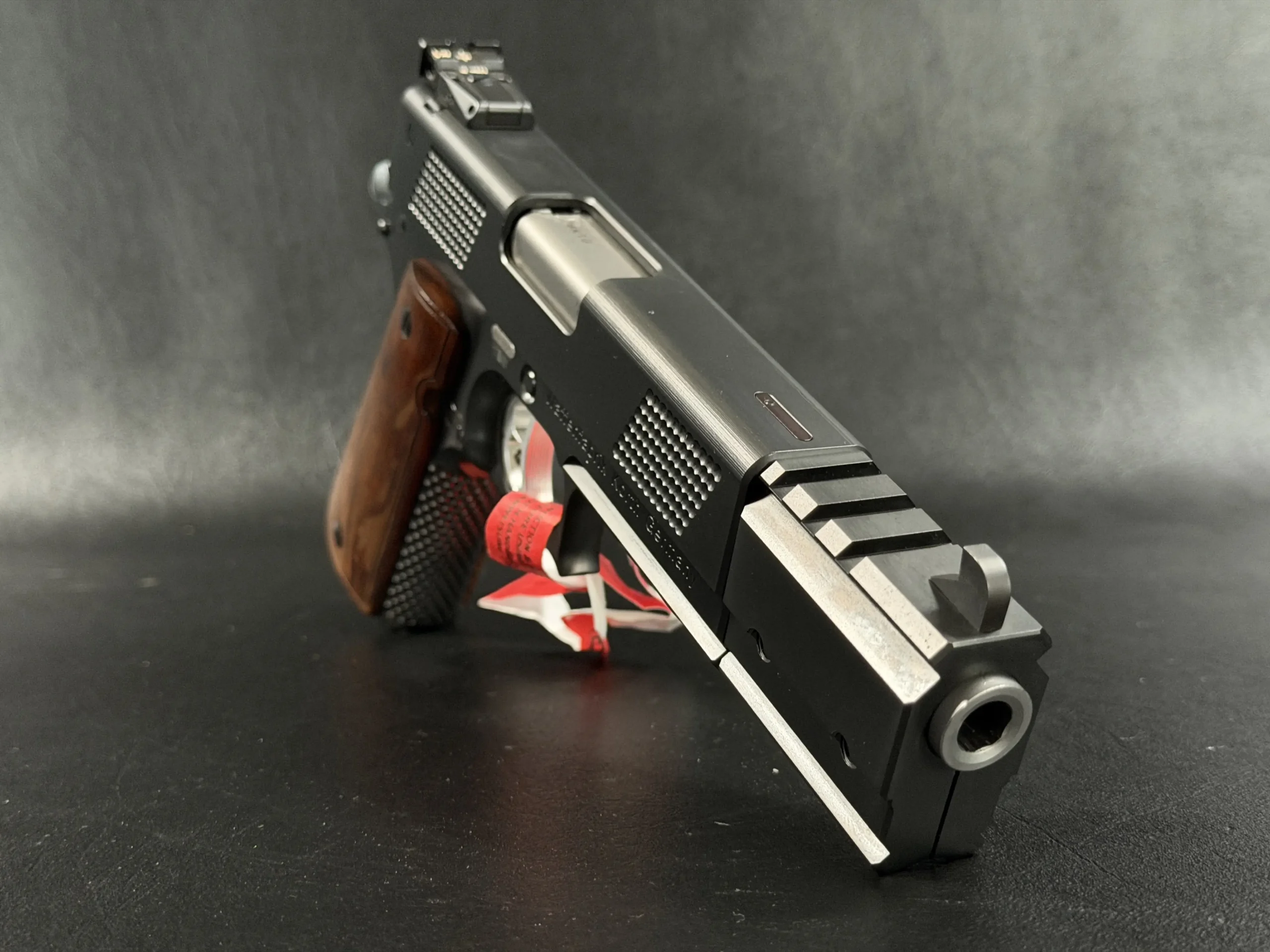 The extended 6-inch barrel and signature compensated front-end module give the pistol an unmistakable presence—long, angular, and purposeful. Every control surface is sharply executed, from the meticulously cut checkering to the clean, brushed-steel flats. The contrasting black and stainless components create a modern two-tone effect, amplified further by the deep-grained wood grips that bring warmth to the otherwise tactical silhouette.