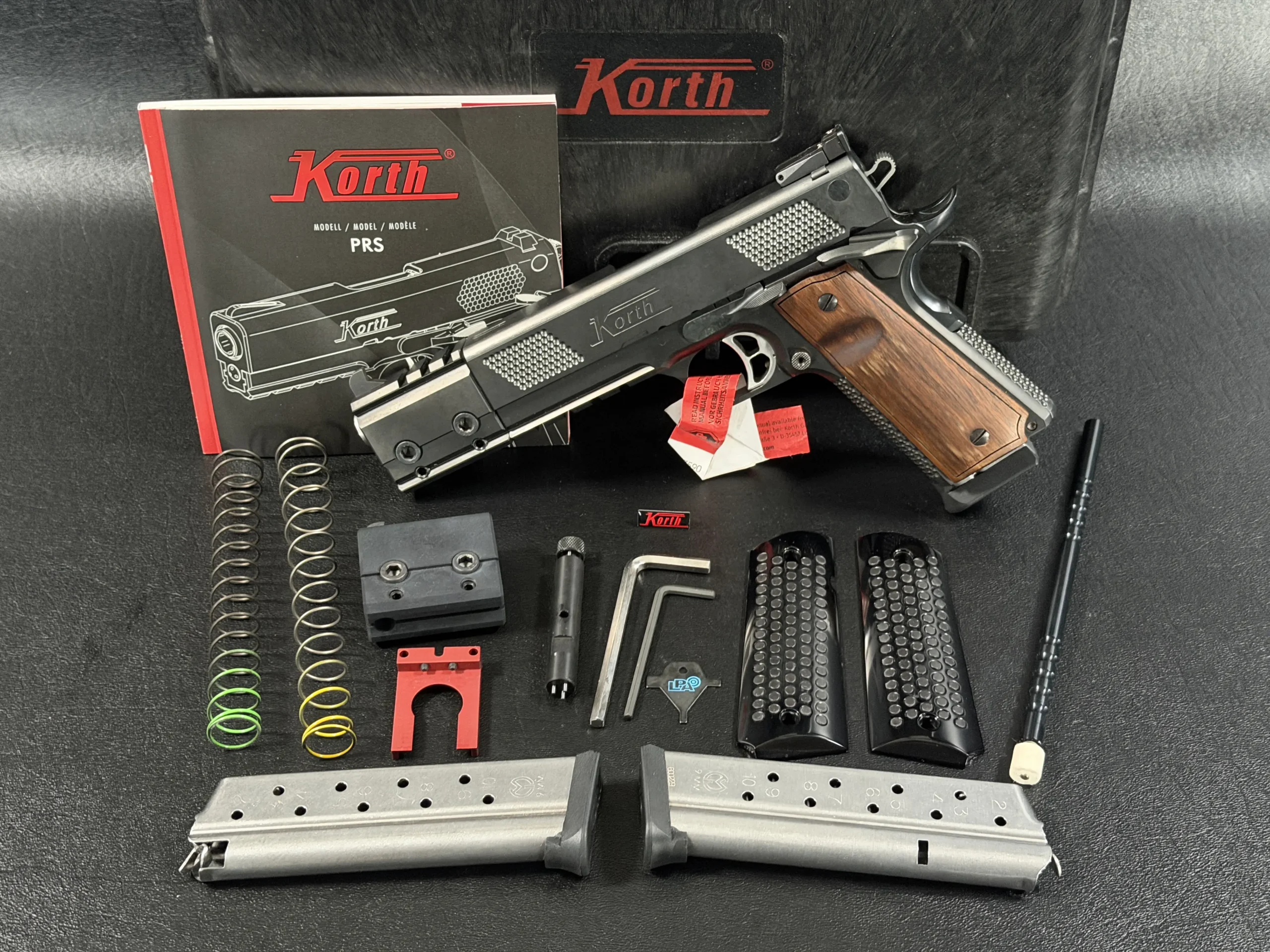 Included with the pistol is a complete factory kit: dual magazines, interchangeable grip panels, additional recoil springs, tools, optics-mounting block, and the original Korth case—everything preserved in exceptional condition.