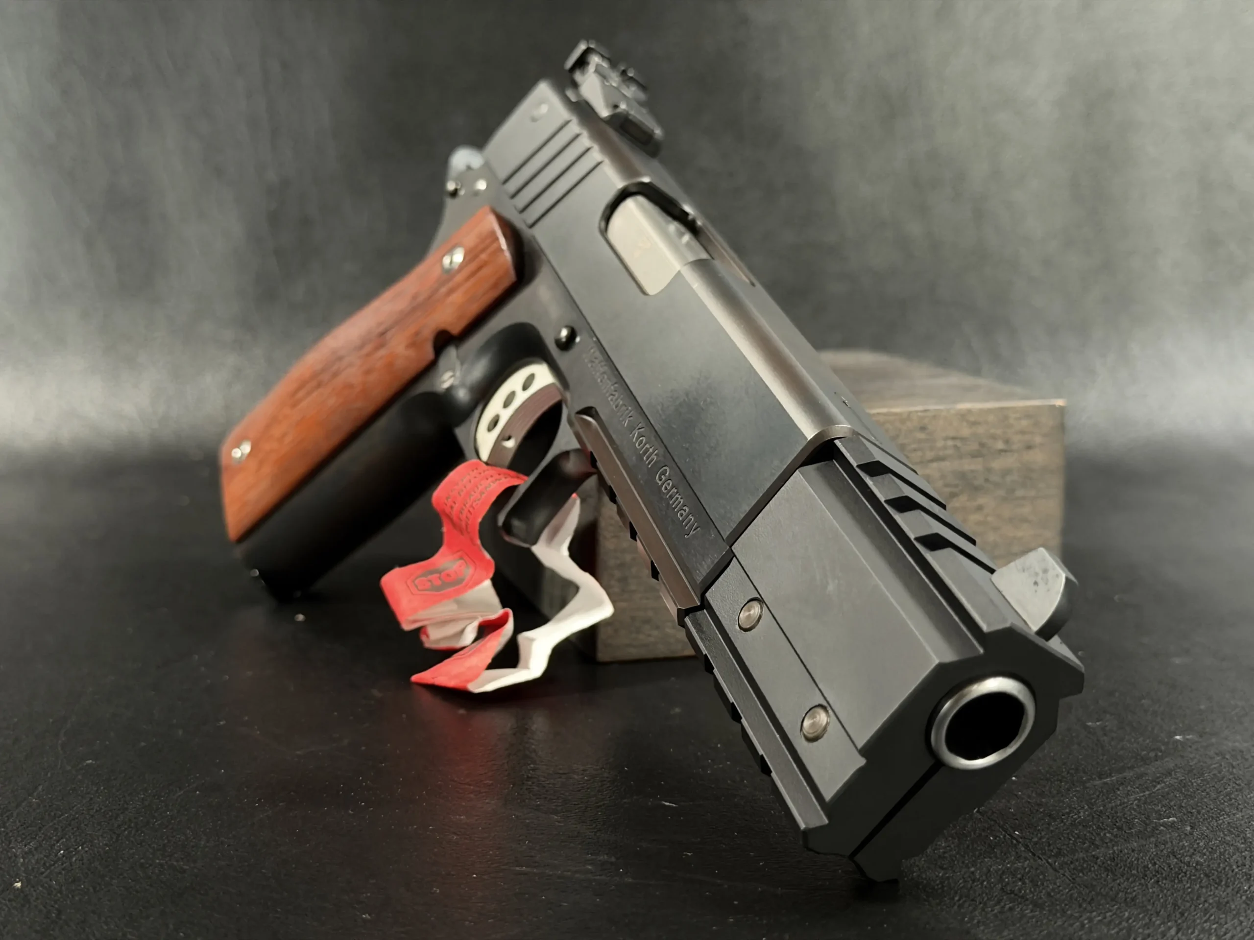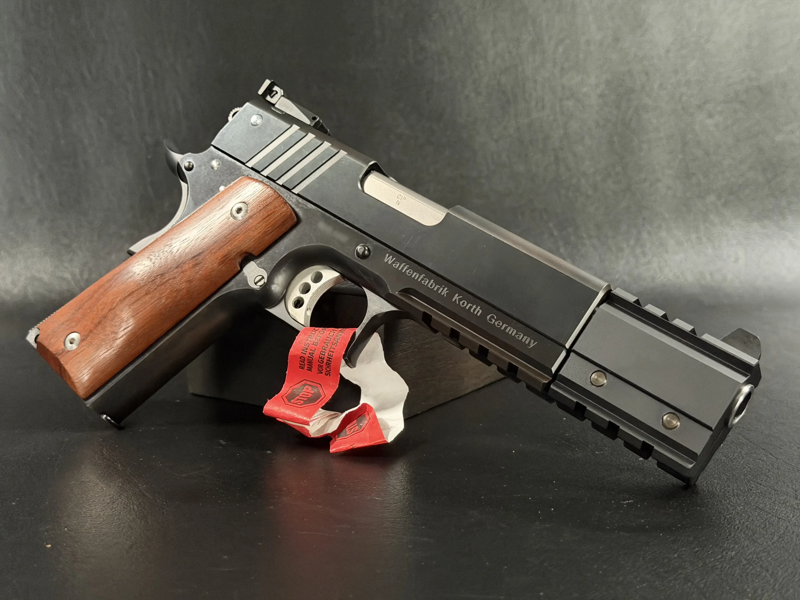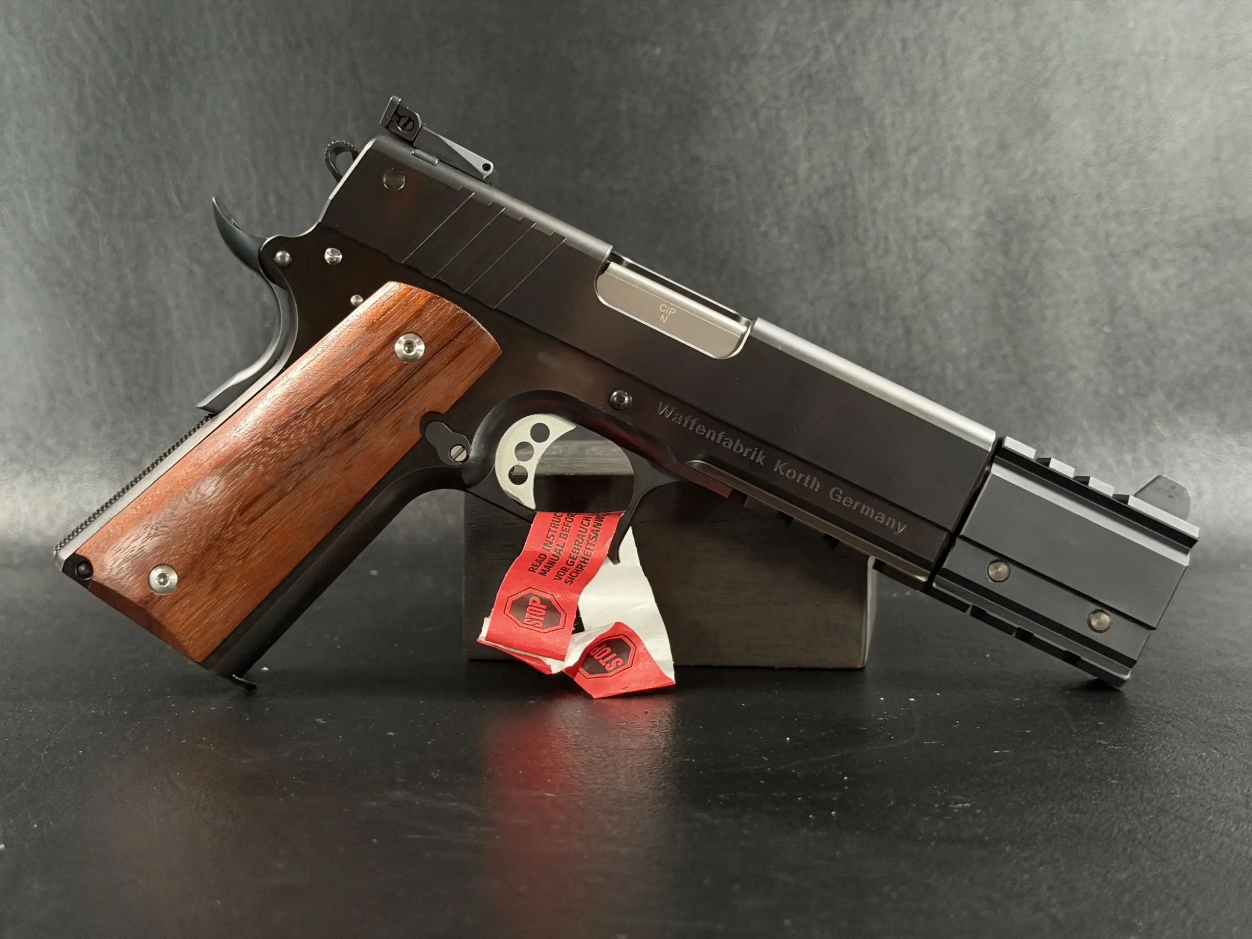 This example showcases the early PRS design at its finest. The slide wears the bold red Korth script, clean, confident, and iconic, set against a deep, polished finish that shifts beautifully under light. The extended dust-cover weight system, with its angular geometry and tool-less modularity, anchors the pistol visually while enhancing balance during slow, deliberate trigger work. It’s a competition-forward architecture, but it retains the elegance and mechanical refinement that collectors expect from Korth’s hand-built lineage.
