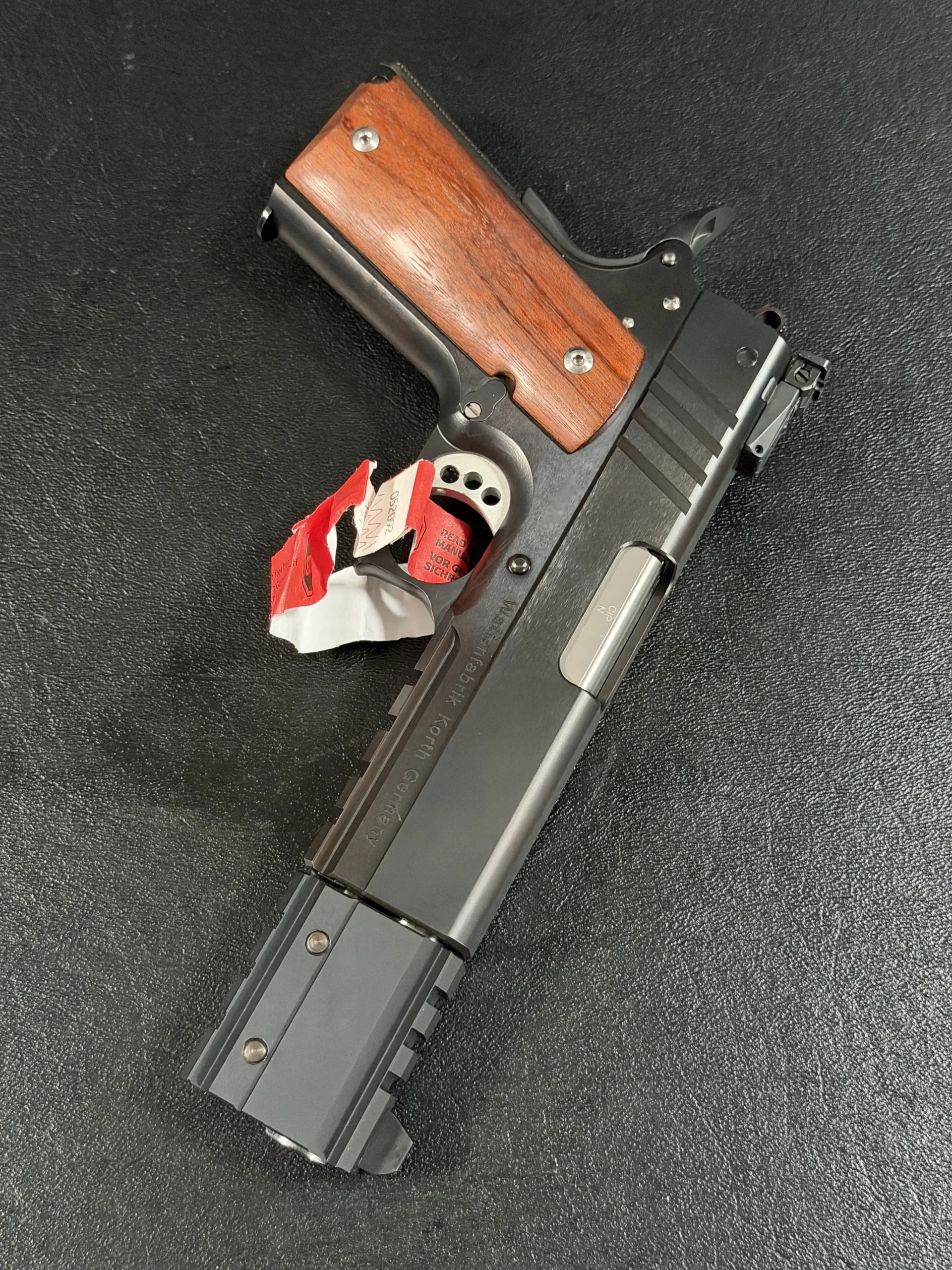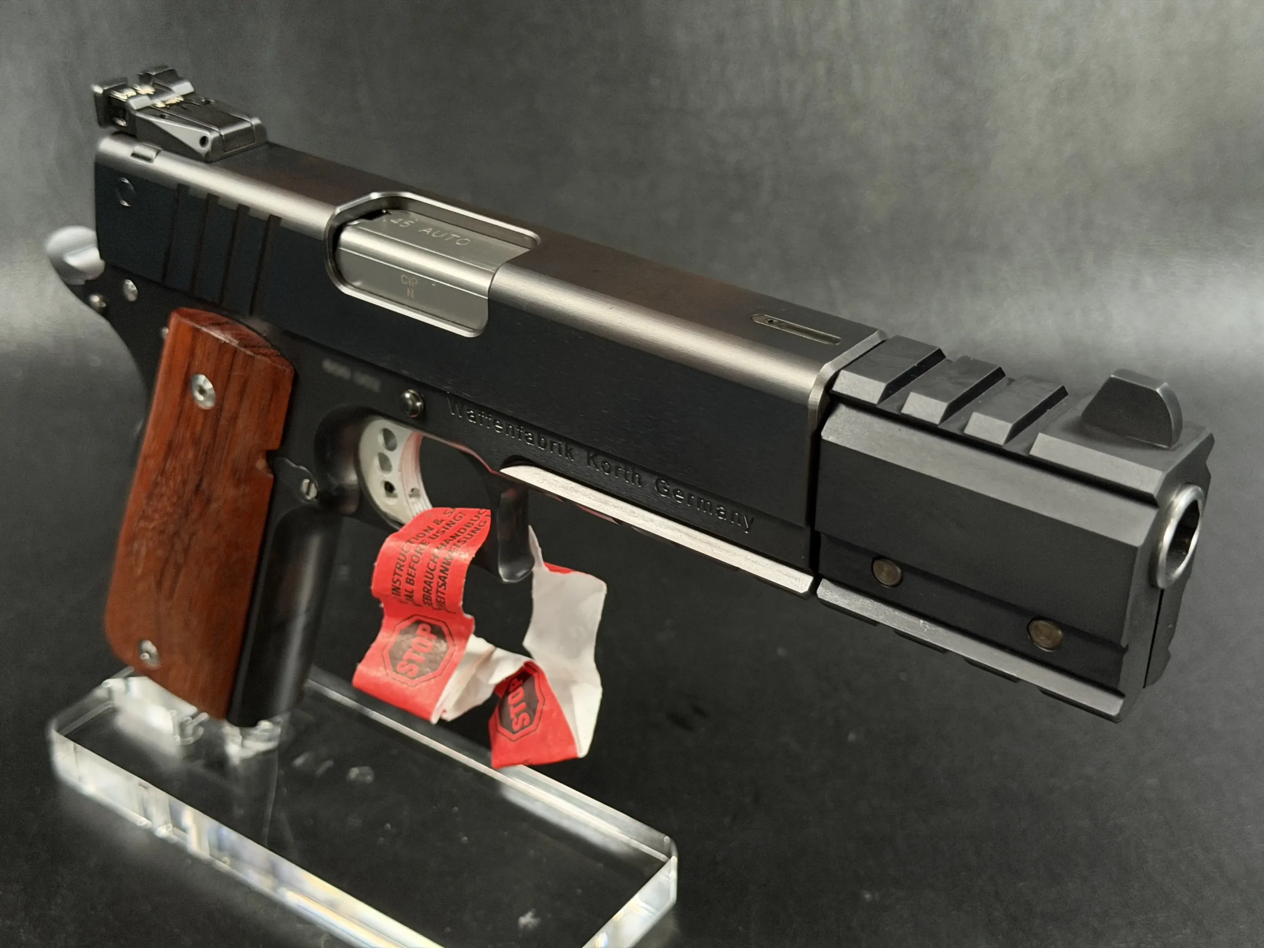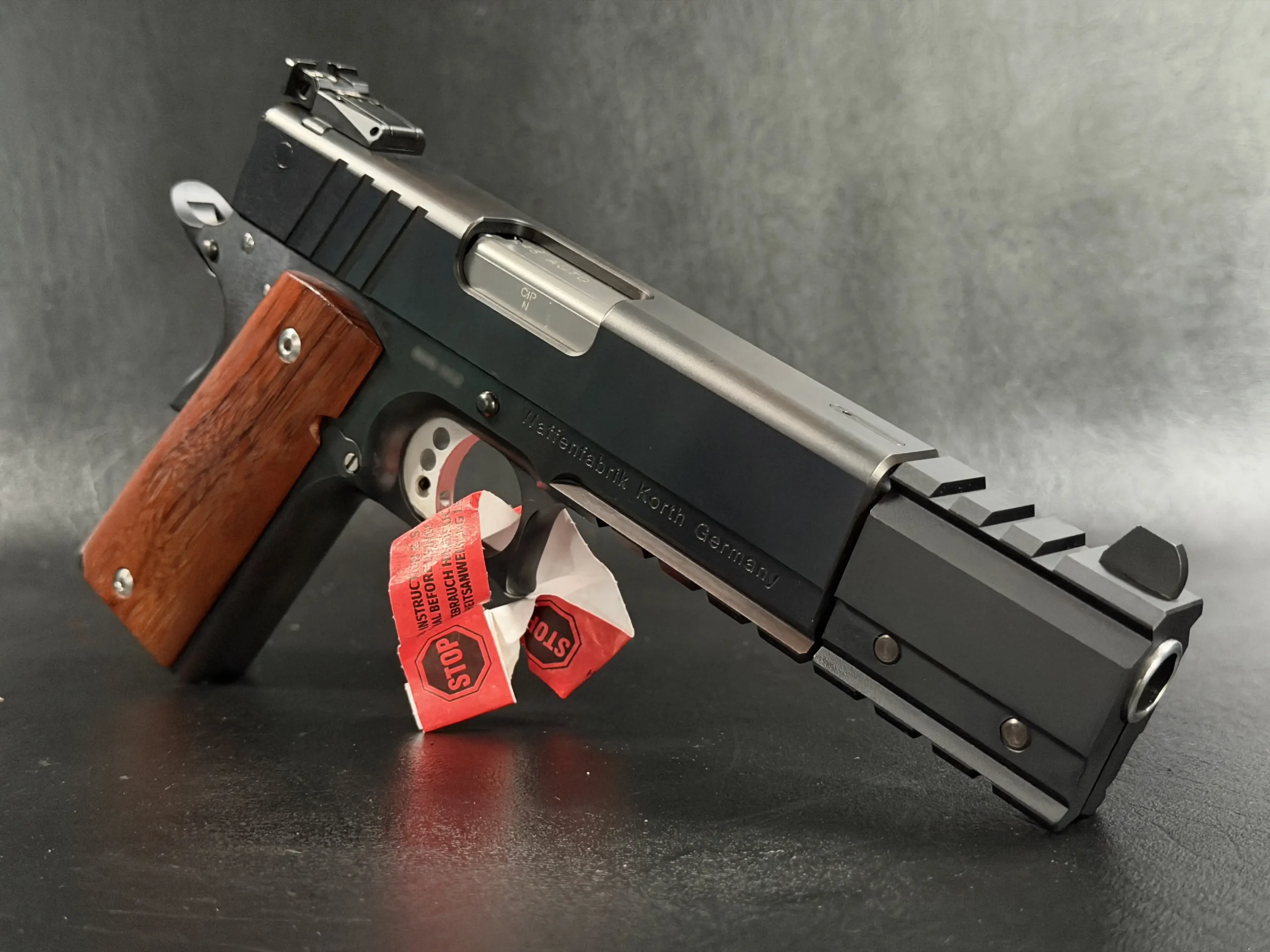 This example showcases the early PRS design at its finest. The slide wears the bold red Korth script, clean, confident, and iconic, set against a deep, polished finish that shifts beautifully under light. The extended dust-cover weight system, with its angular geometry and tool-less modularity, anchors the pistol visually while enhancing balance during slow, deliberate trigger work. It’s a competition-forward architecture, but it retains the elegance and mechanical refinement that collectors expect from Korth’s hand-built lineage.