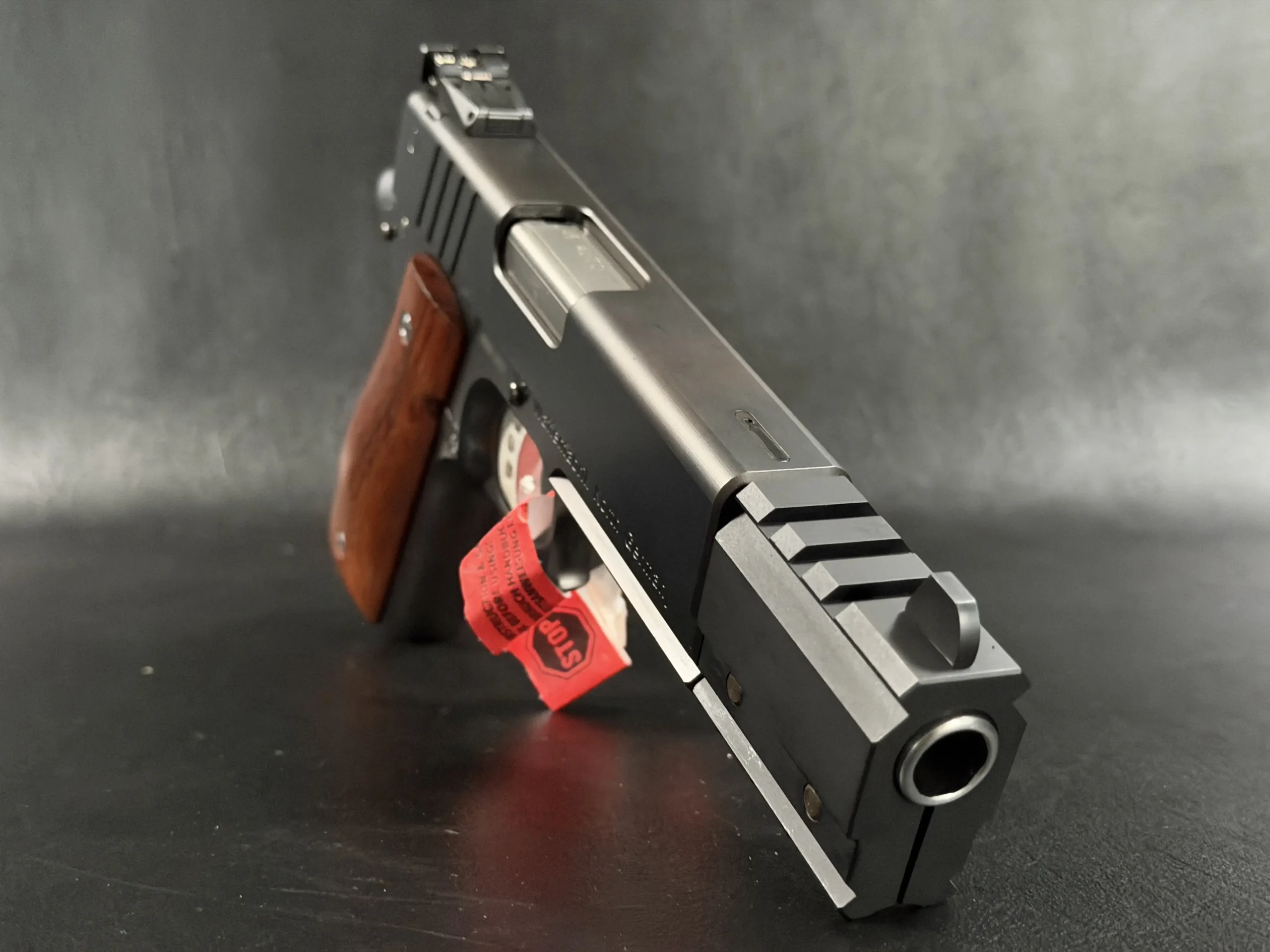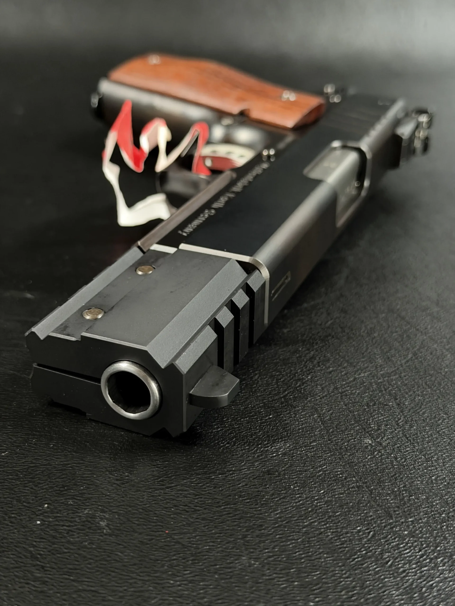 The walnut grips introduce warmth to the otherwise modern silhouette, grounding the pistol with a classic texture and profile. Every control surface, the skeletonized trigger, ambidextrous safety, hammer contour, and slide serrations, has been shaped for both function and aesthetics, nothing added without purpose.