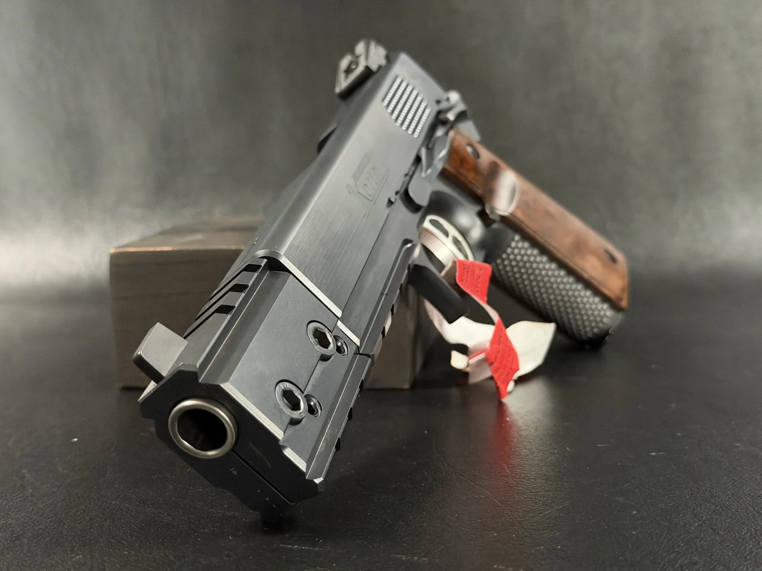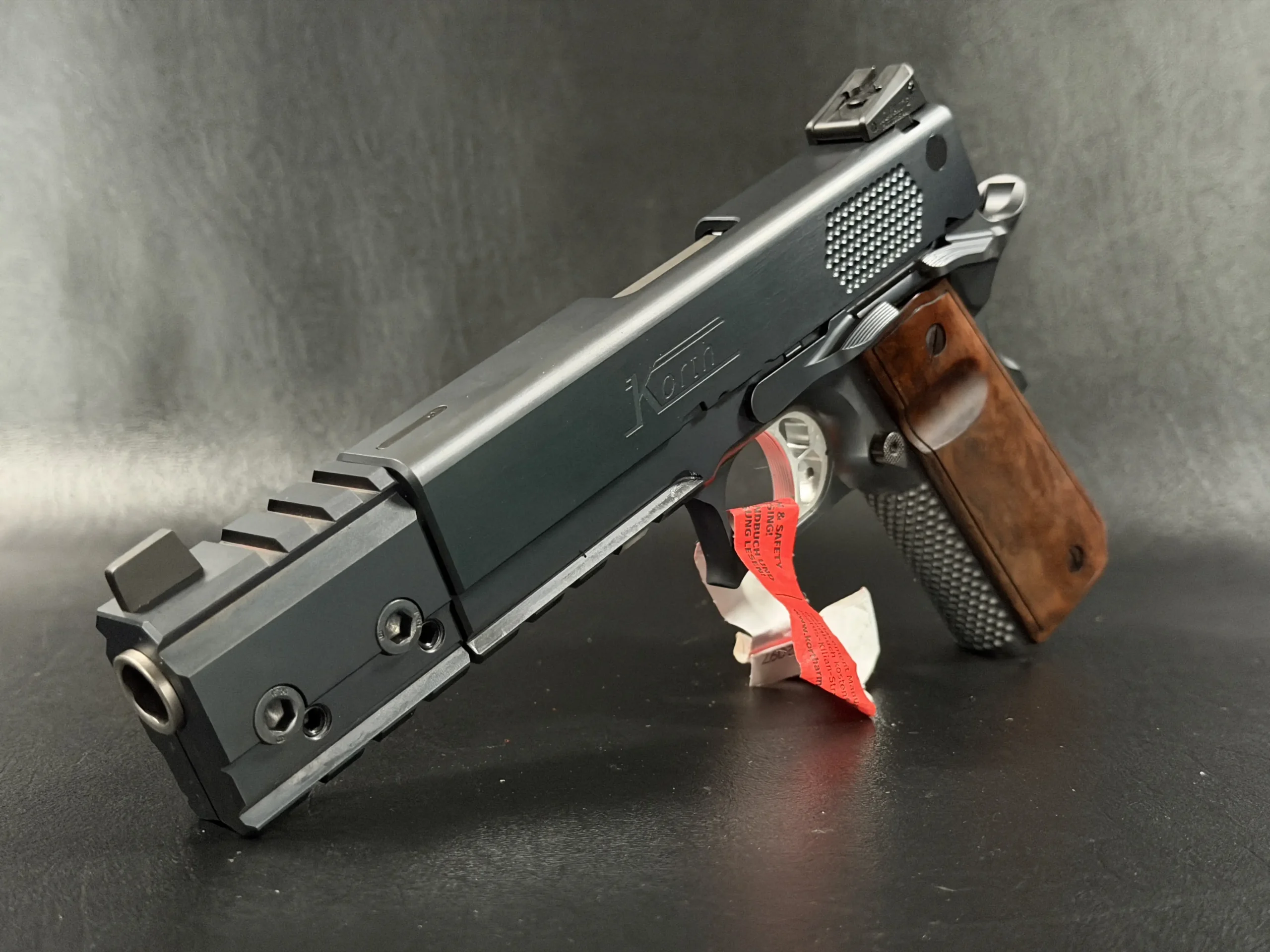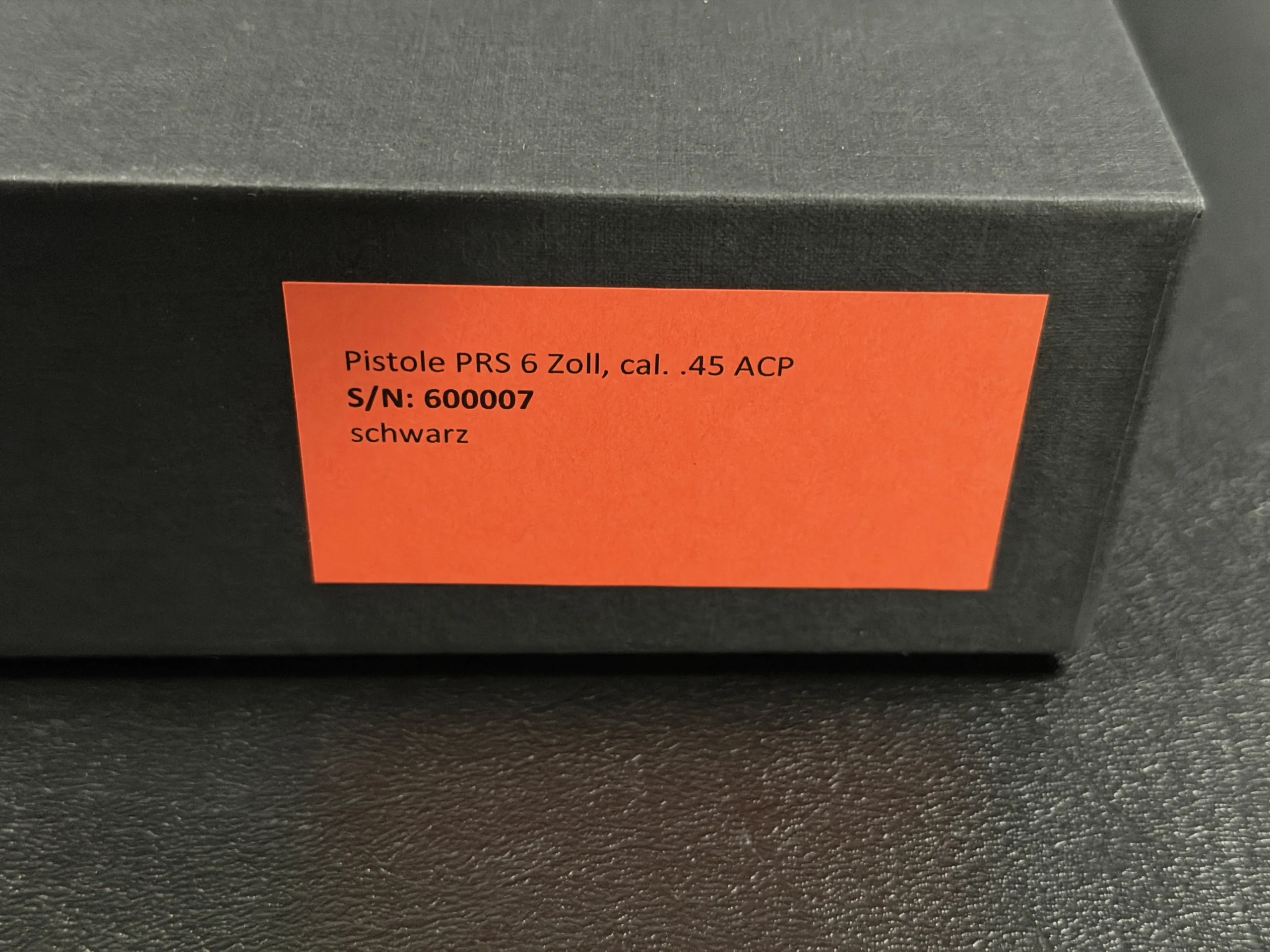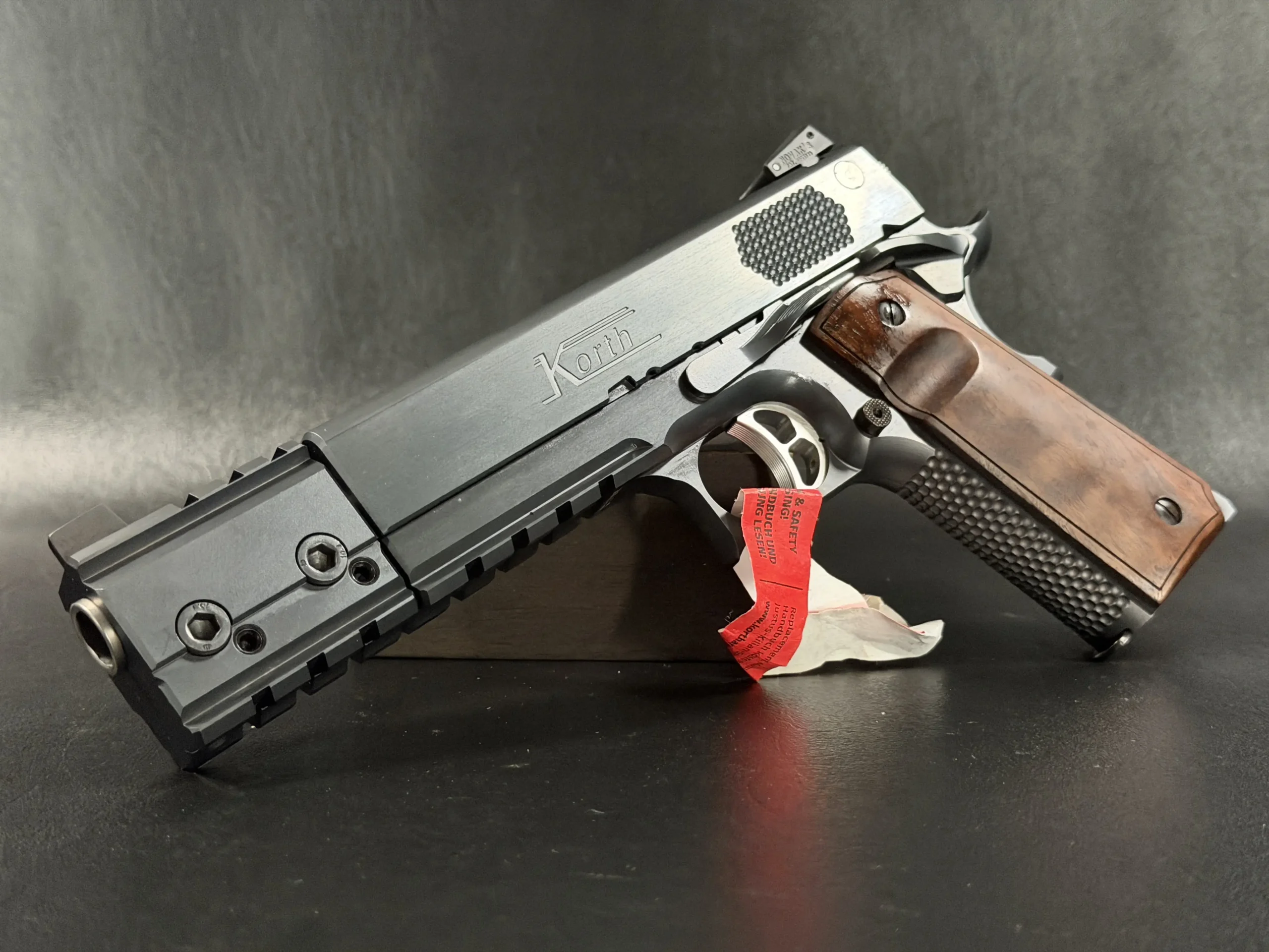 Finished in a deep, mirror-sheened steel that feels almost sculptural in hand, the PRS stands apart from anything else in the modern 1911-inspired world. Its extended 6-inch barrel and massive front weight give the pistol a uniquely balanced profile—purpose-built for stability, recoil control, and absolute visual presence. Every surface is sharply defined, every edge deliberate, every interface engineered with Korth’s signature obsession for detail.
