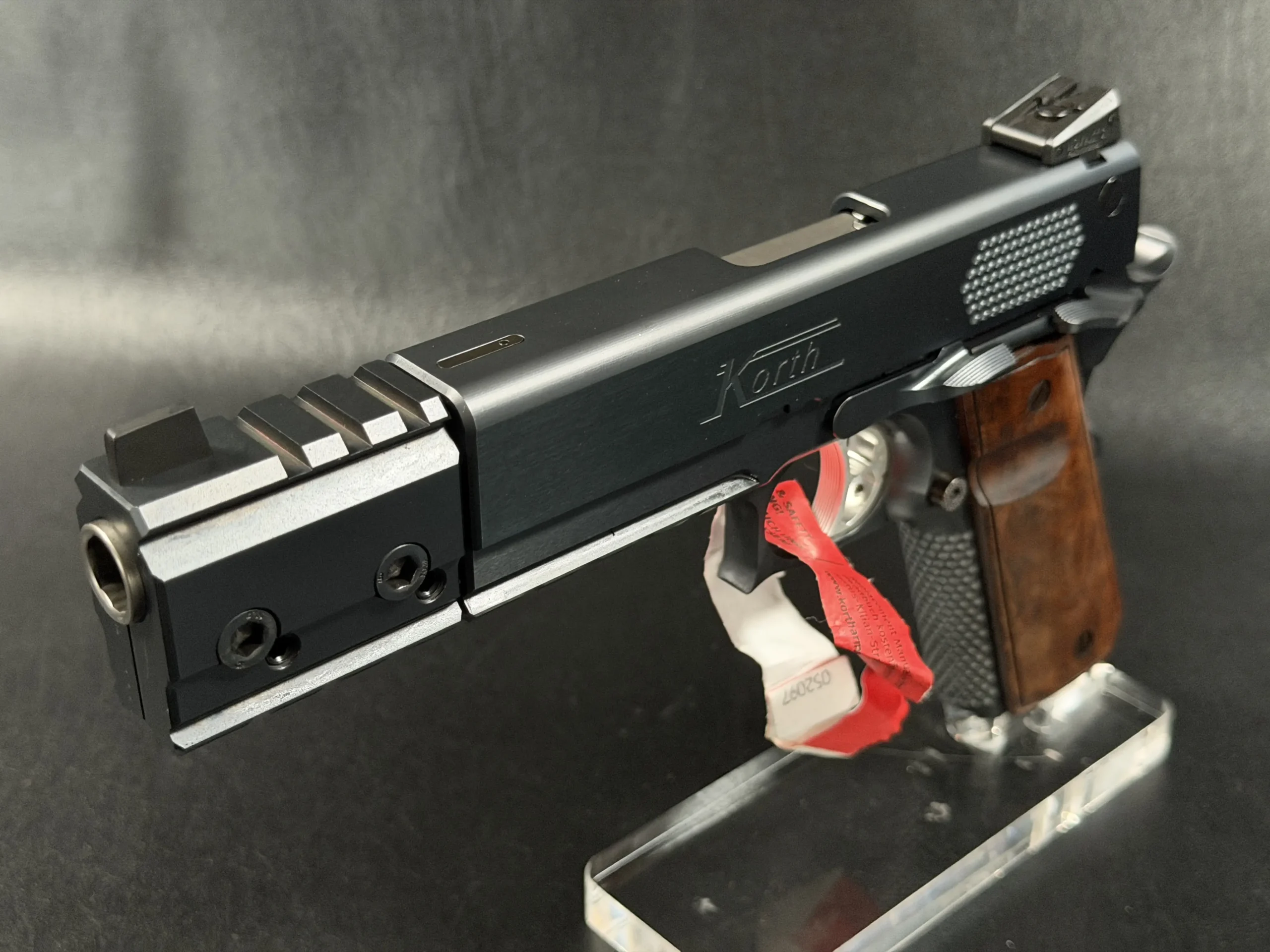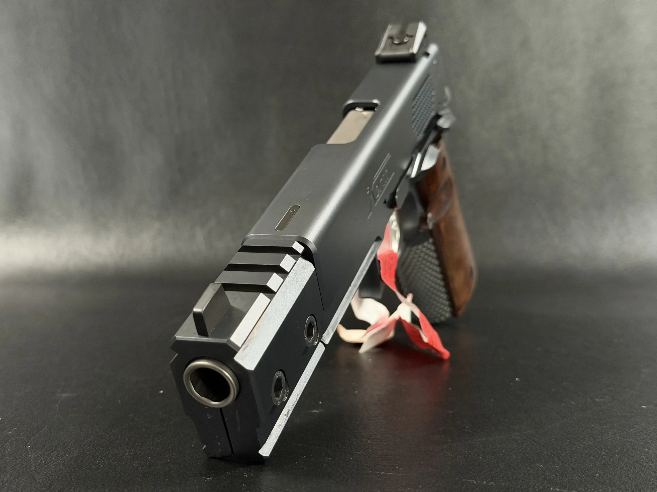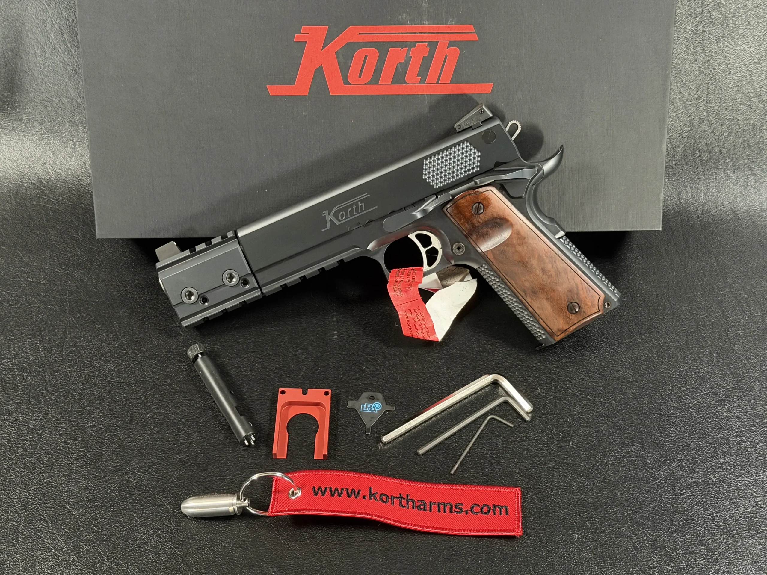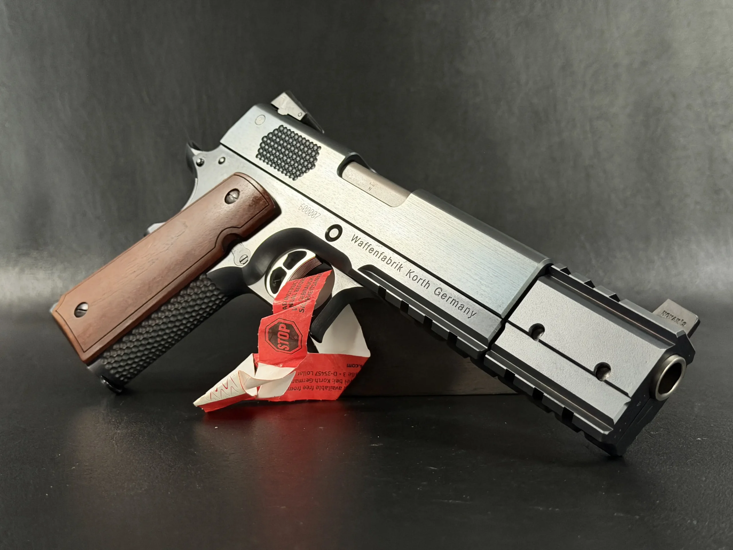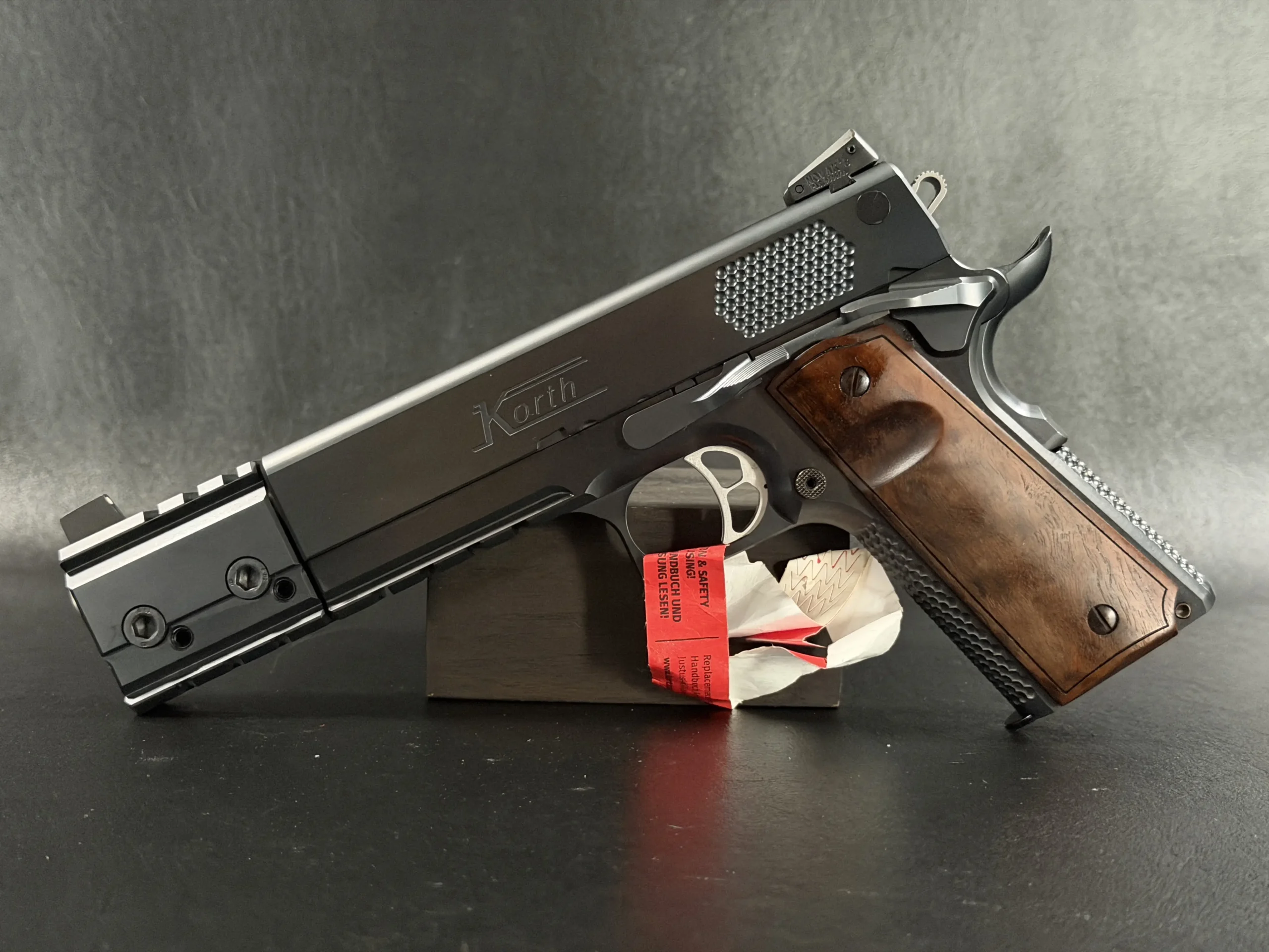 Classic wood grips complete the look, offering a warm contrast to the high-polish finish and a distinctly old-world touch that sets this pistol apart from typical competition builds. The machining on the frame and slide is crisp and authoritative, with checkering and serrations executed to the standard Korth is known for: overbuilt, exacting, and unmistakably German.