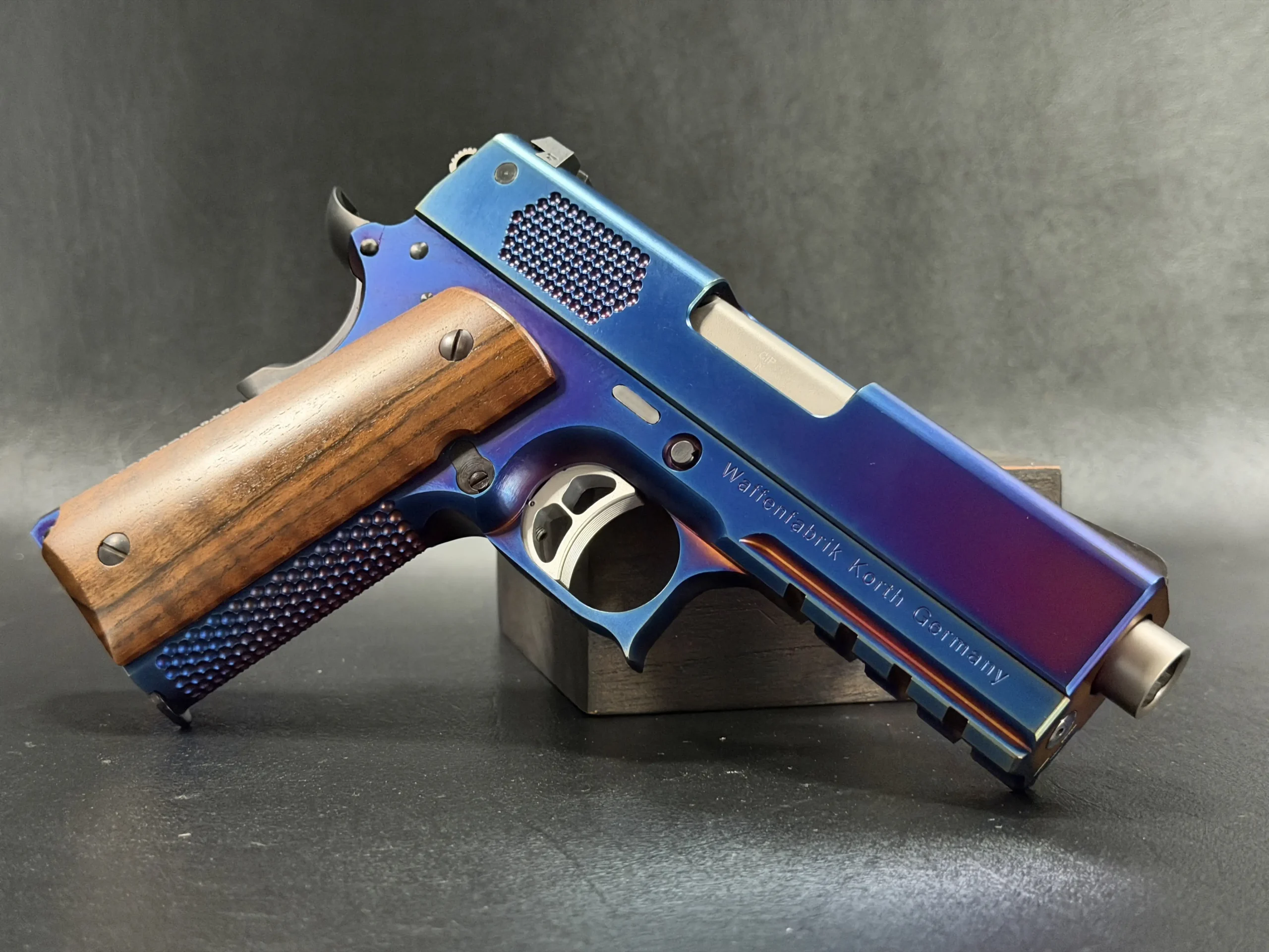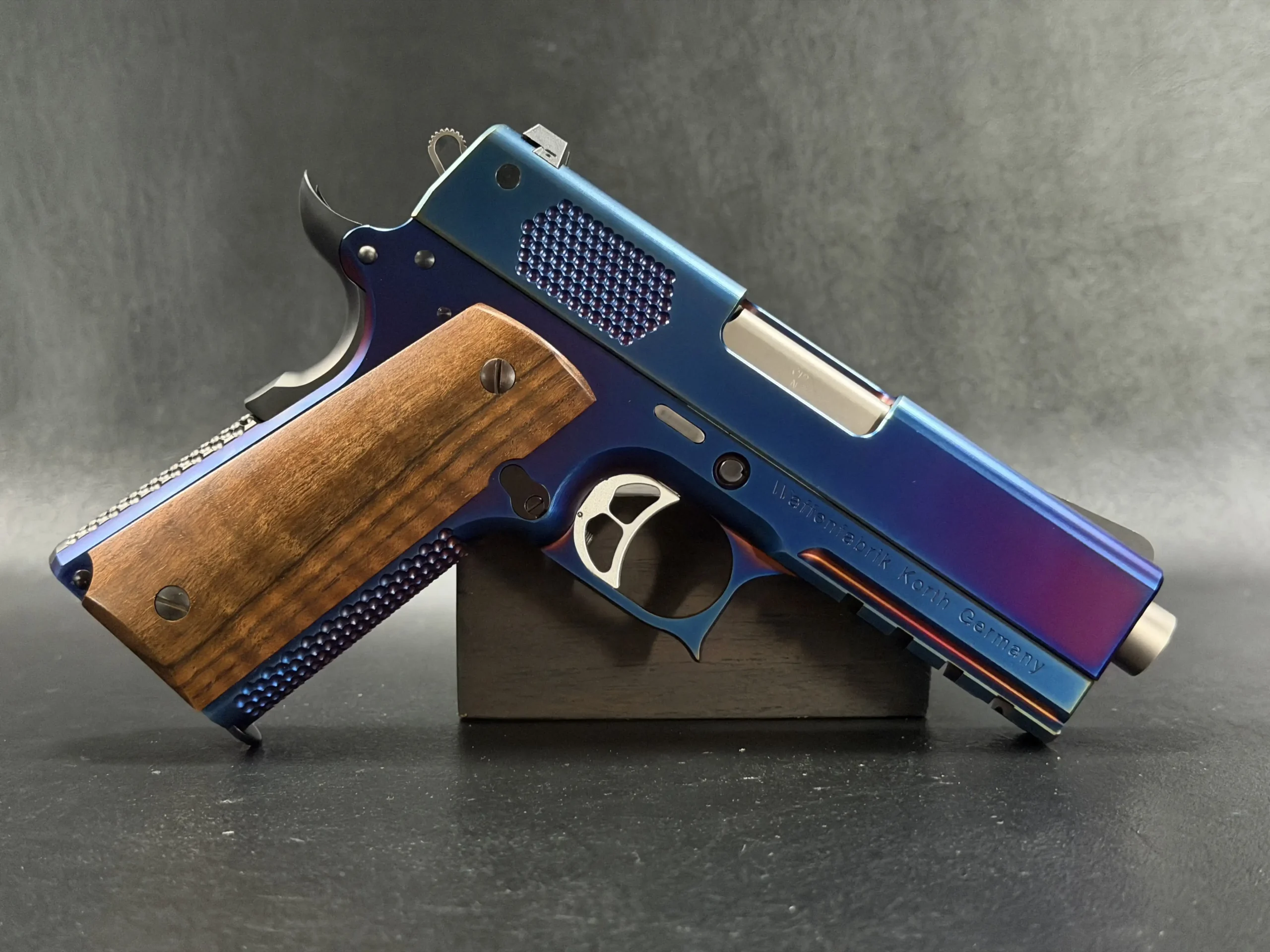 Every surface shows the unmistakable handwork that defines Korth’s reputation: immaculate machining, perfect edges, and a level of fit that feels sculpted rather than assembled. The richly grained wooden grips add a warm organic contrast, grounding the futuristic finish with classic craftsmanship.