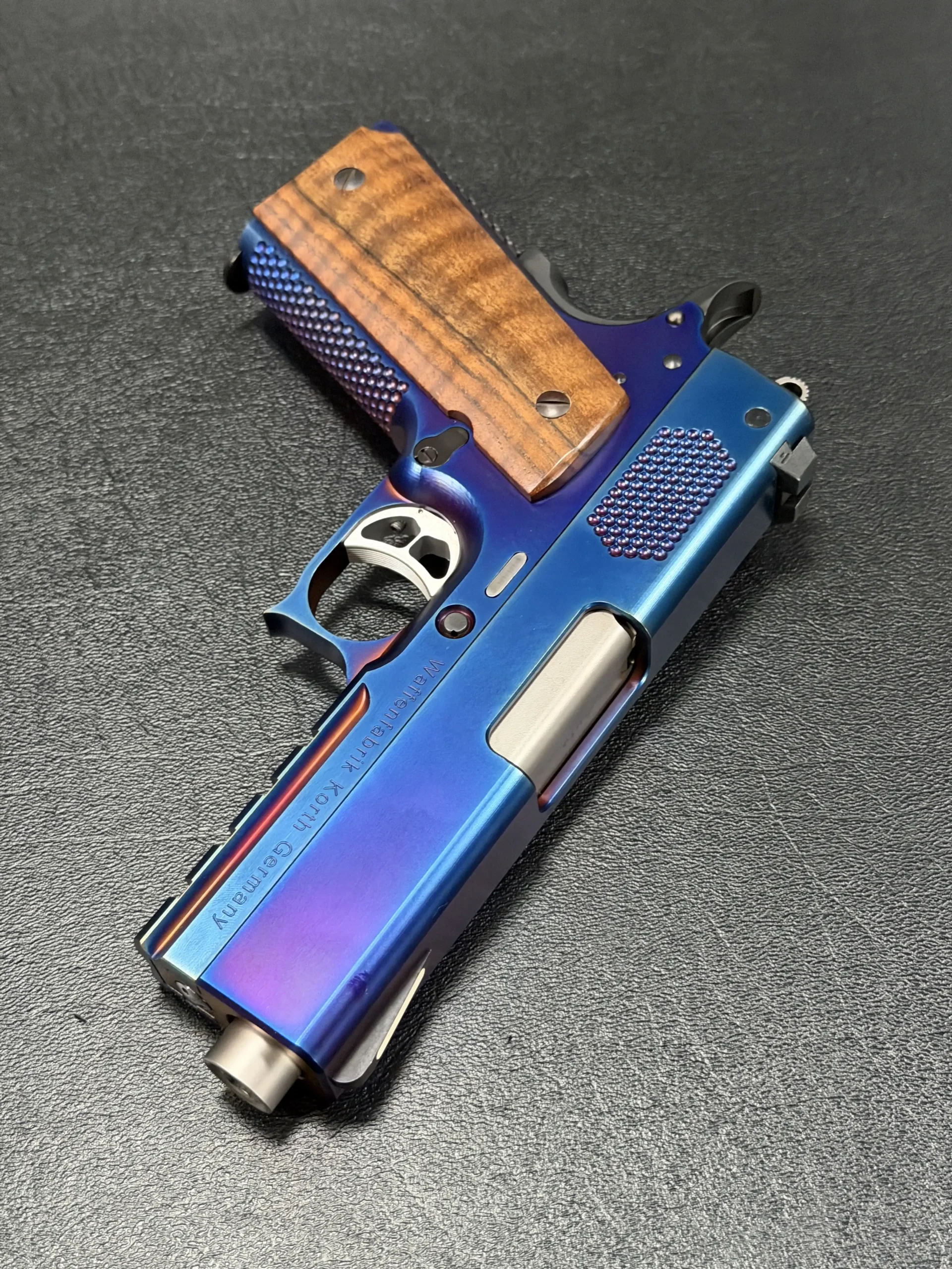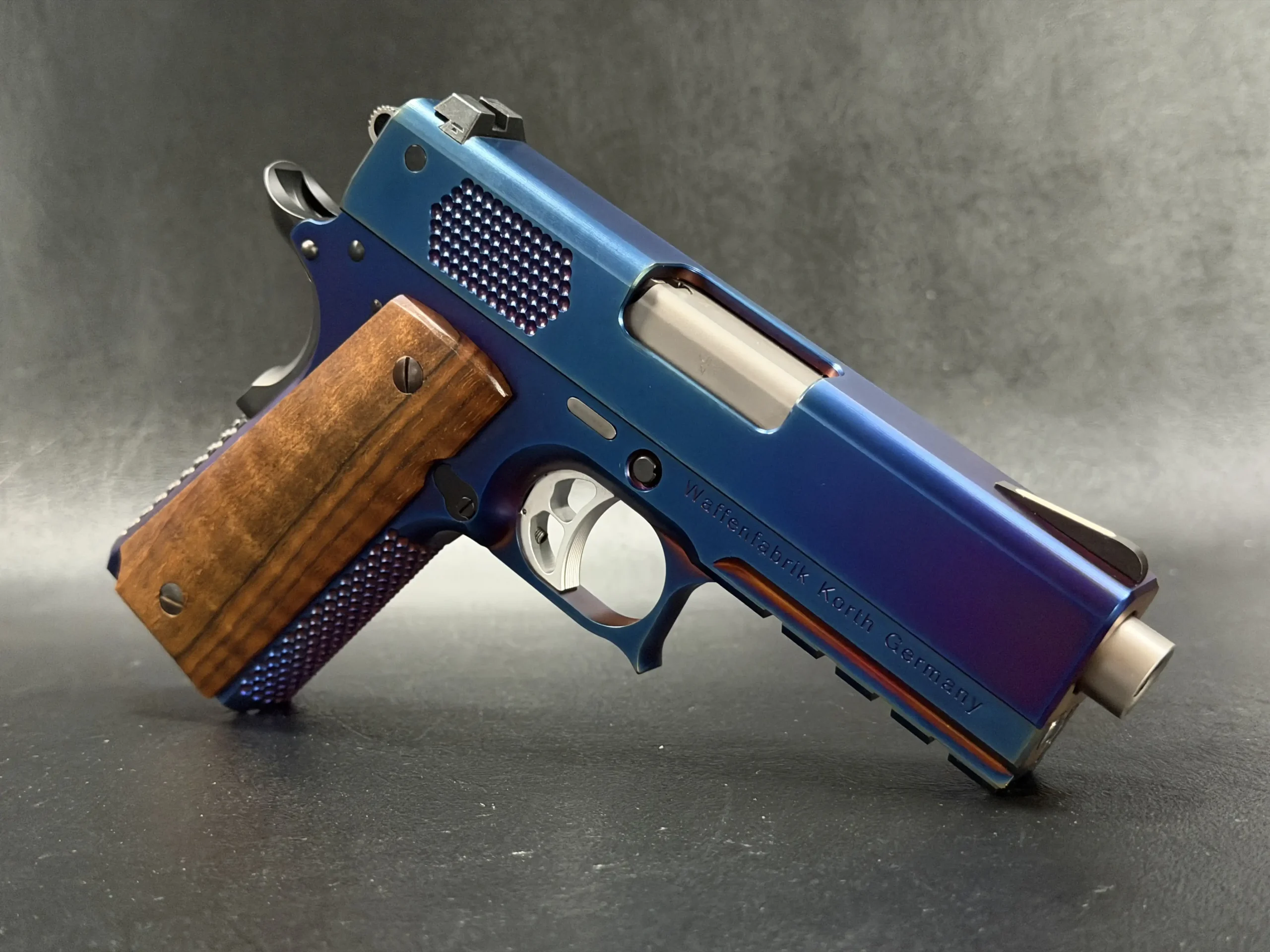 There are custom pistols—and then there are pieces like this. The Korth PRS Blue Plasma 4.25 Inch stands as one of the most visually striking semi-automatic pistols ever produced by Waffenfabrik Korth. Its iridescent, multi-tone Blue Plasma finish shifts with the light, moving from deep sapphire to hints of violet and ember, giving the entire pistol the look of precision engineering wrapped in living color.