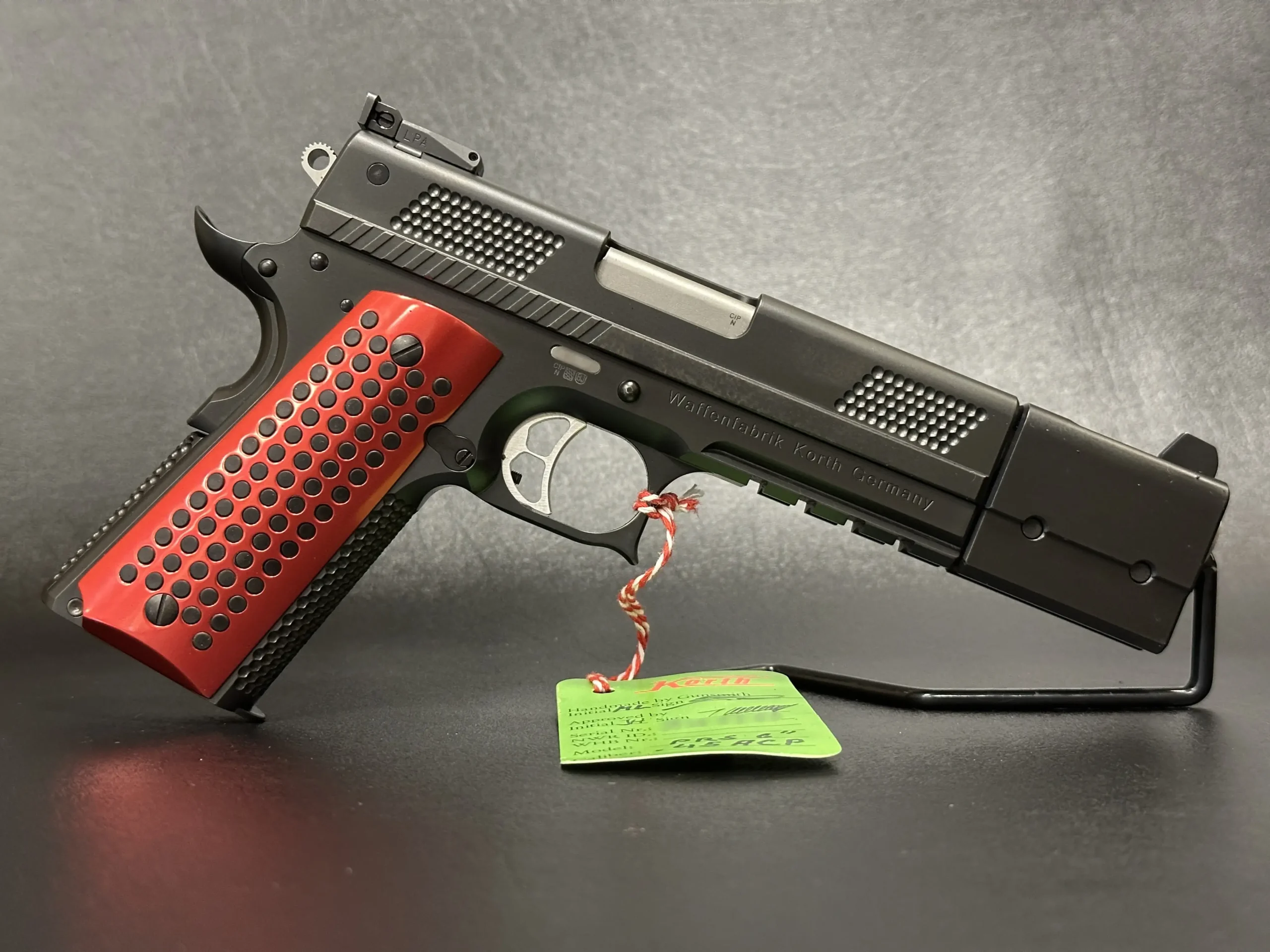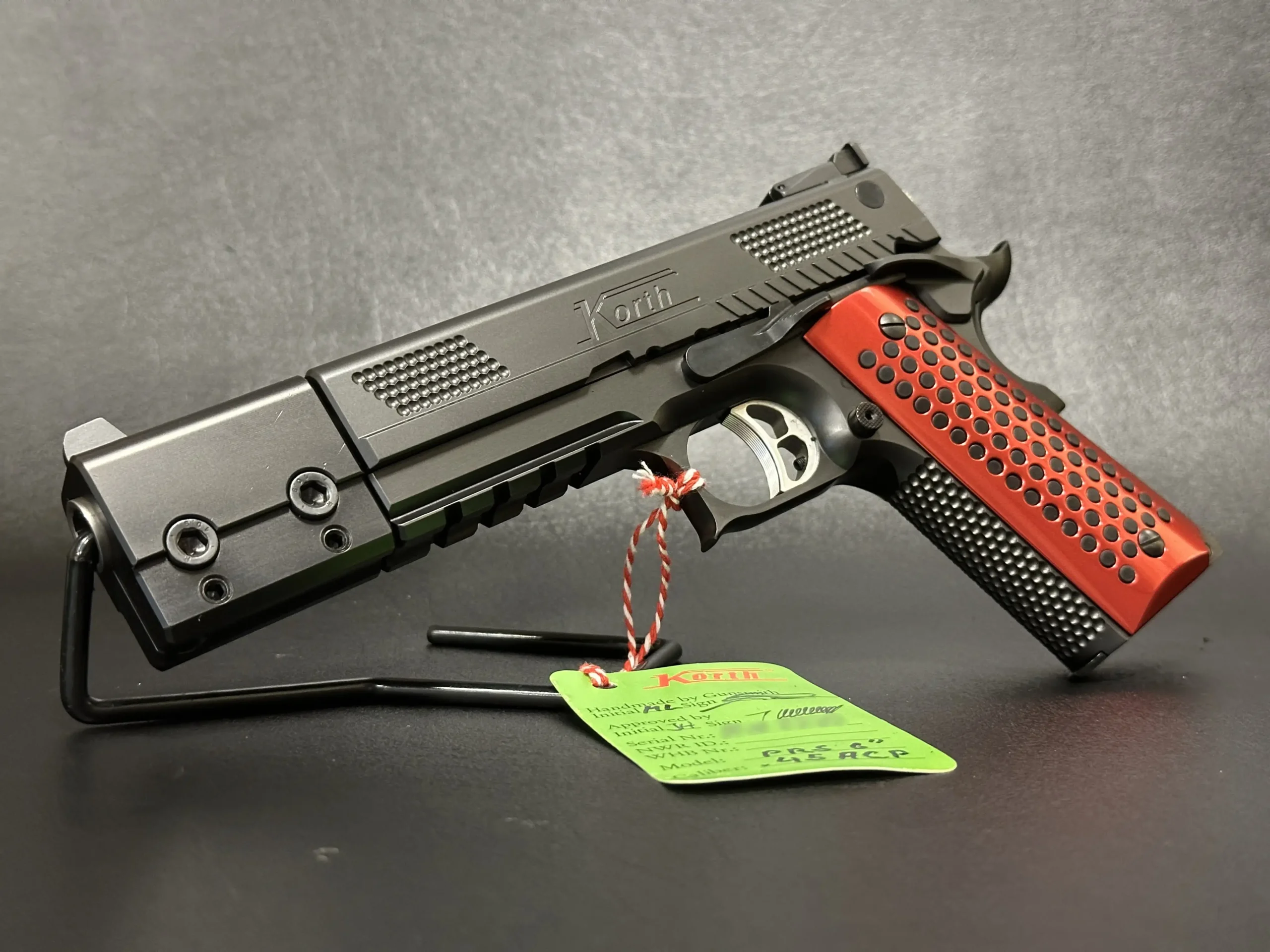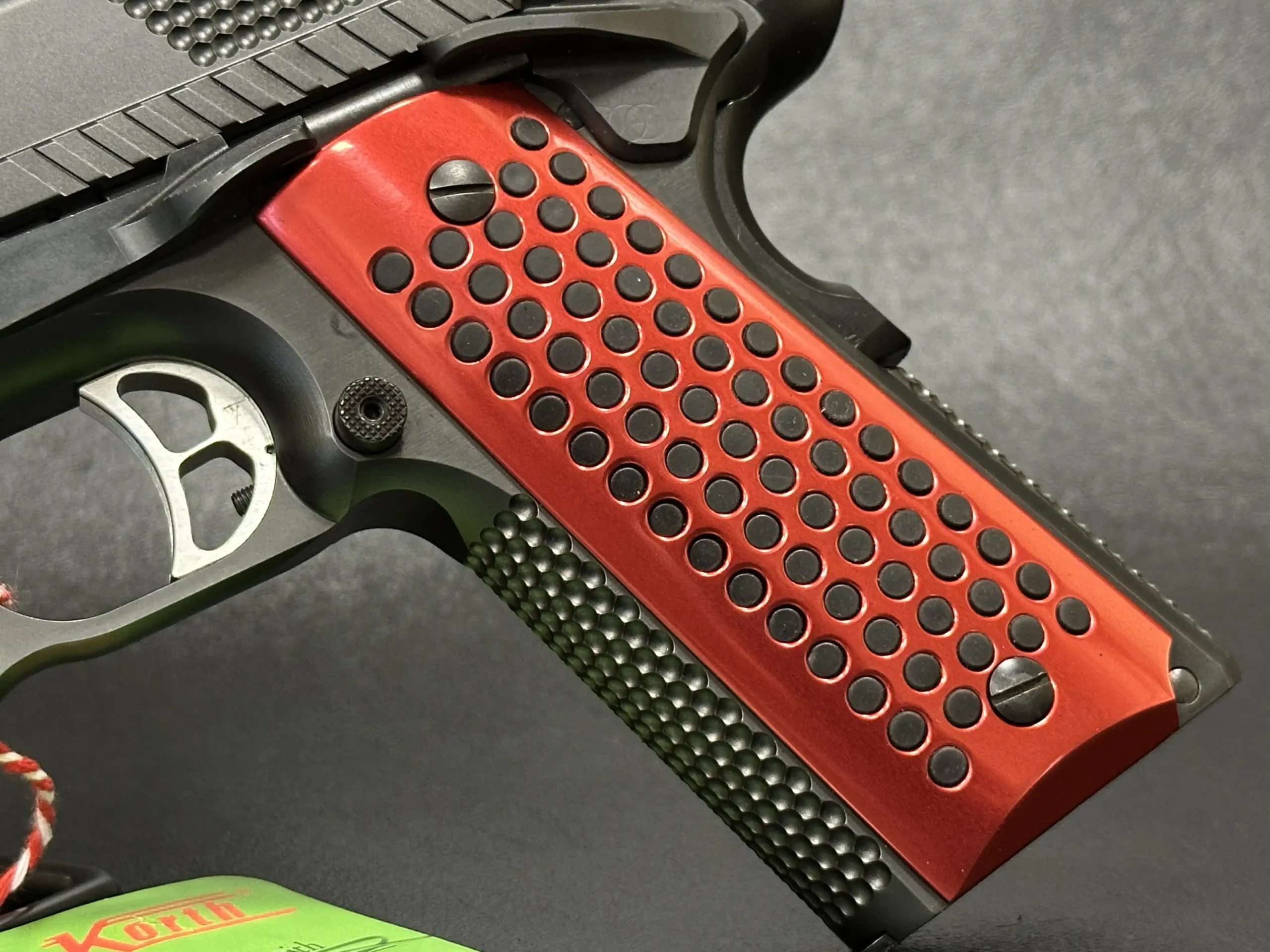 What elevates this example visually is the striking contrast between the red grip panels and the dark frame and slide. The aluminum grips feature Korth’s signature dimpled pattern, offering both a tactile shooting surface and a bold design statement that feels unmistakably modern. Complementing this, the front strap and mainspring housing carry matching texturing, creating a cohesive grip system that is as functional as it is visually distinctive.