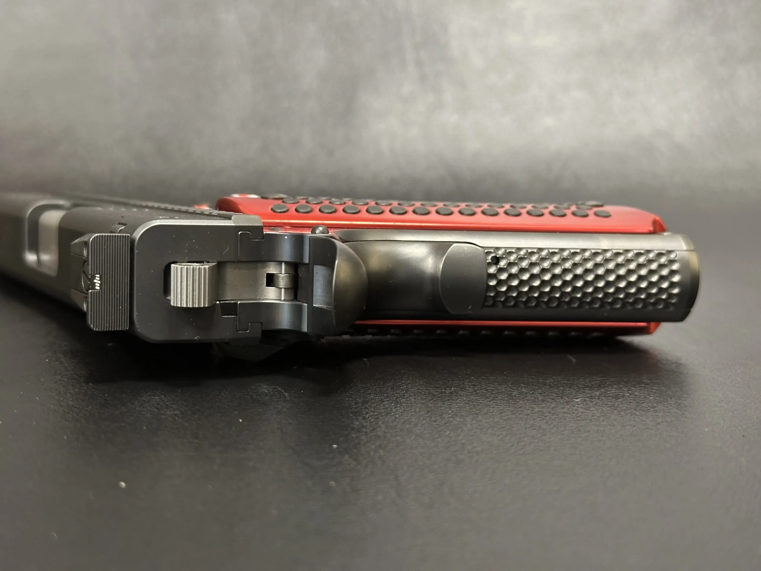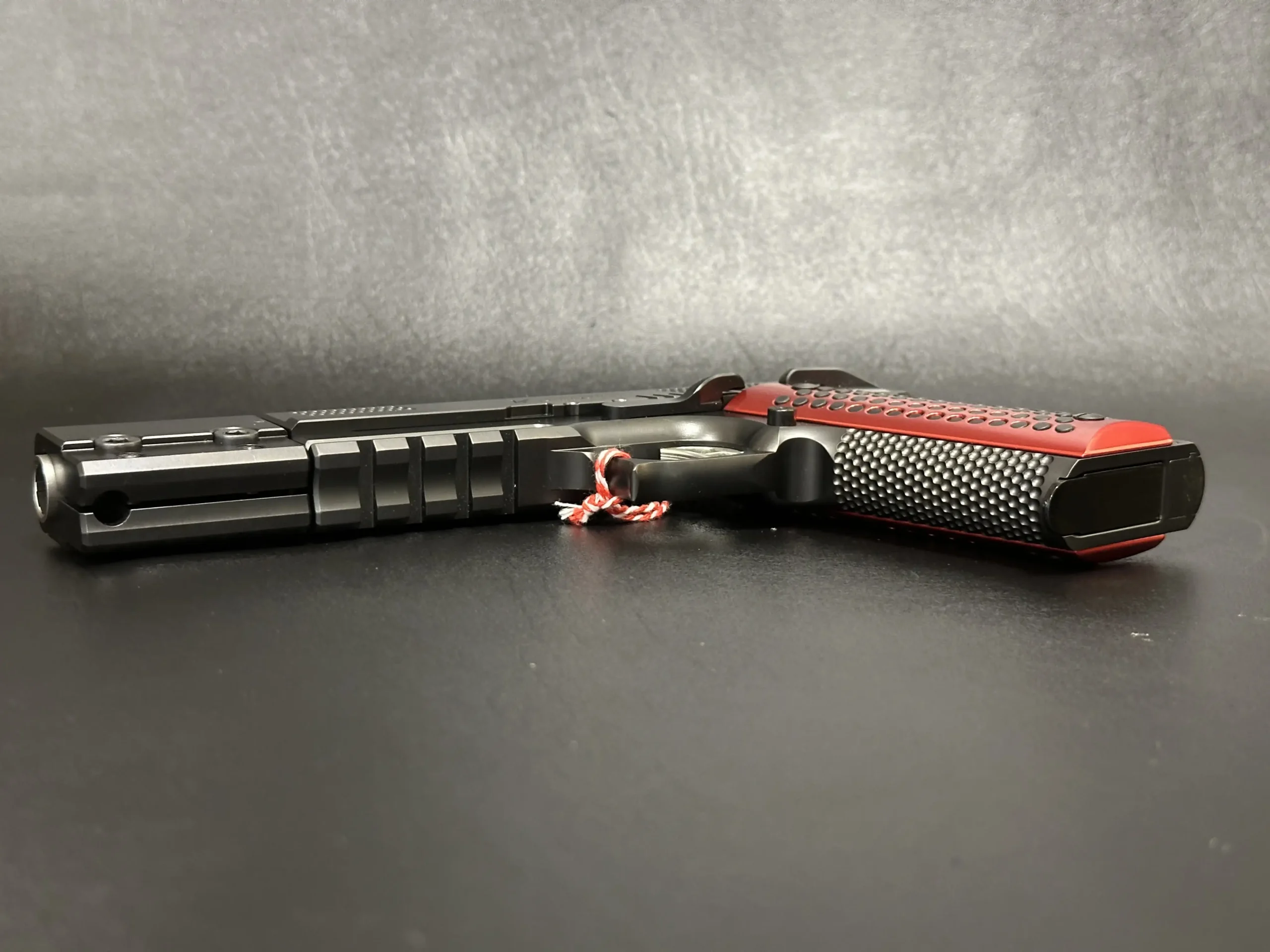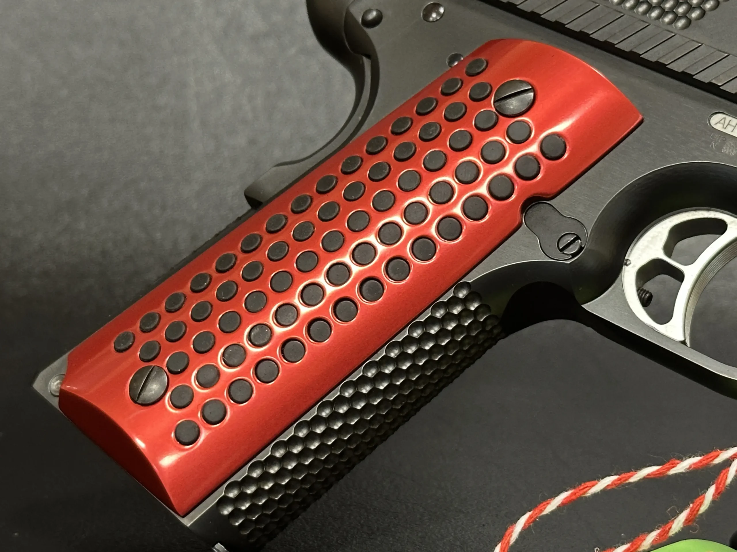 What elevates this example visually is the striking contrast between the red grip panels and the dark frame and slide. The aluminum grips feature Korth’s signature dimpled pattern, offering both a tactile shooting surface and a bold design statement that feels unmistakably modern. Complementing this, the front strap and mainspring housing carry matching texturing, creating a cohesive grip system that is as functional as it is visually distinctive.