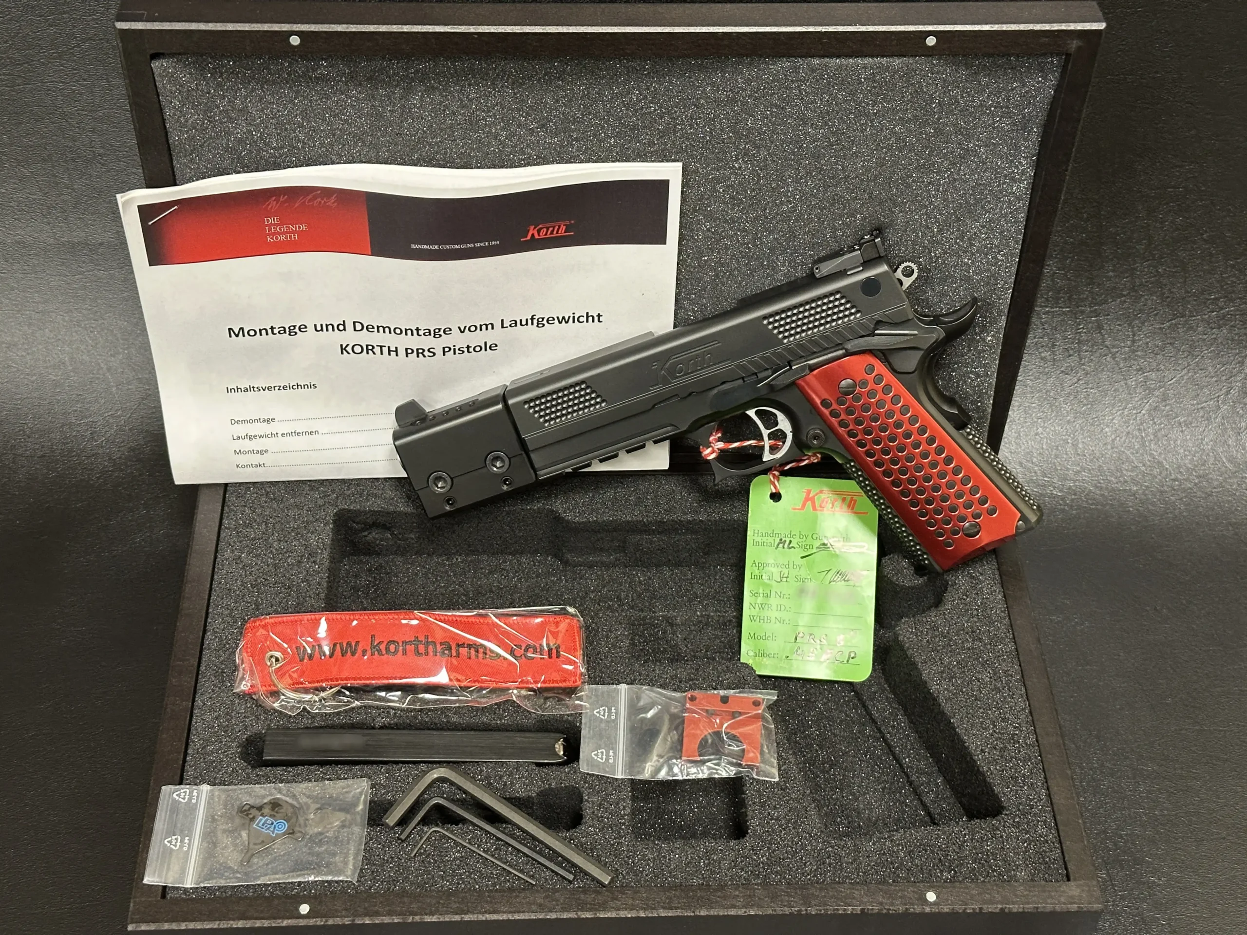 Presented as a complete gallery set, the pistol is accompanied by its factory case, documentation, tools, and accessories, exactly as one would expect from a flagship Korth offering.