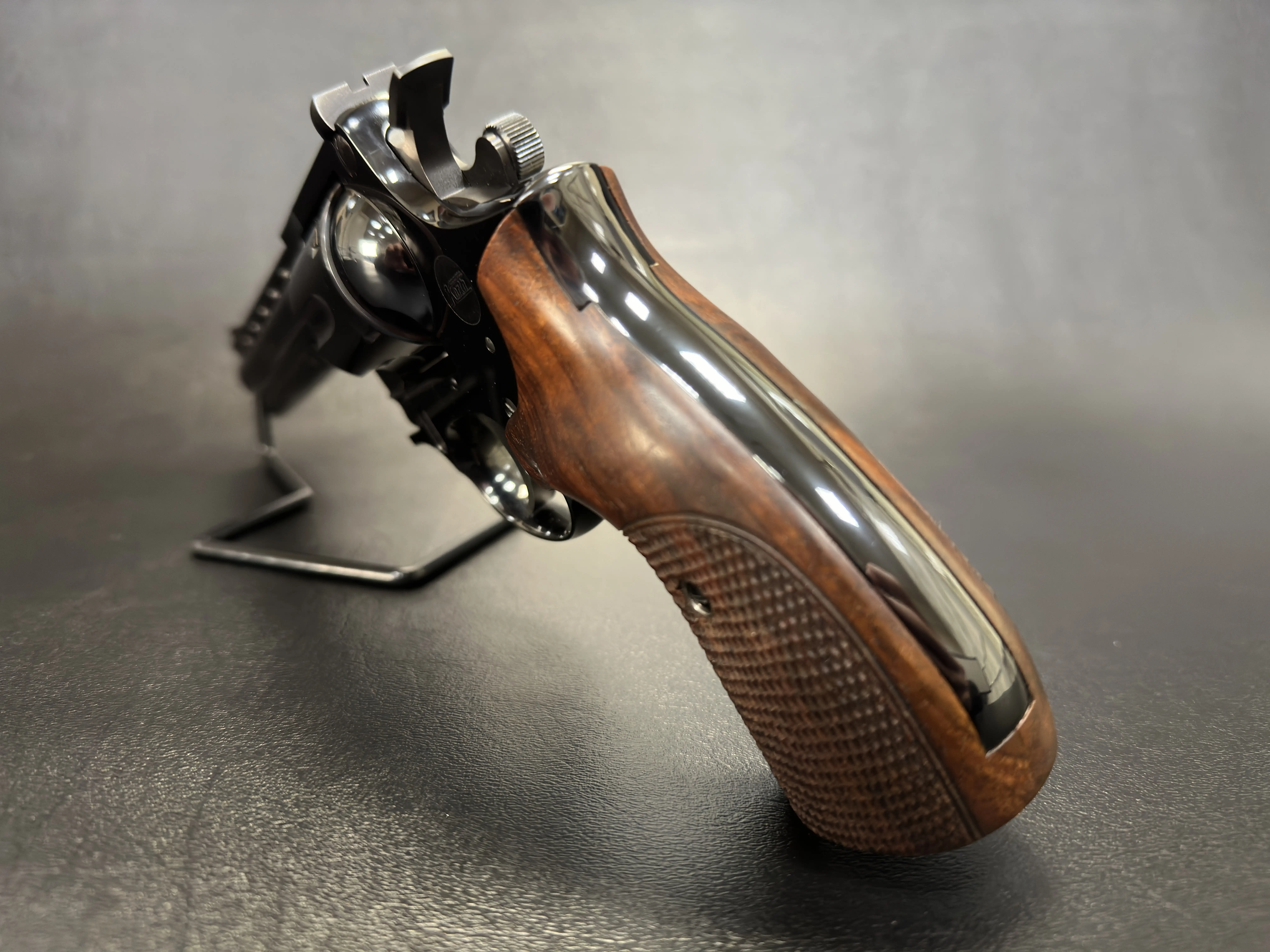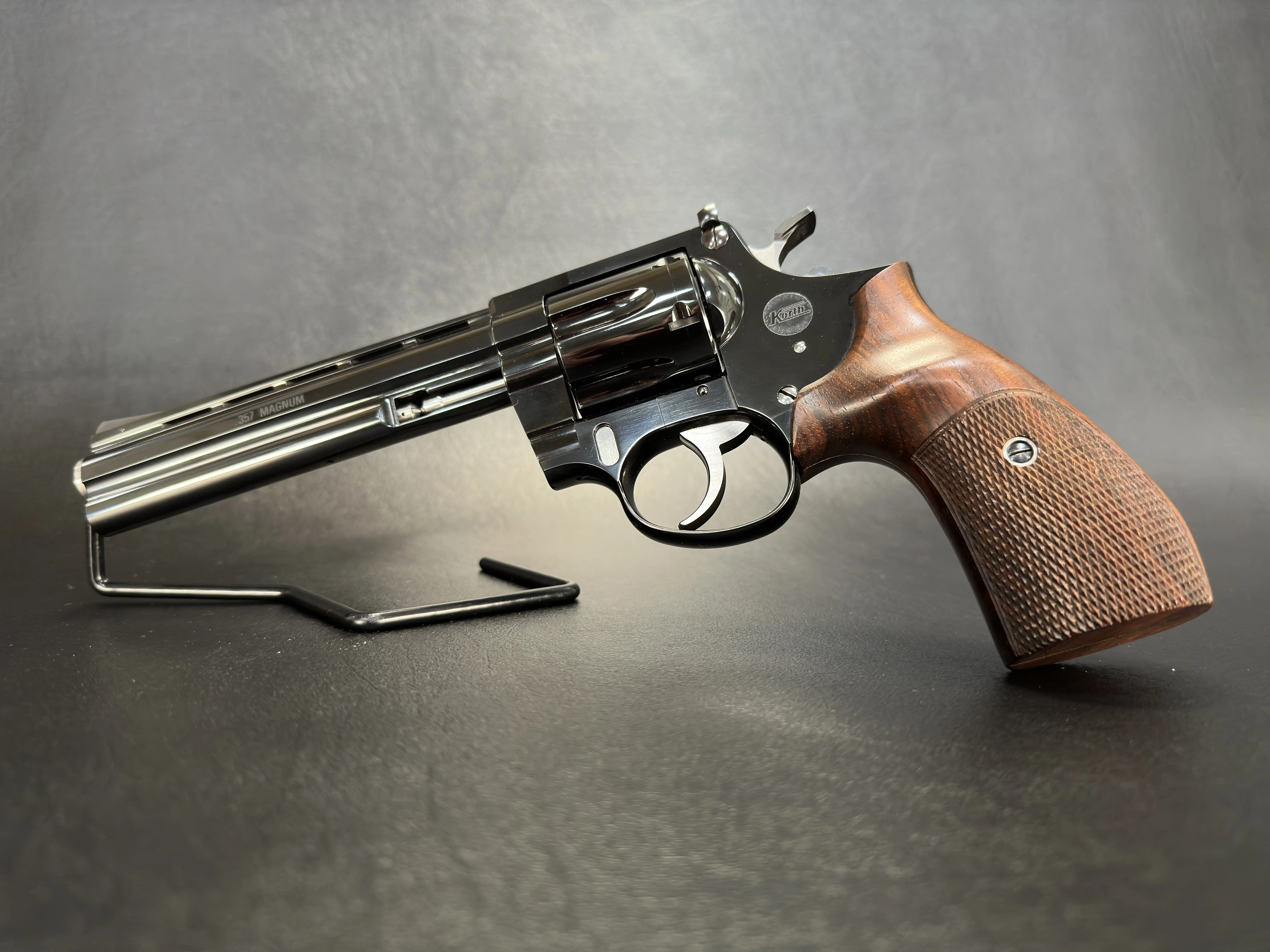 The factory checkered walnut grips add warmth to the otherwise dark, mirror-finished steel. They’re shaped for both control and comfort, with that distinctive Korth ergonomic contour that sits naturally in the hand. Subtle details, grip medallions, finish transitions, edge breaks, all reflect the hand-fitted nature of these revolvers.