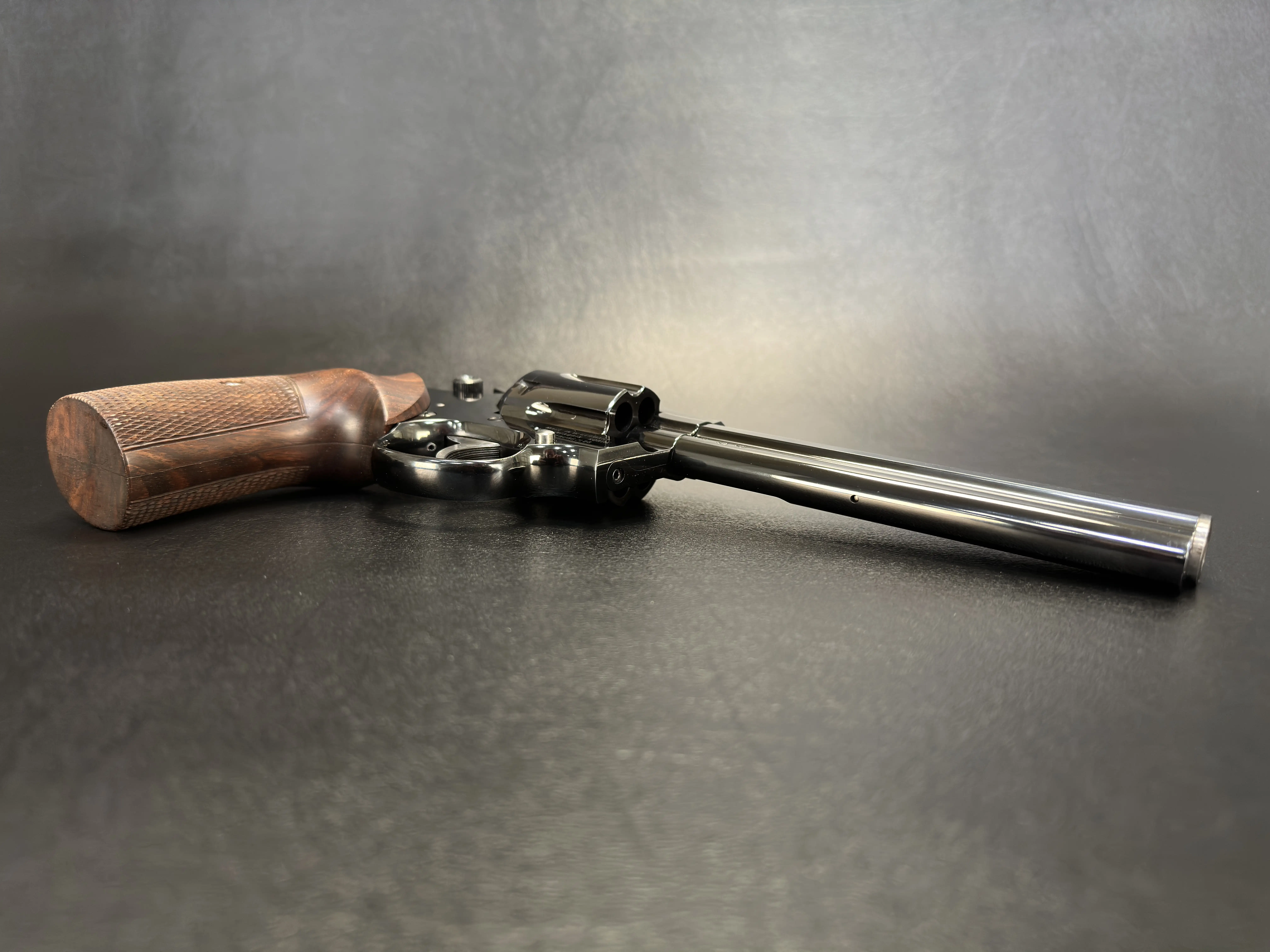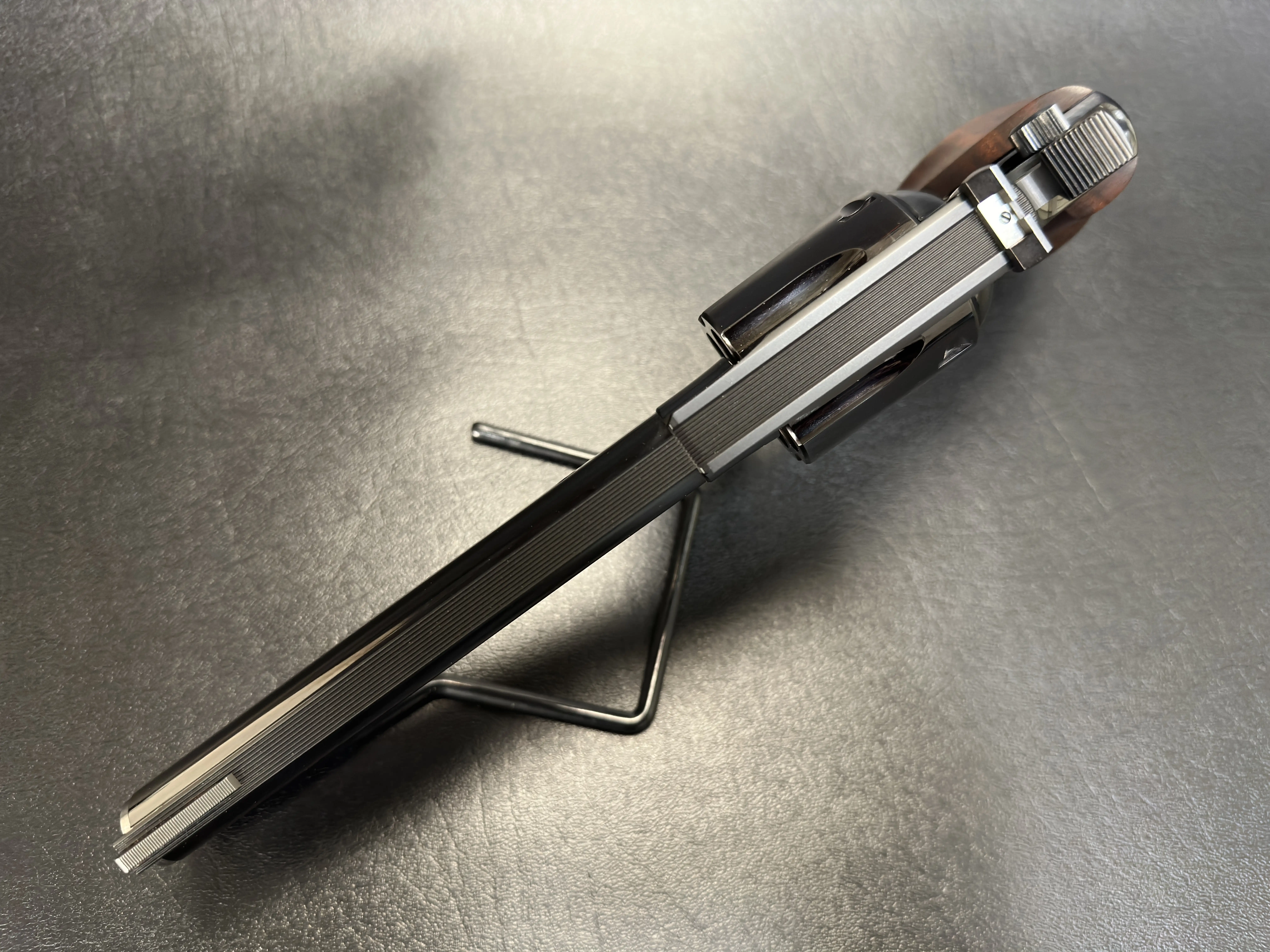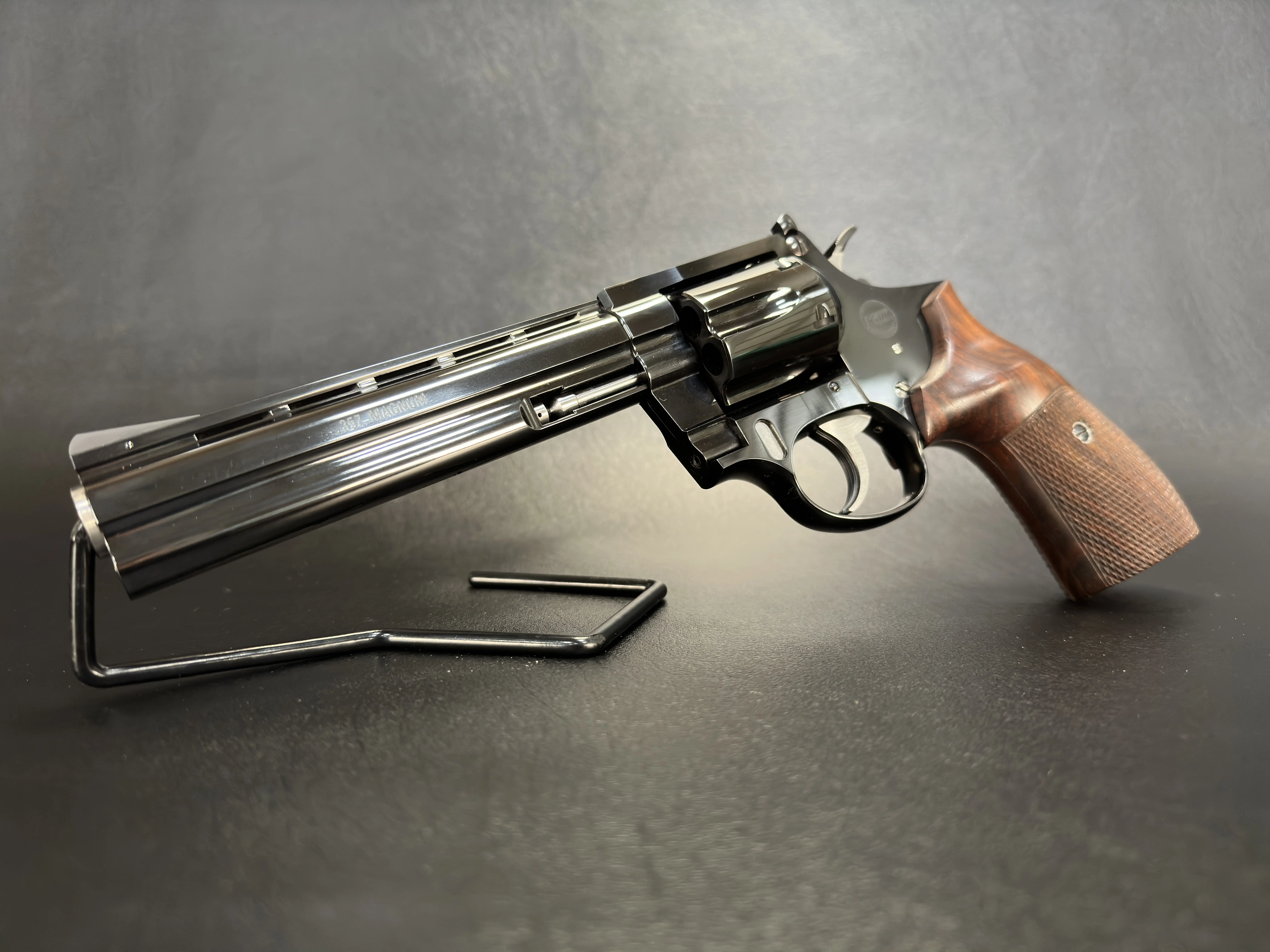 The 6-inch barrel gives the Combat model a commanding profile while delivering the kind of sight radius and stability that made these revolvers as respected on the range as they are in the collector’s case. The deep, high-polish blue finish reflects light like glass, highlighting the revolver’s sculpted lines, from the ventilated rib to the precisely machined cylinder flutes.
