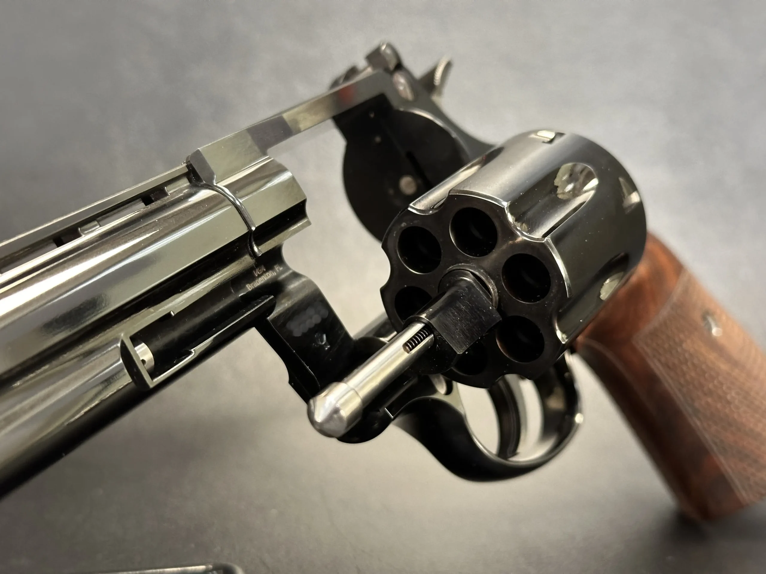 Speaking of the cylinder, the machining here is pure Ratzeburg. Each chamber is cut with surgical precision, and the lock-up is bank-vault tight, one of the defining traits that separates Korth from virtually every other revolver maker of the era.