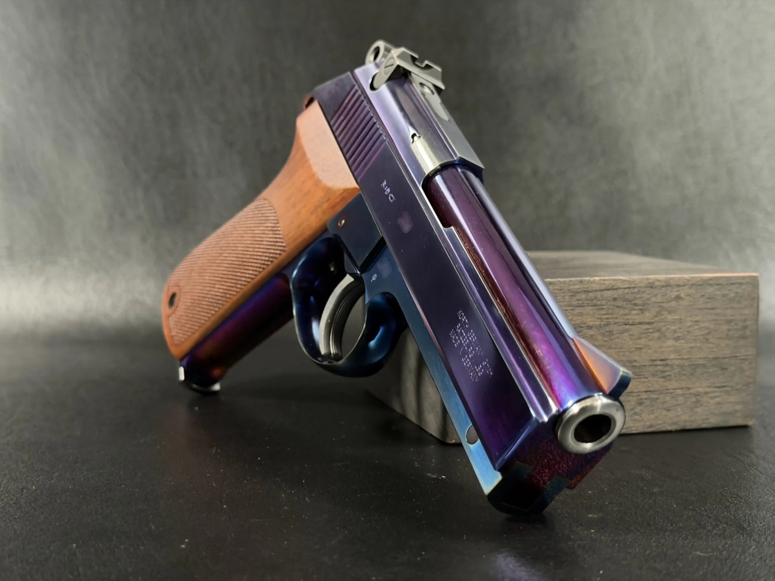 There are pieces that catch the eye, and then there are pieces that simply stop you in your tracks. This Korth Semi Auto Blue Plasma belongs firmly in the second category—a rare fusion of German precision and stunning artistic finish, presented here in a deep iridescent treatment that shifts between blue, violet, and bronze tones depending on the light. It is as much a sculpture in steel as it is a firearm.