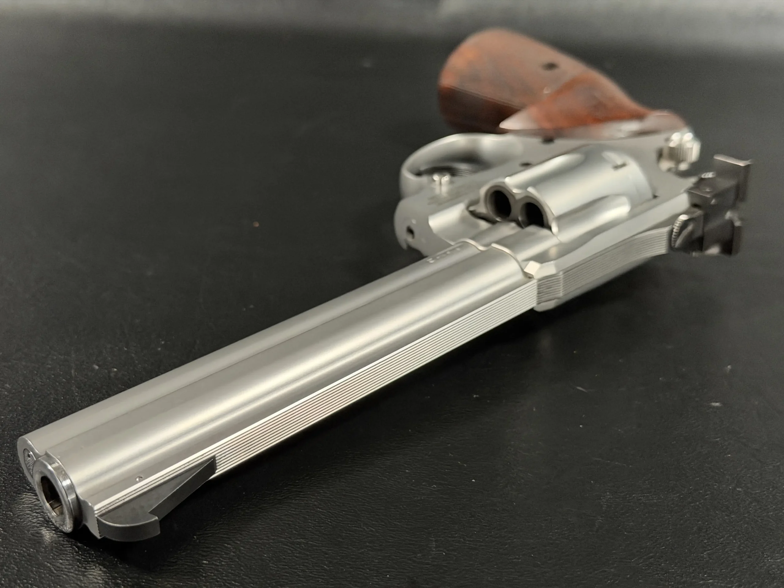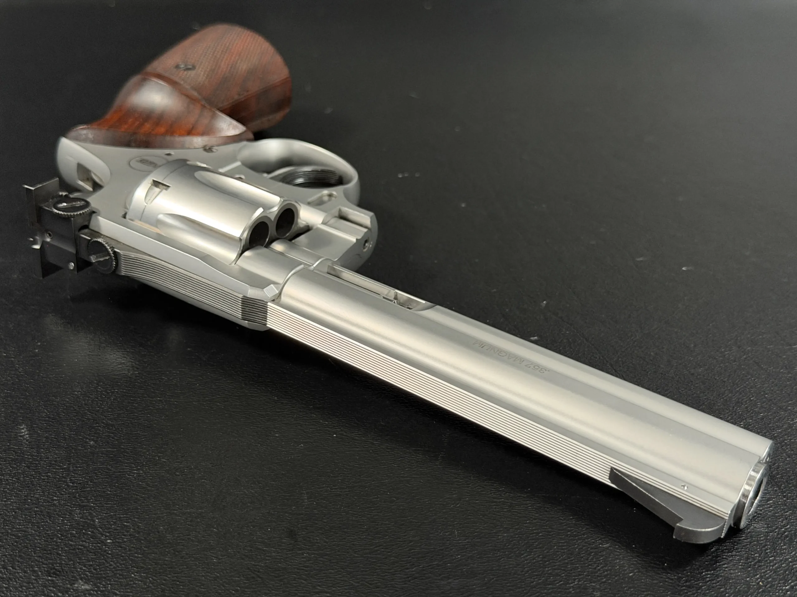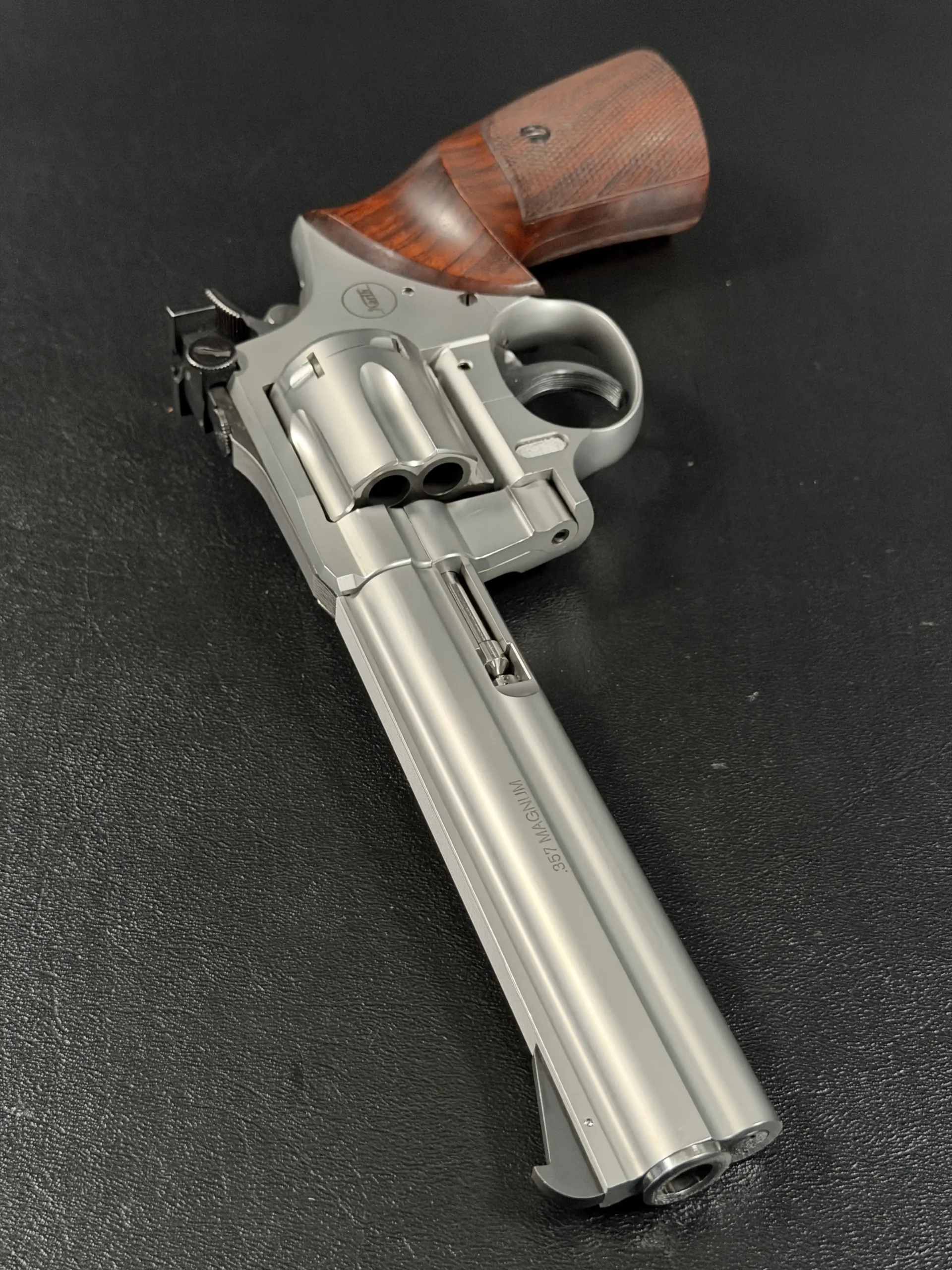Crafted entirely from stainless steel, the revolver features a beautifully executed satin finish that highlights the revolver’s sculpted lines while offering exceptional durability. The 6-inch barrel provides the ideal balance of sight radius, weight distribution, and ballistic performance, making the Sport model equally at home on the target line or within a premier collection. The barrel rib and full underlug add both visual authority and functional stability, reducing muzzle rise and enhancing overall control.
