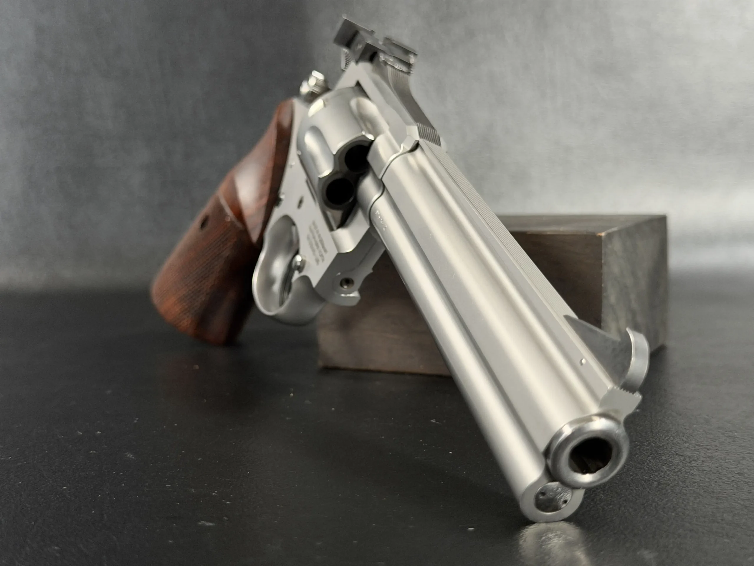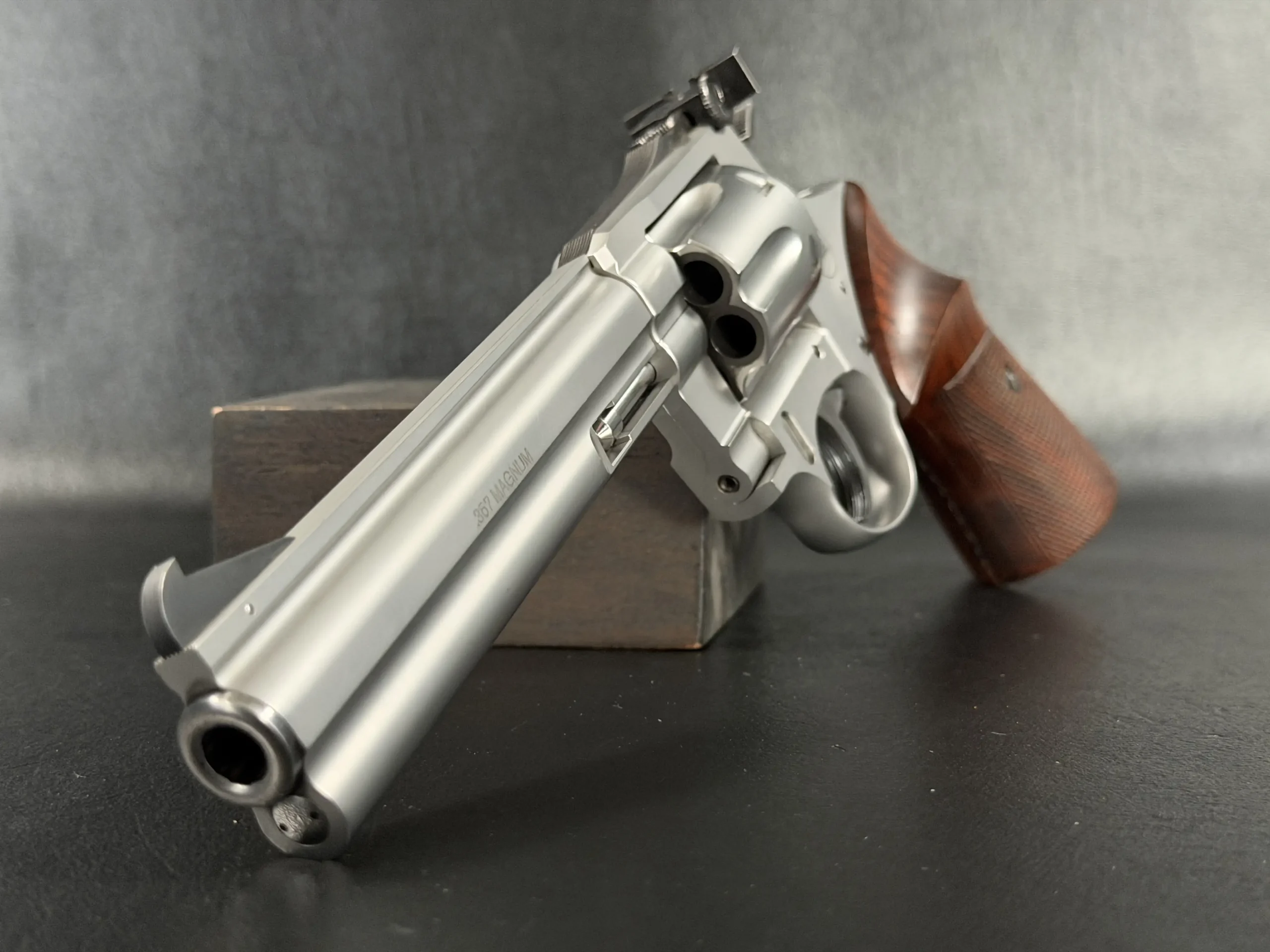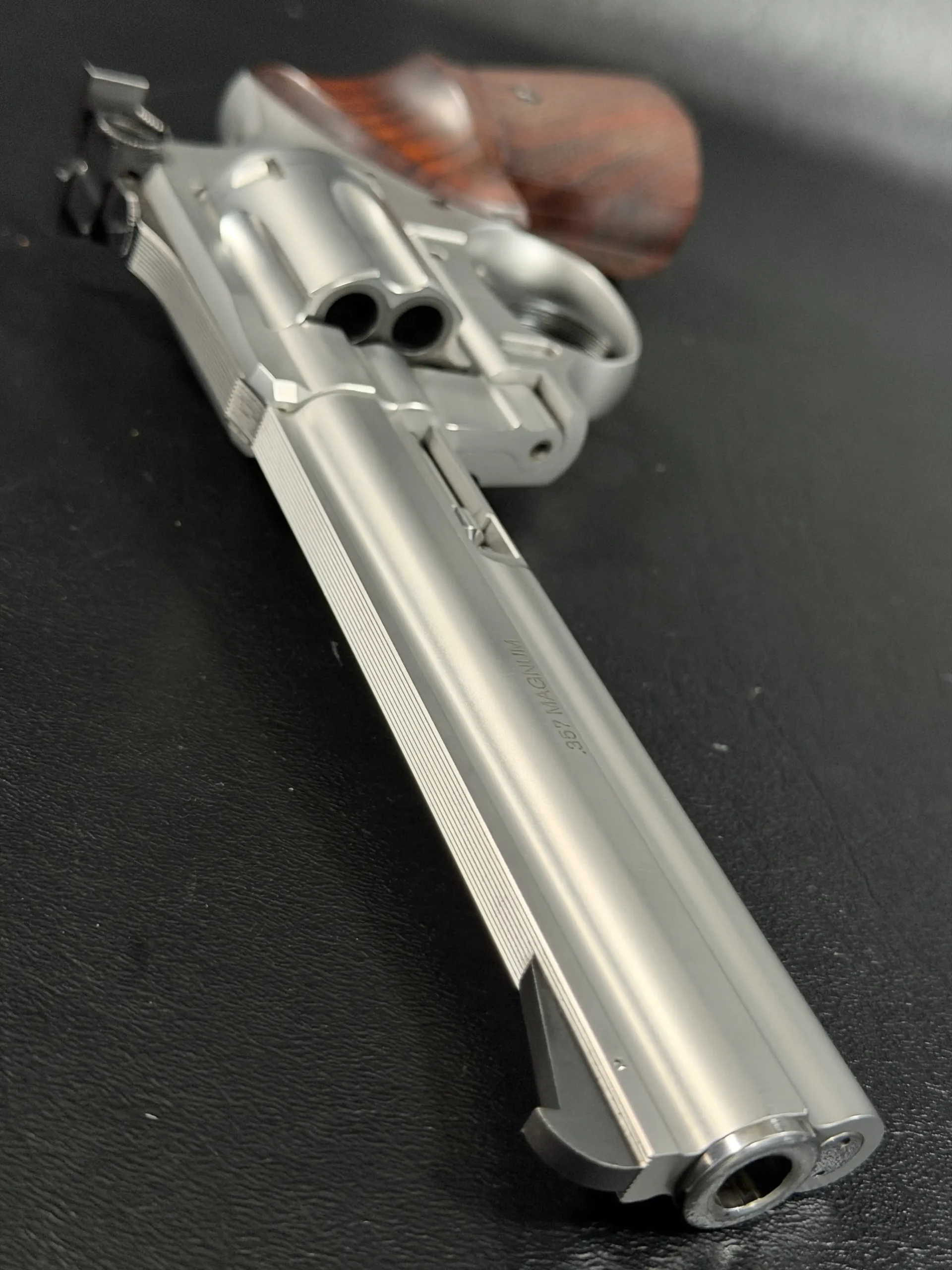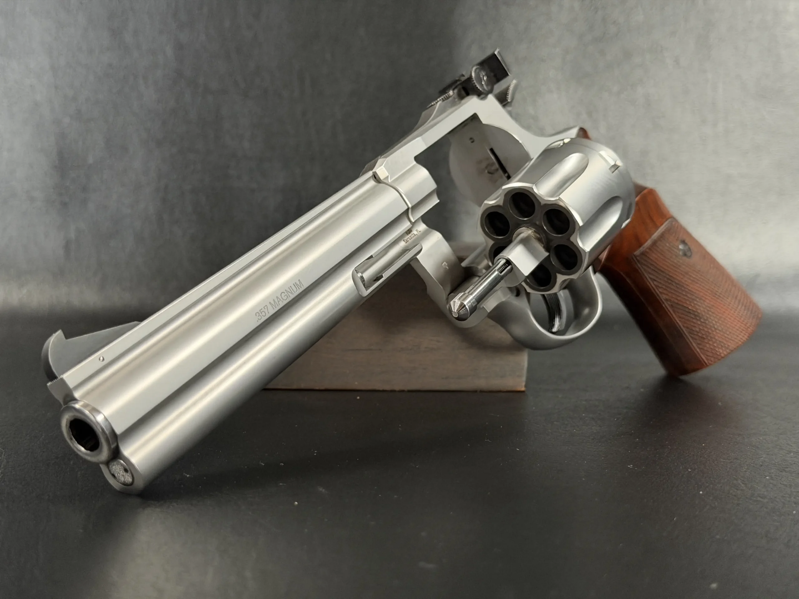 Crafted entirely from stainless steel, the revolver features a beautifully executed satin finish that highlights the revolver’s sculpted lines while offering exceptional durability. The 6-inch barrel provides the ideal balance of sight radius, weight distribution, and ballistic performance, making the Sport model equally at home on the target line or within a premier collection. The barrel rib and full underlug add both visual authority and functional stability, reducing muzzle rise and enhancing overall control.