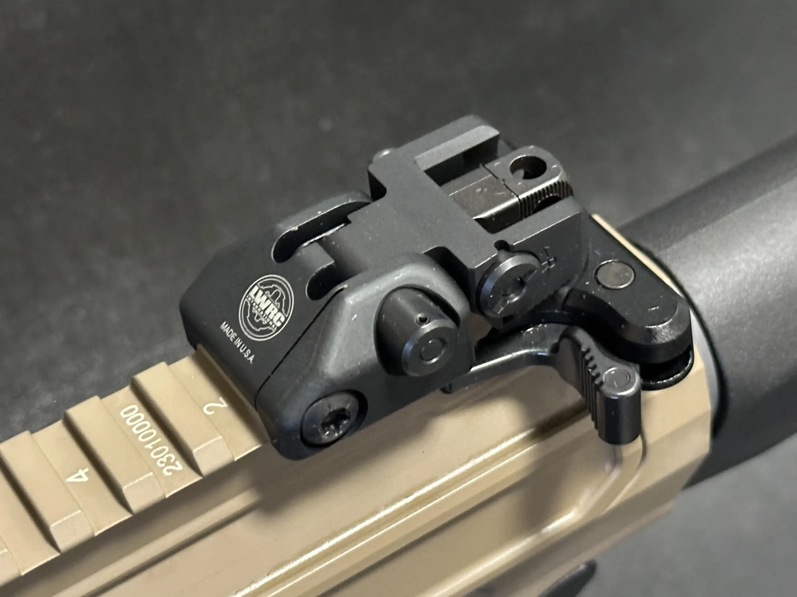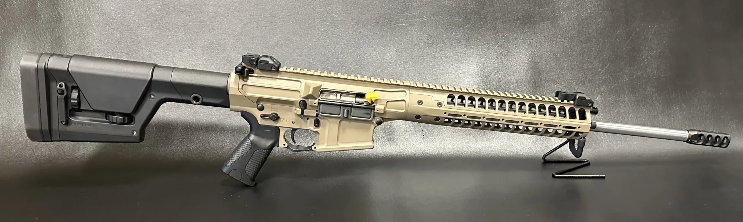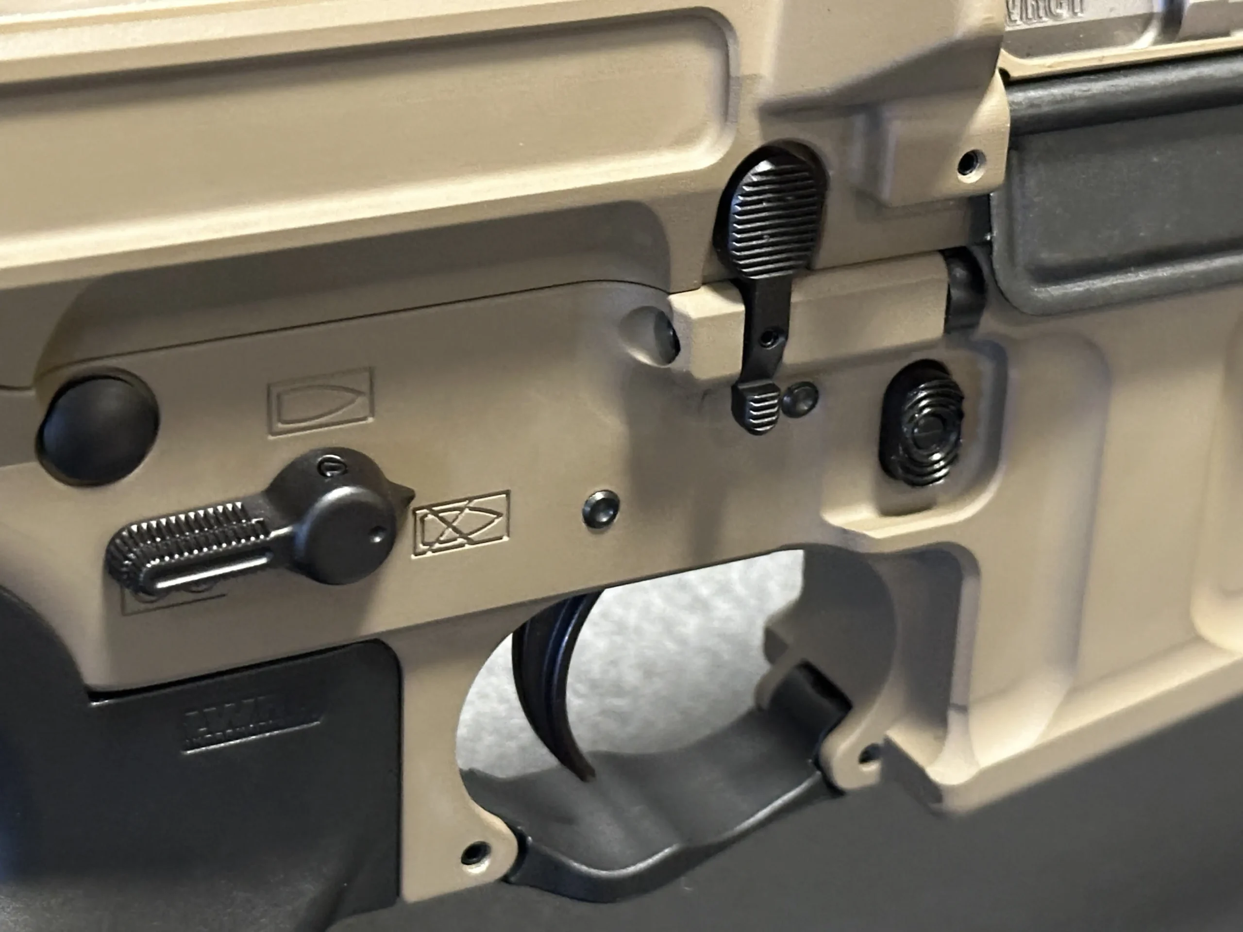 Finished in a striking Flat Dark Earth (FDE) Cerakote, the rifle presents a commanding visual presence. The monolithic upper receiver flows seamlessly into LWRC’s extended modular handguard, creating a continuous top rail optimized for advanced optics and mission-specific accessories. Precision indexing along the rail adds both function and visual depth, an industrial design cue that reflects the rifle’s technical pedigree.