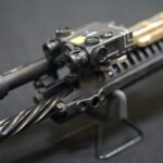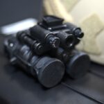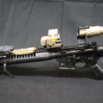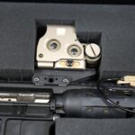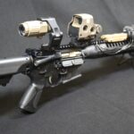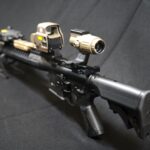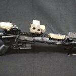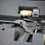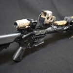 The LWRC rifle, chambered in 5.56 NATO, is equipped with EOTECH optics, including the EXPS3-0, tailored for night vision shooting, particularly effective when paired with Unity Tactical’s Absolute Riser. Elevating the EOTECH’s line of sight, this setup enhances visibility while wearing night vision goggles (NVGs).