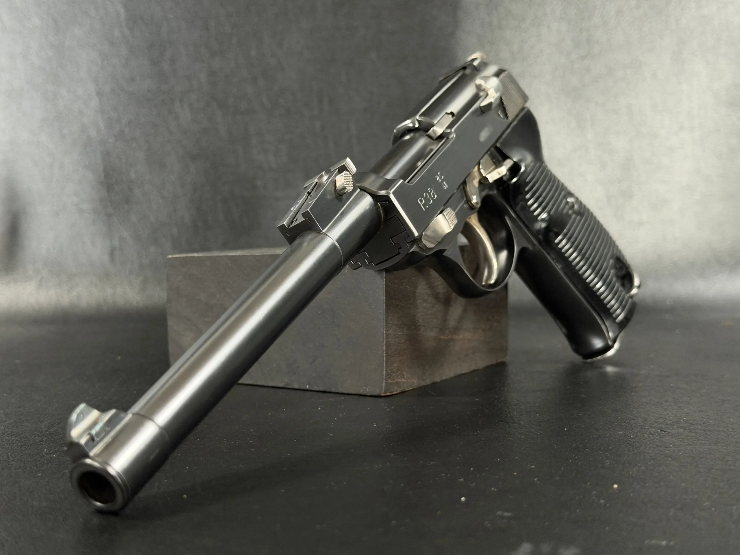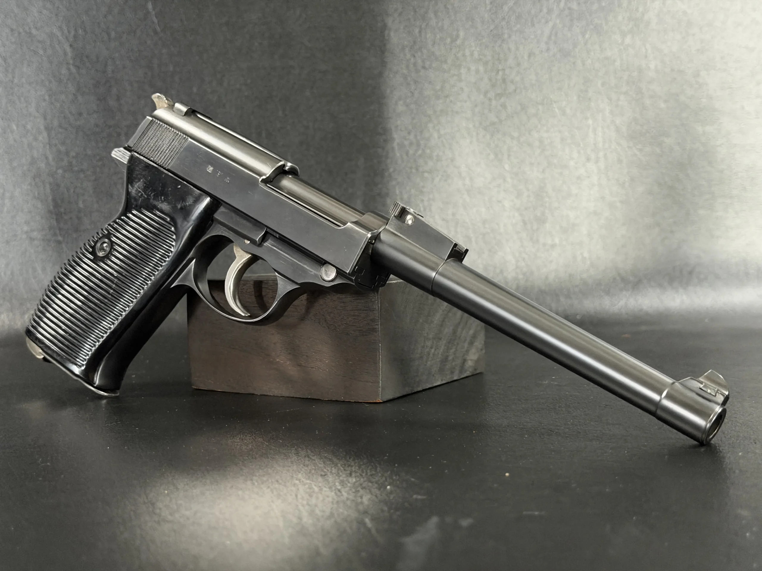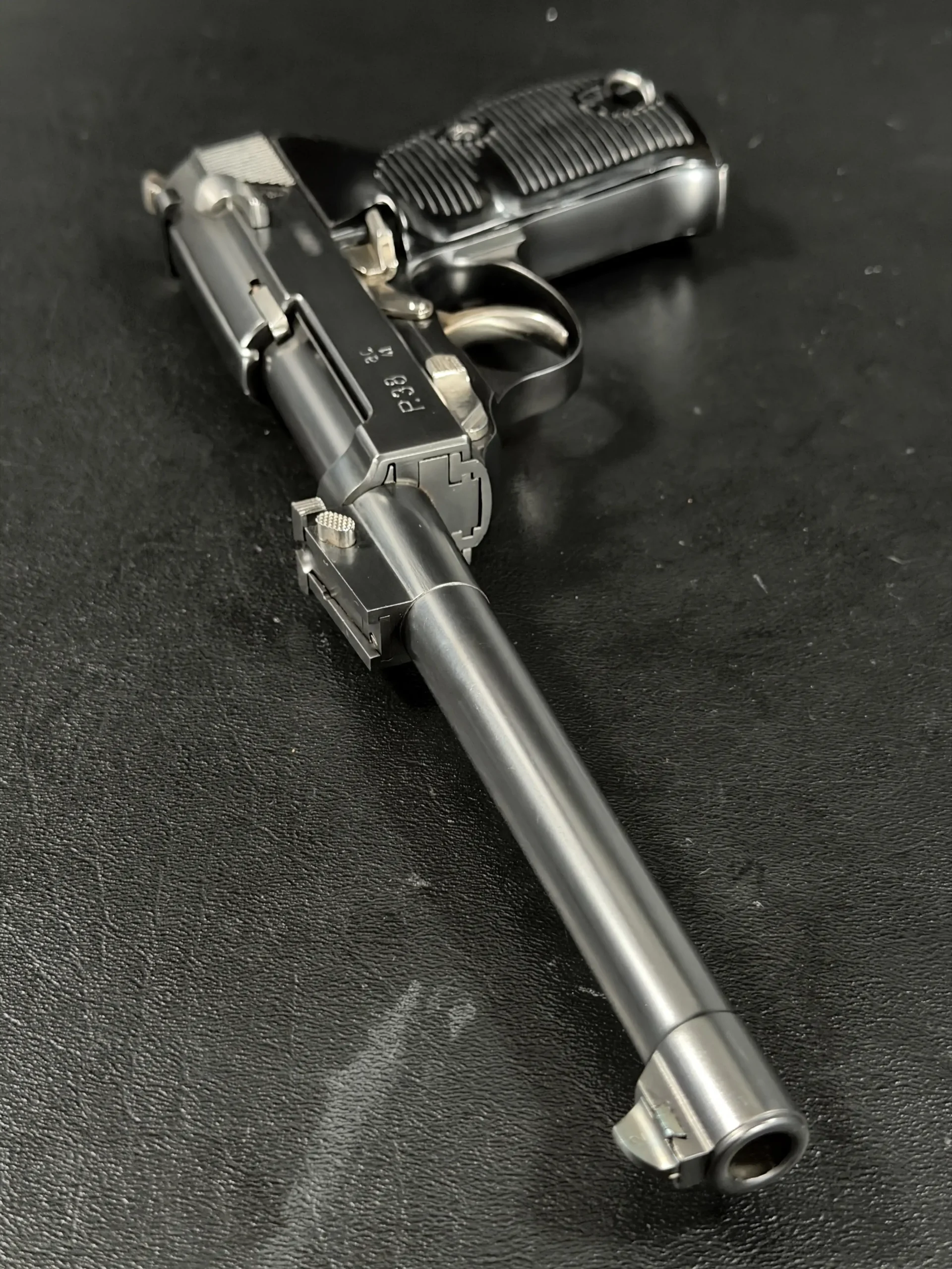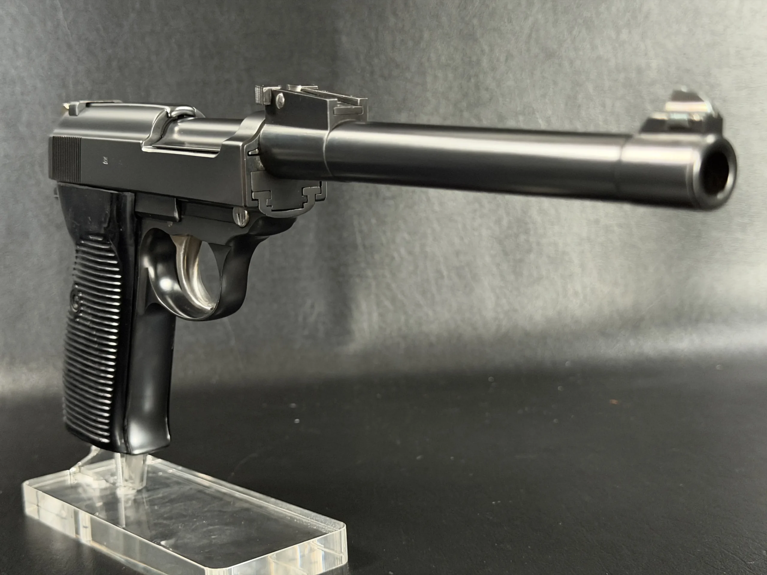 Built upon the iconic Walther P38 platform and chambered in 9mm, this pistol has been transformed through an extraordinary custom modification inspired by the long-barreled Luger Artillery configuration. The result is a pistol that blends two legendary German service handgun designs into one visually dramatic and mechanically intriguing piece.