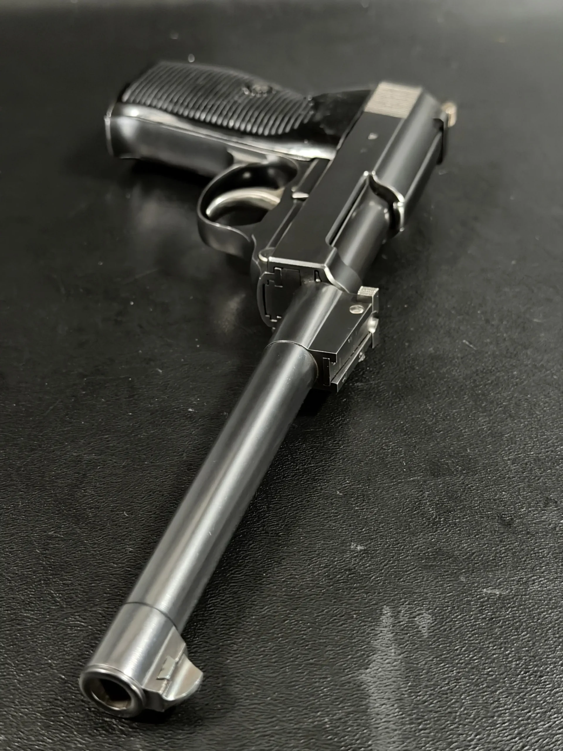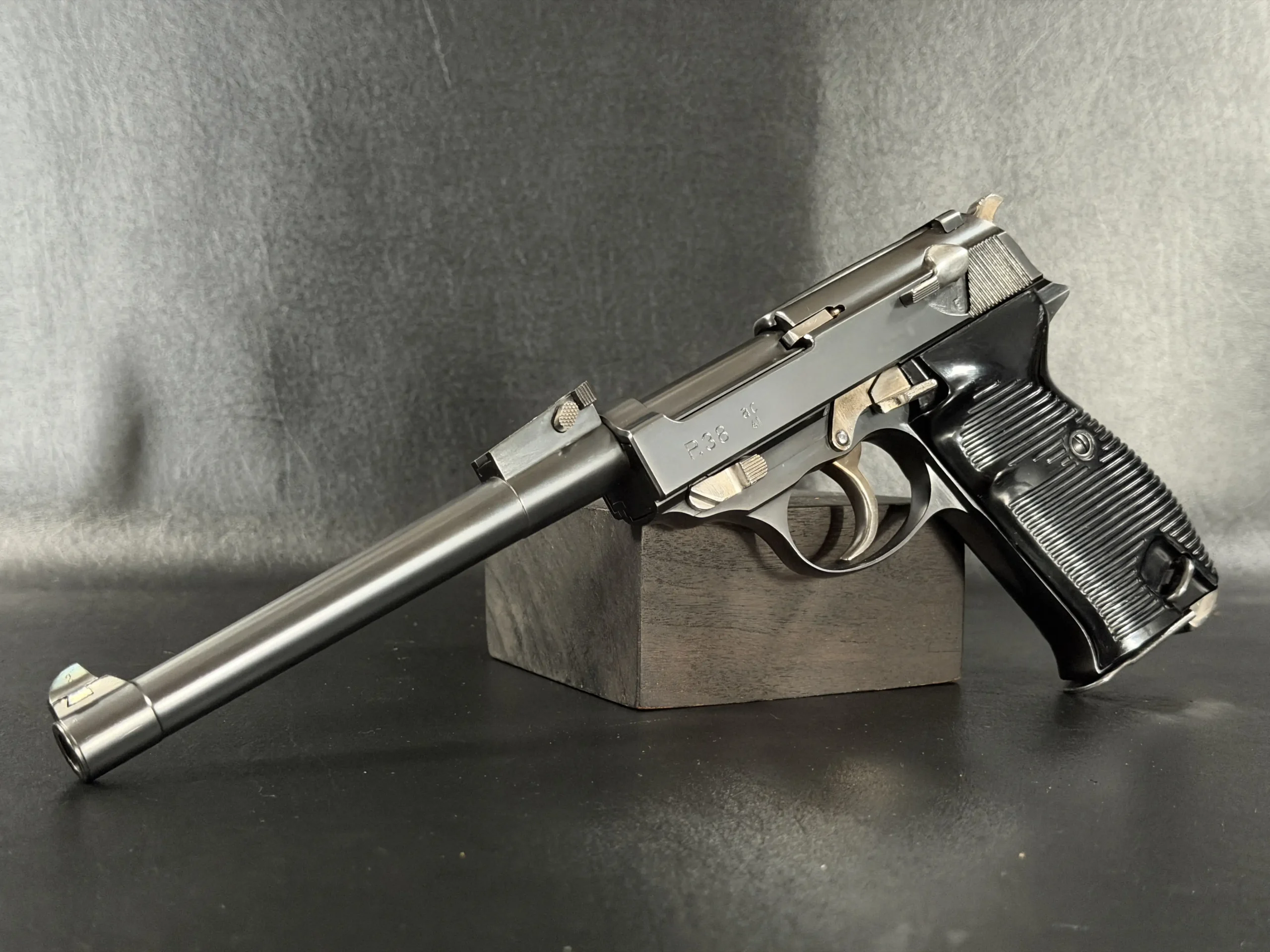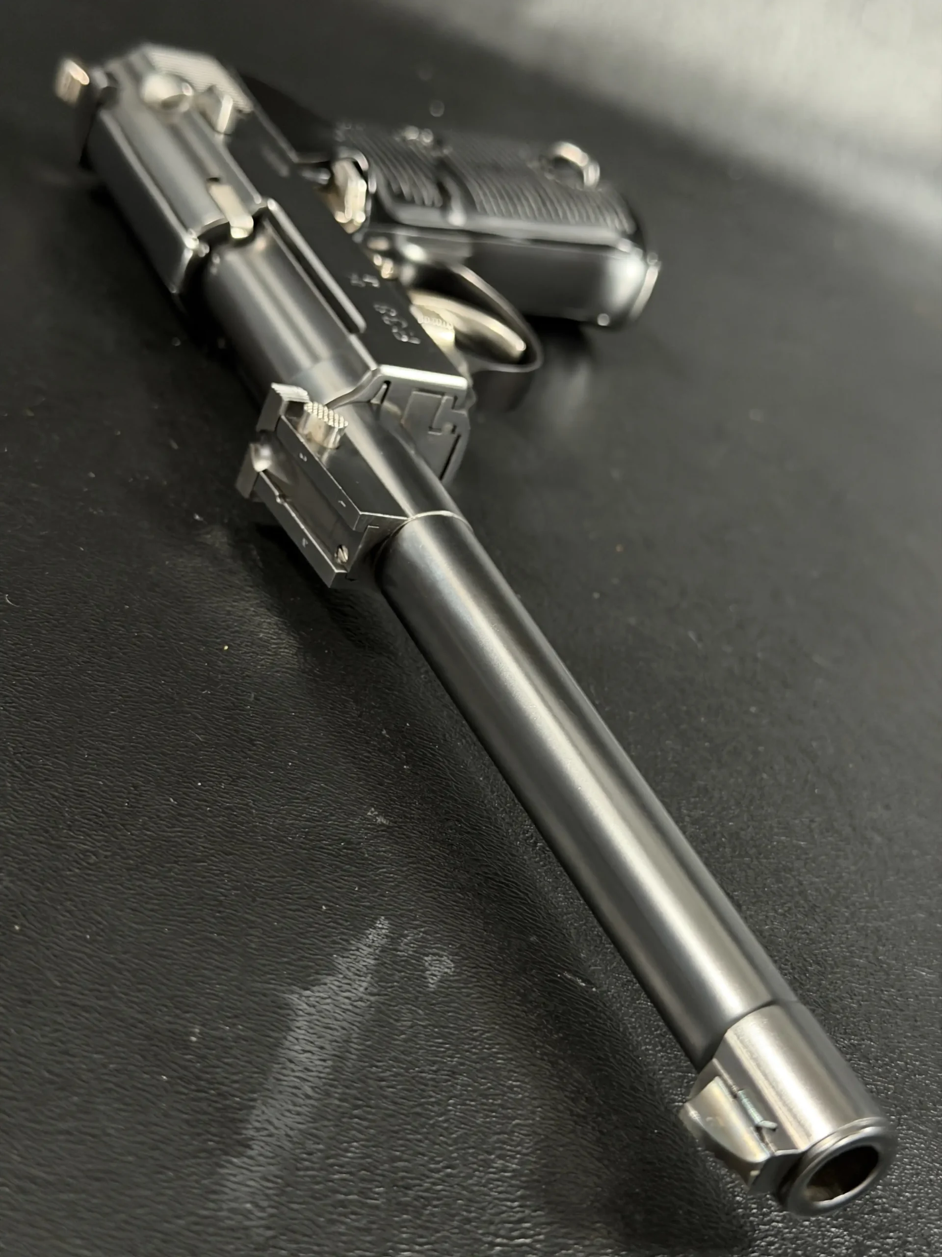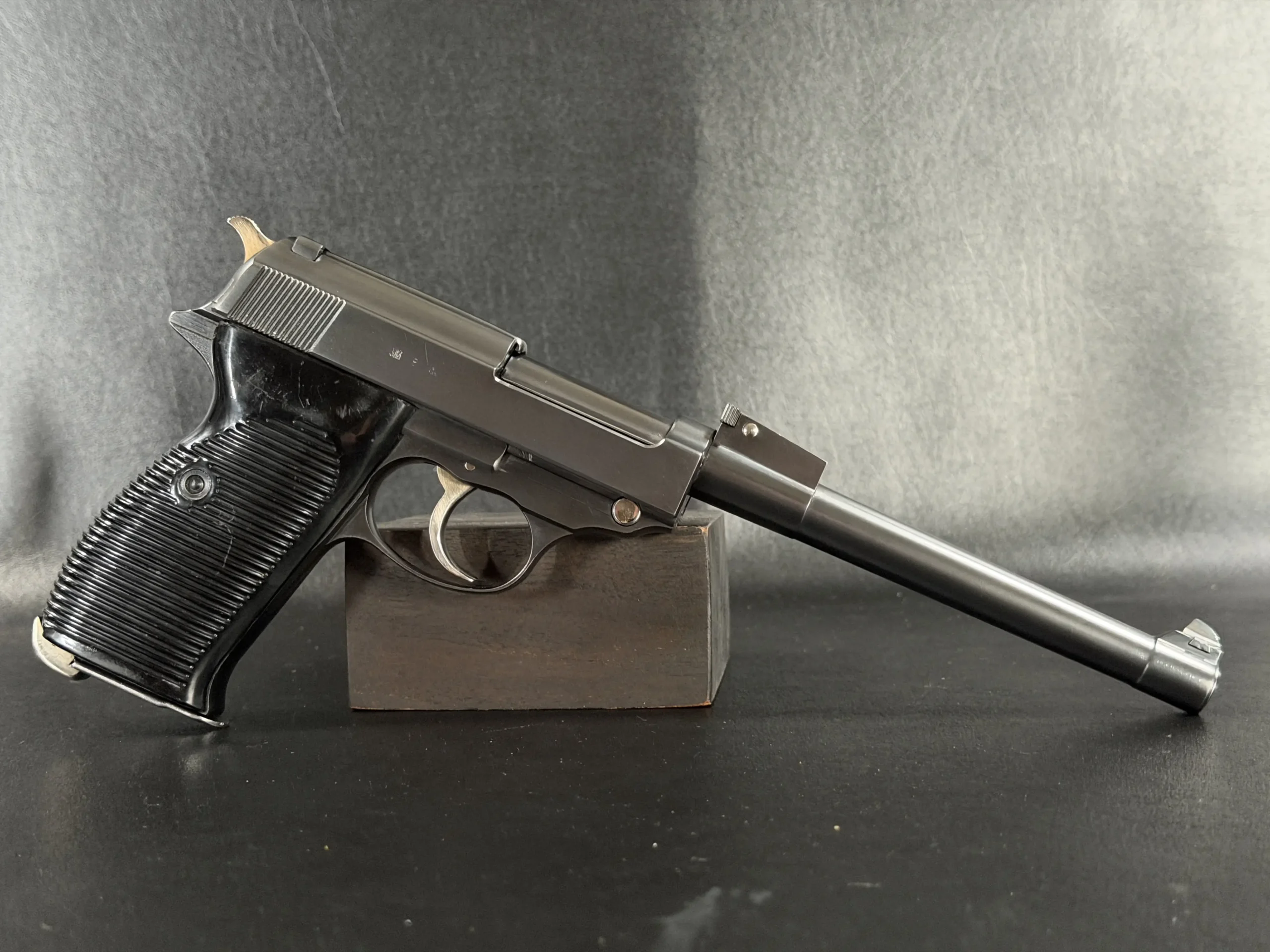 Built upon the iconic Walther P38 platform and chambered in 9mm, this pistol has been transformed through an extraordinary custom modification inspired by the long-barreled Luger Artillery configuration. The result is a pistol that blends two legendary German service handgun designs into one visually dramatic and mechanically intriguing piece.
