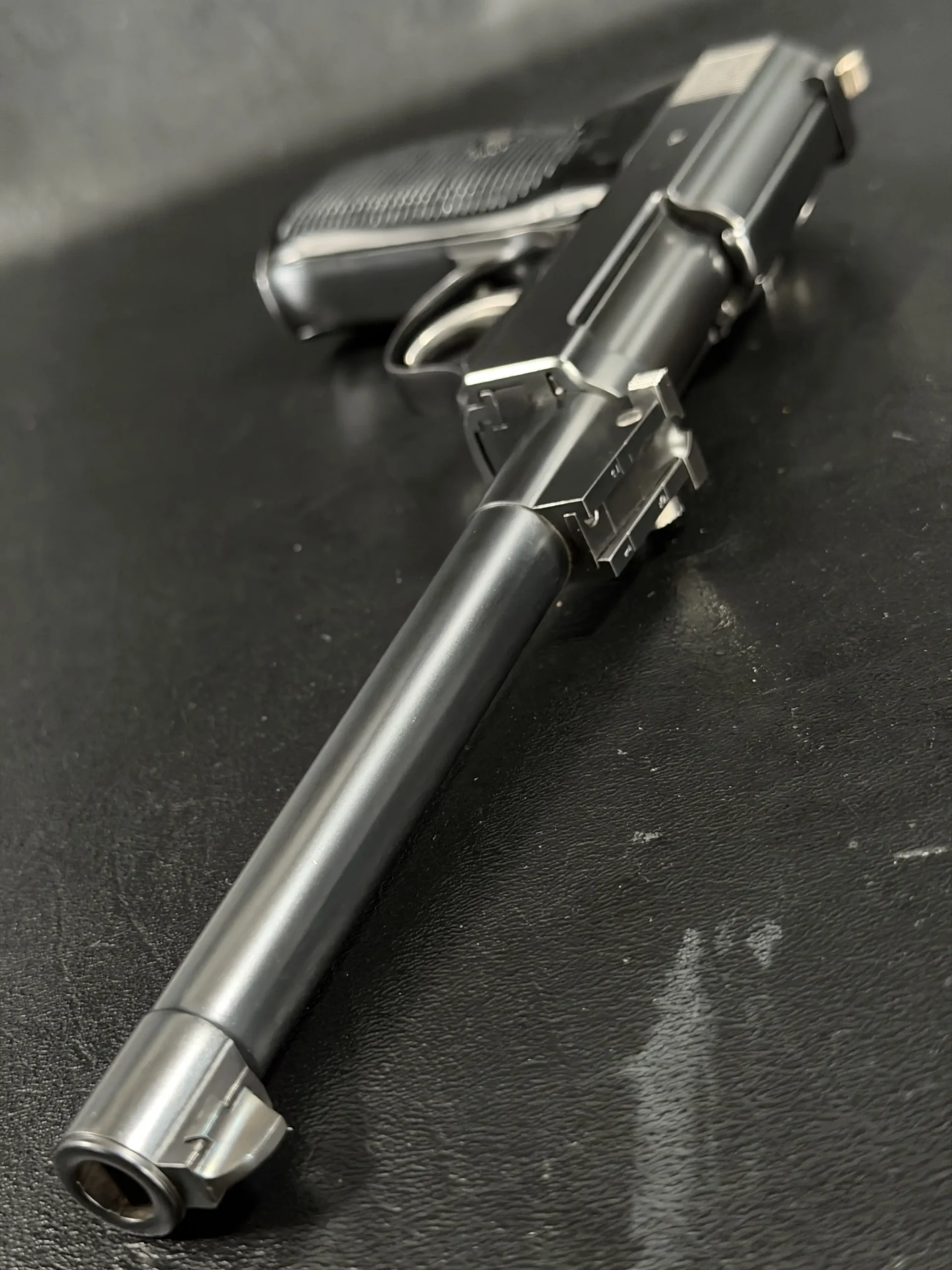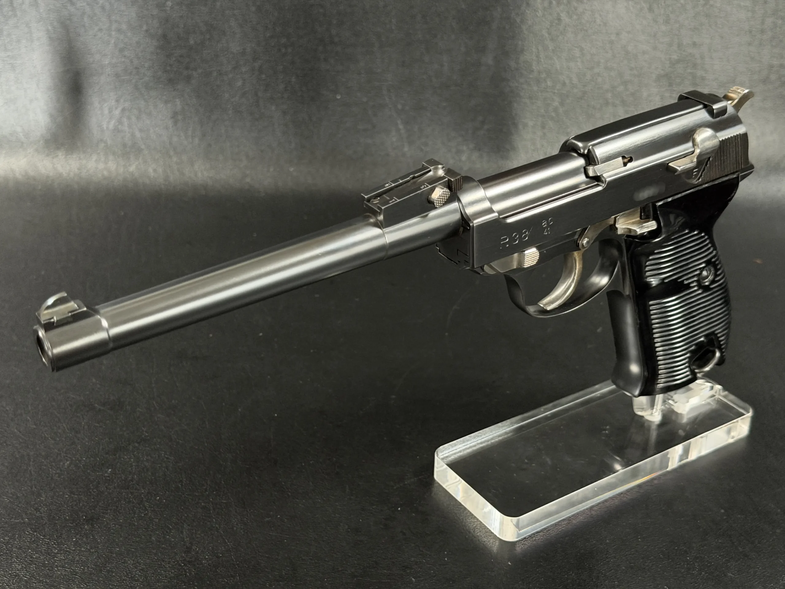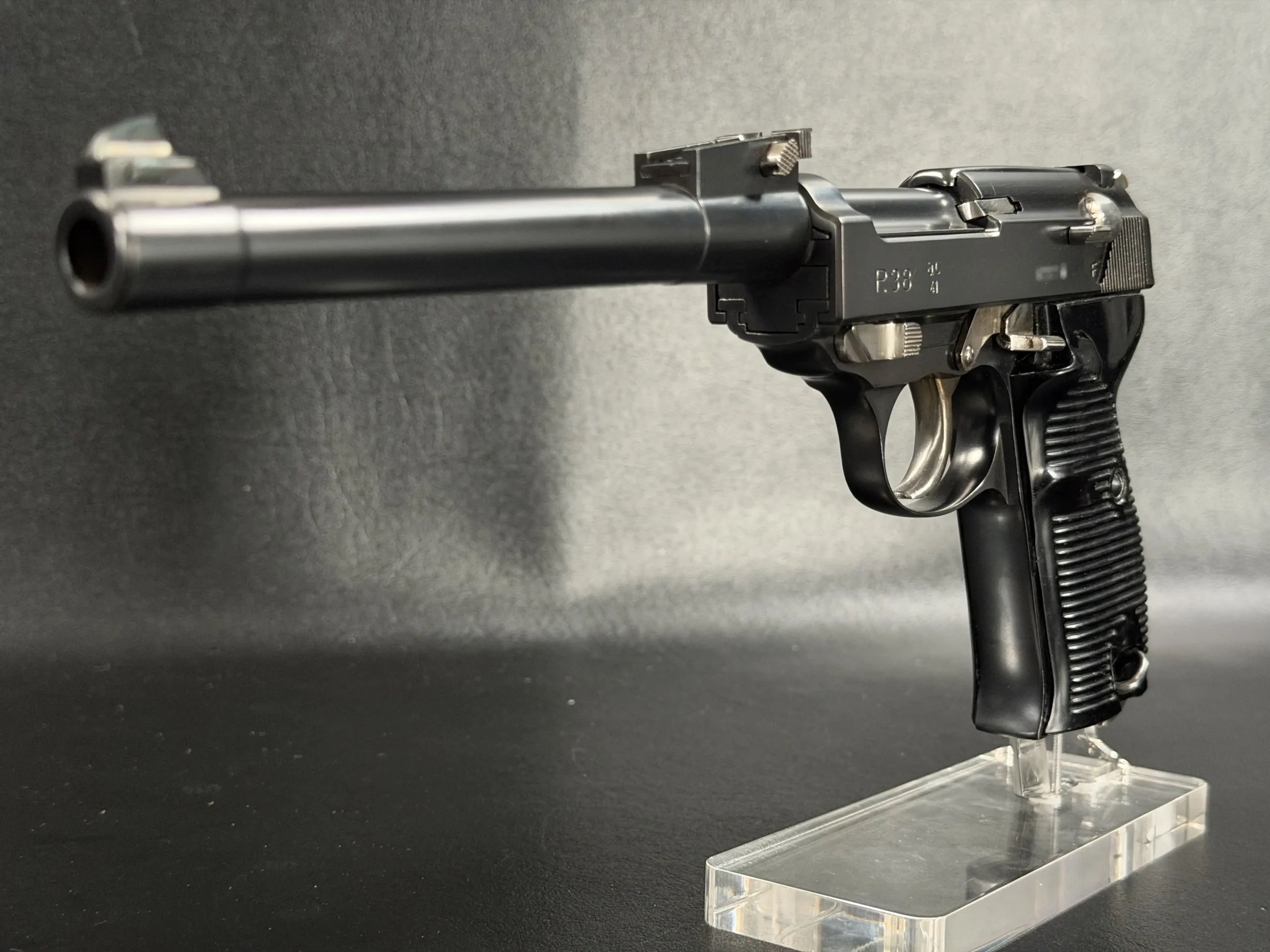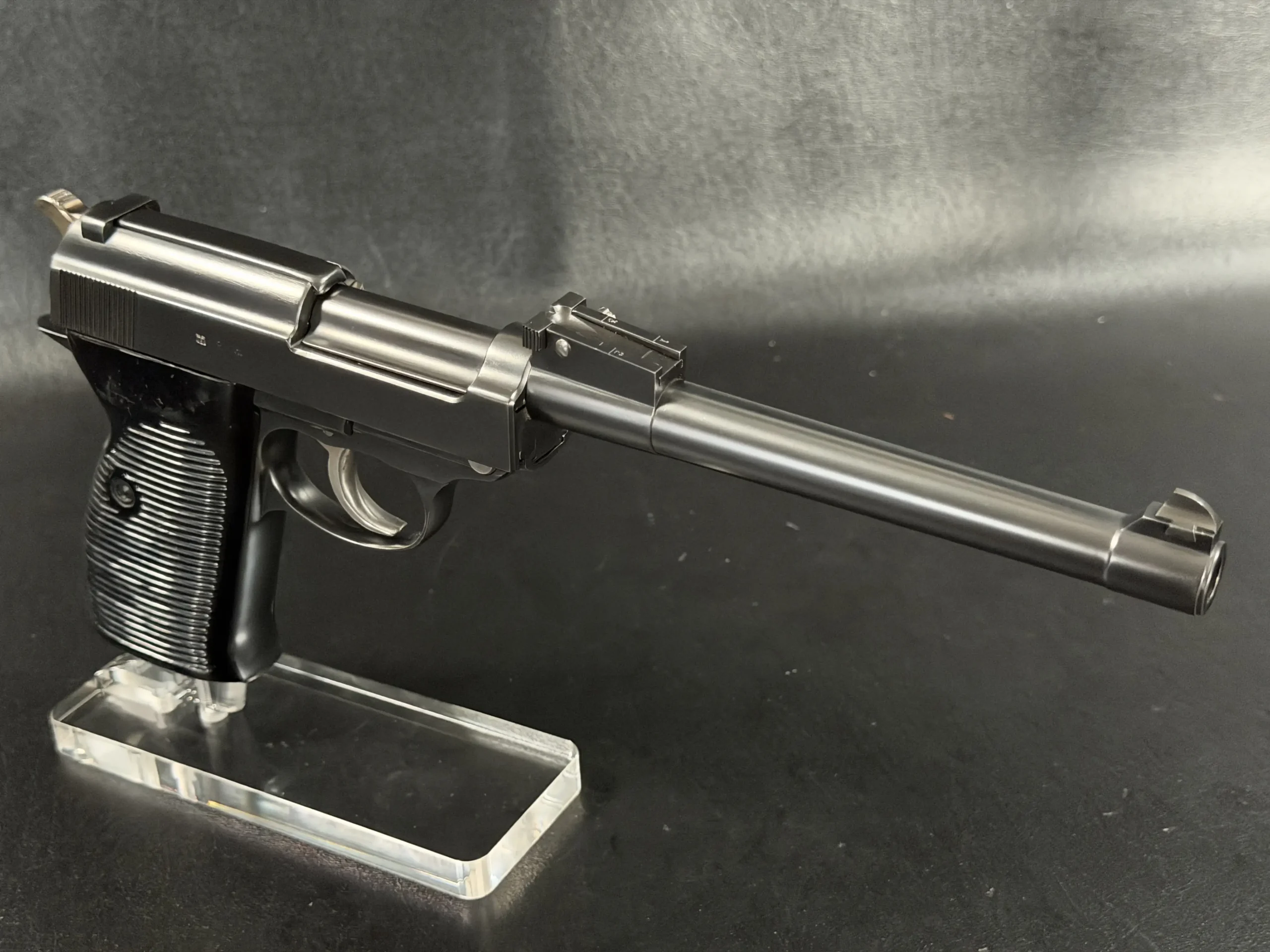 Built upon the iconic Walther P38 platform and chambered in 9mm, this pistol has been transformed through an extraordinary custom modification inspired by the long-barreled Luger Artillery configuration. The result is a pistol that blends two legendary German service handgun designs into one visually dramatic and mechanically intriguing piece.