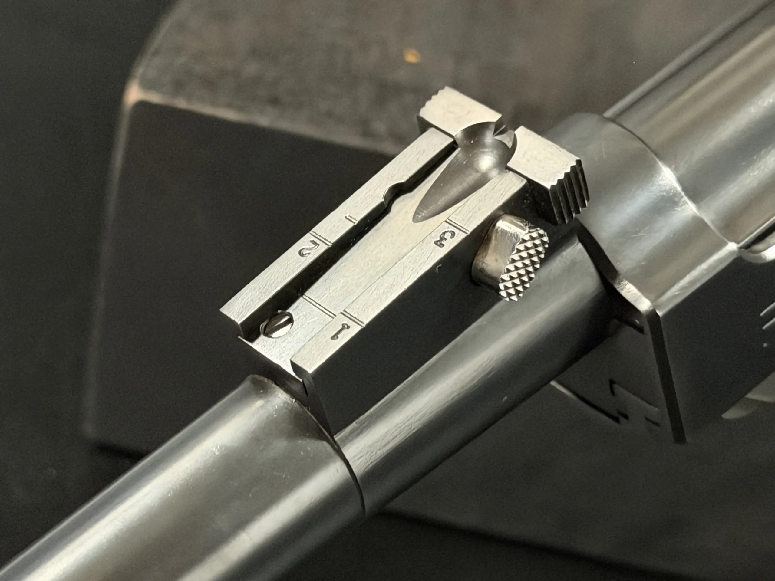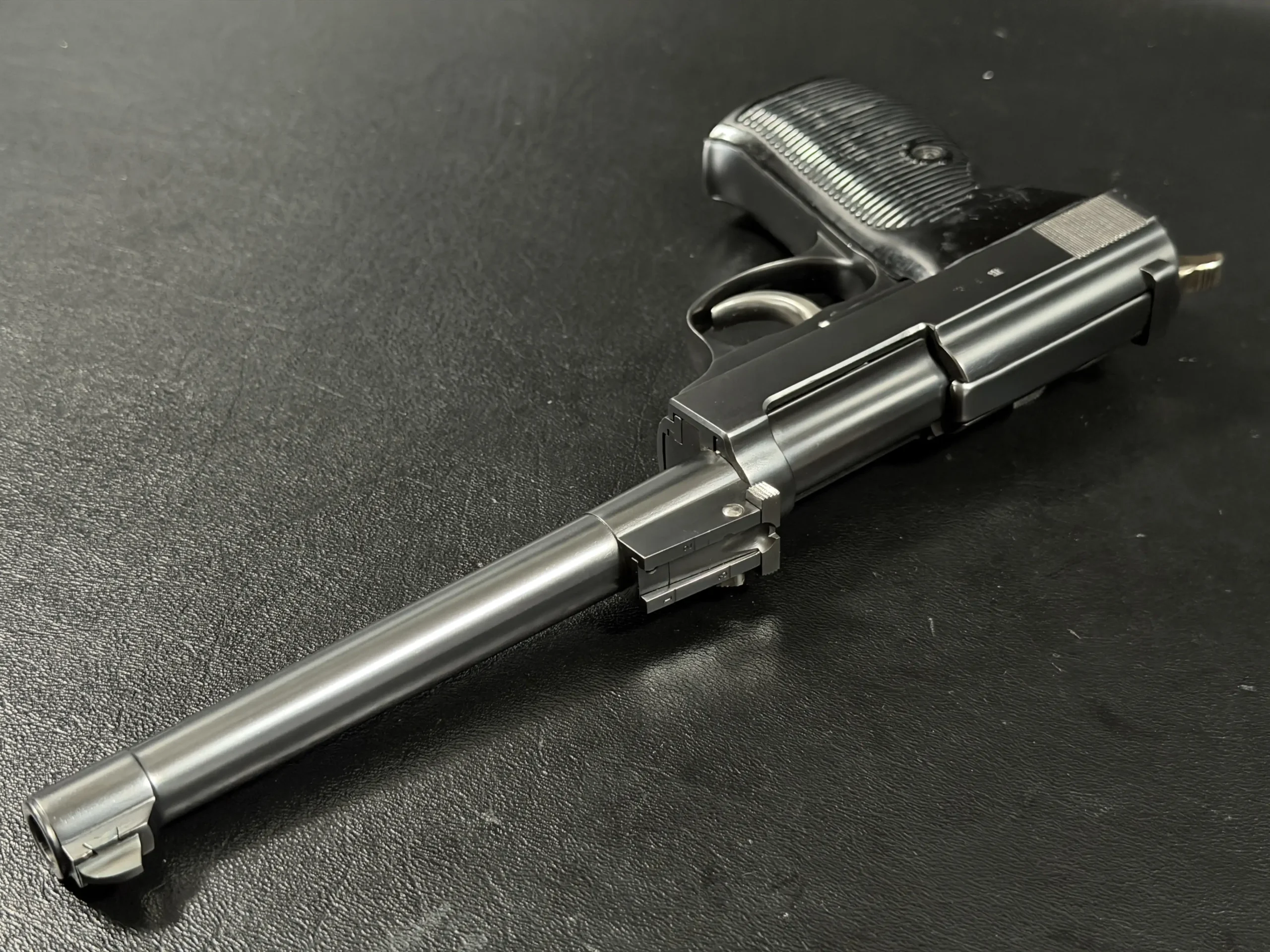 Complementing the extended barrel is a precision-adjustable rear sight assembly, mounted forward on the barrel extension. The sight features clear range markings and fine adjustment controls, providing both practical shootability and a distinctive visual character that immediately signals the pistol’s experimental nature.