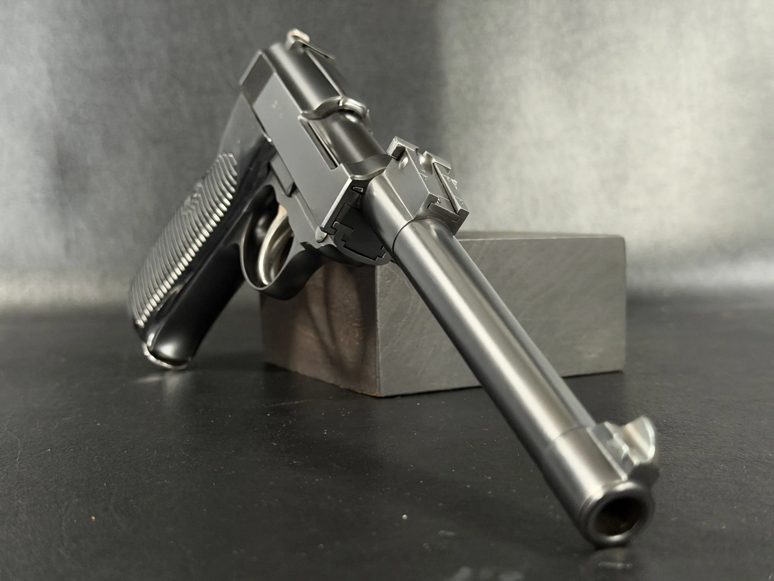 The defining feature is the extended Artillery-style barrel, which dramatically lengthens the pistol’s profile and gives it a silhouette reminiscent of the famous LP08 Luger. The barrel integrates seamlessly with the P38 frame through a custom-machined mounting assembly, demonstrating the meticulous metalwork associated with Martz’s craftsmanship.