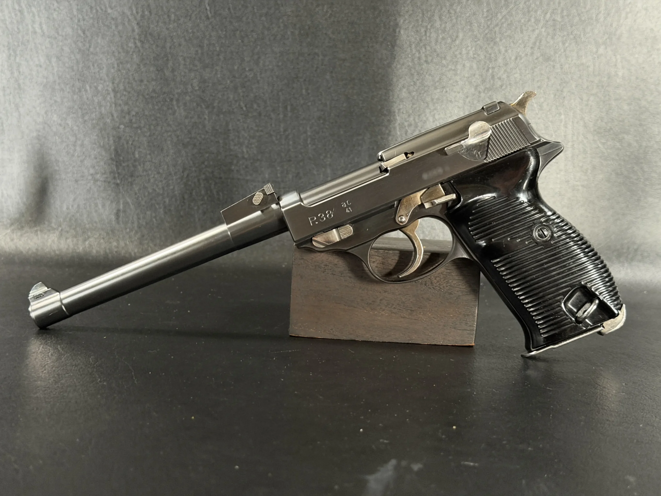 From a collector’s perspective, this piece represents far more than a simple modification. It is a conversation piece, an example of the experimental spirit that occasionally emerges when skilled gunsmiths reinterpret historic firearms. By combining the engineering lineage of the P38 with the visual inspiration of the Artillery Luger, Martz created a pistol that bridges two of the most recognizable military handgun designs of the twentieth century.
