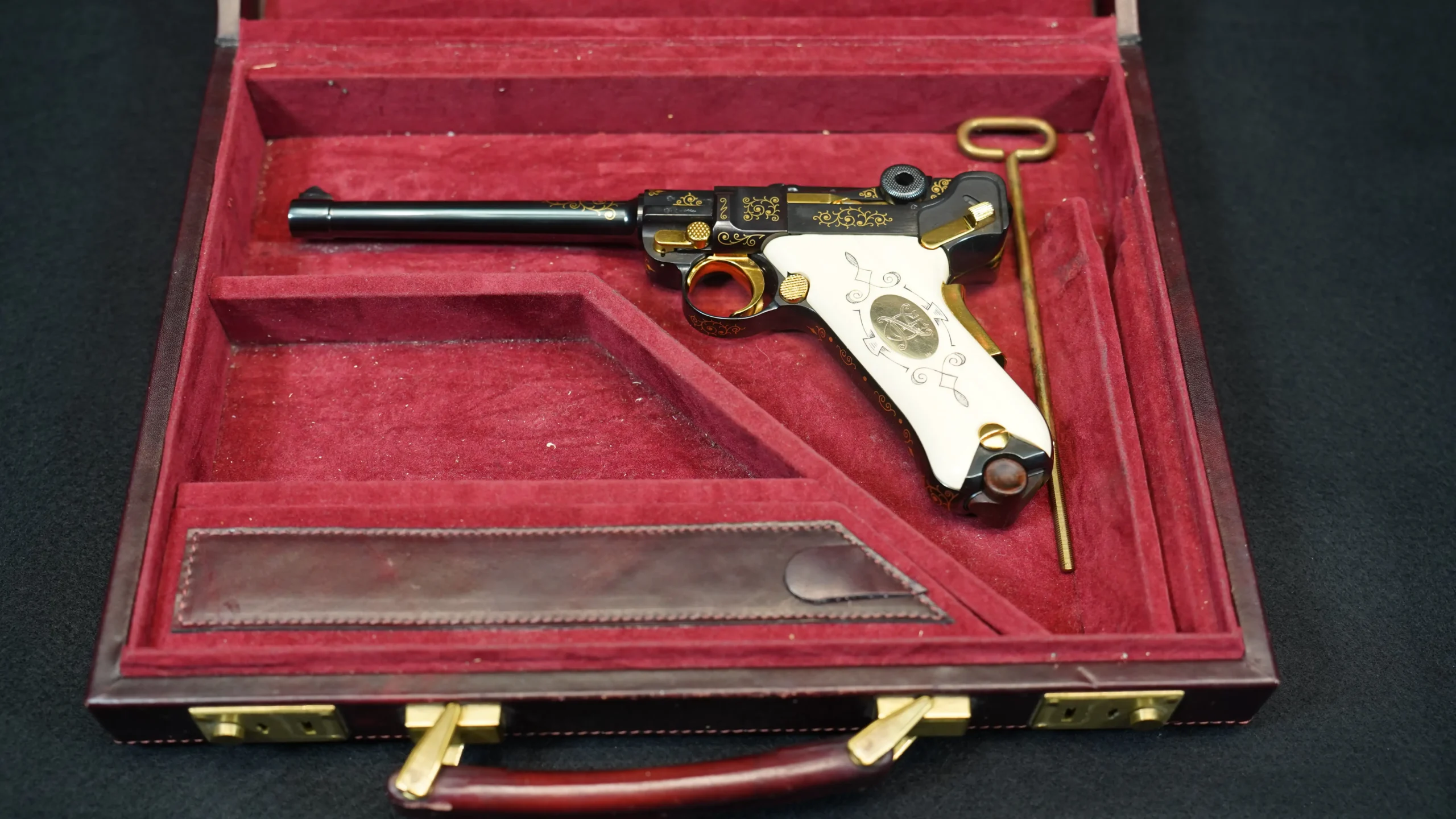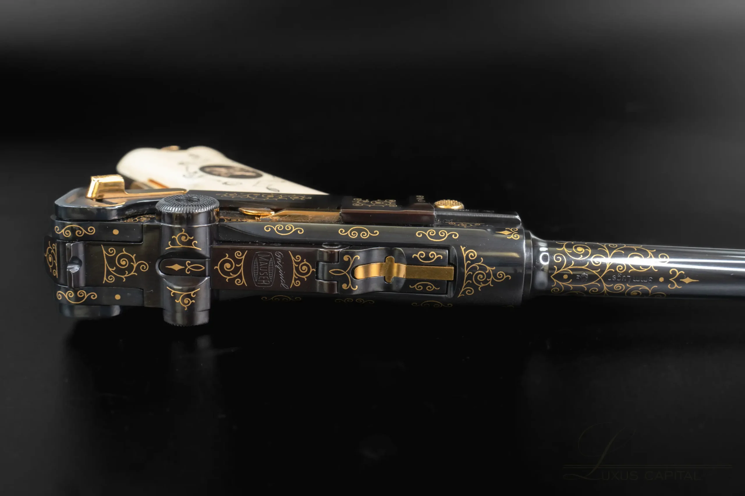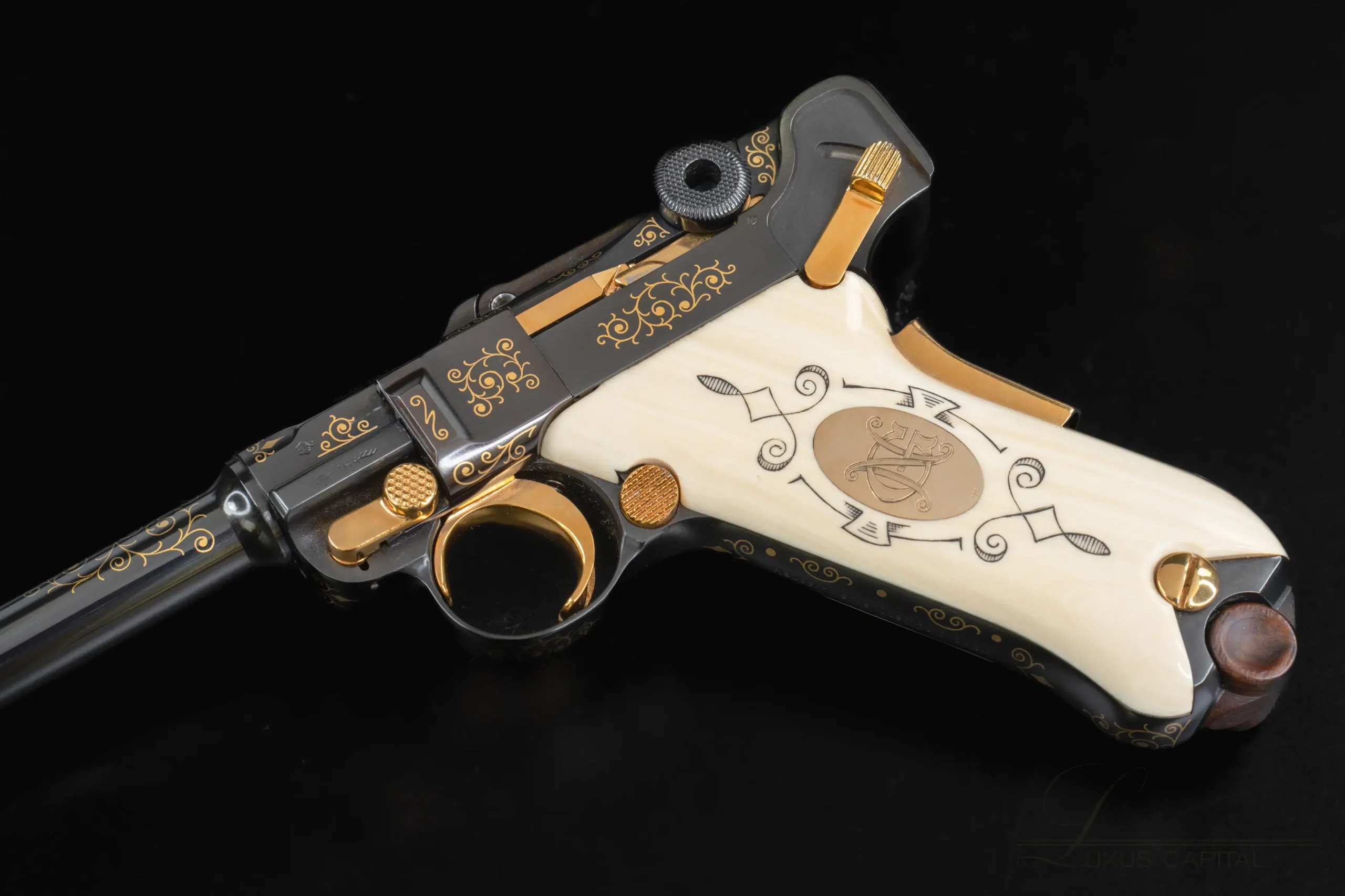 One of the most visually arresting elements is the grip treatment. The pistol is fitted with ivory-tone grips, finely polished and adorned with delicate scrollwork and a central medallion motif. The design feels almost heraldic, evoking the European exhibition arms of the early 20th century, while remaining faithful to the Luger’s architectural geometry. The warm tone of the grips pairs beautifully with the gold embellishments, giving the pistol a museum-level presence in hand.