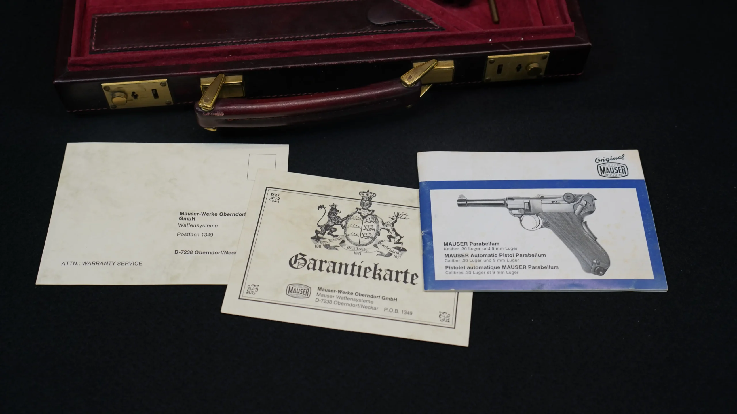Accompanying the pistol is its exhibition case, finished in a rich red lining that contrasts dramatically with the pistol’s dark metal and gold accents. Period documentation and Mauser literature are included, reinforcing the commemorative nature of the piece and its connection to the IWA OutdoorClassics event for which it was created.