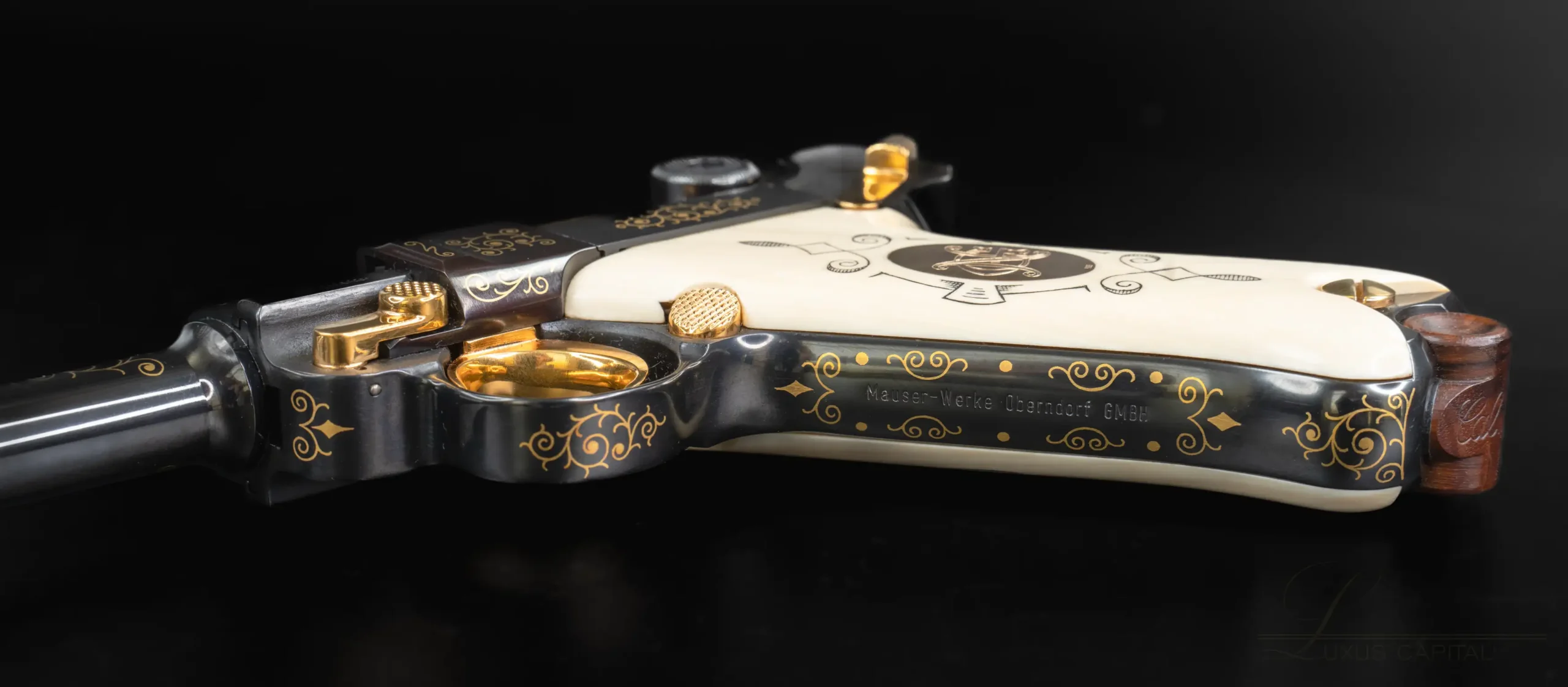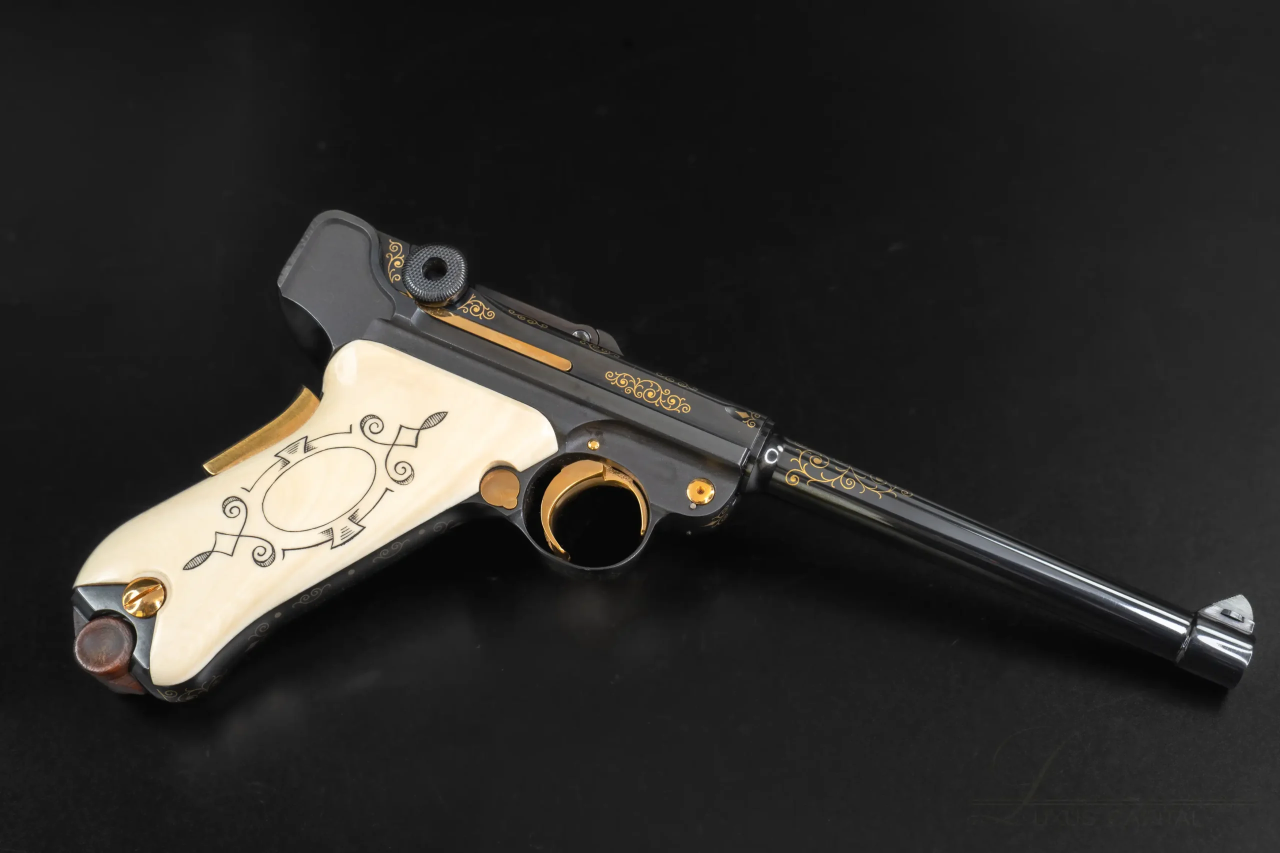 As a tribute firearm, this Mauser IWA Luger Parabellum occupies a unique space between historical homage and modern exhibition artistry. It captures the spirit of the original Parabellum while elevating it into the realm of collectible presentation arms, pieces intended as much for display and appreciation as for mechanical admiration.