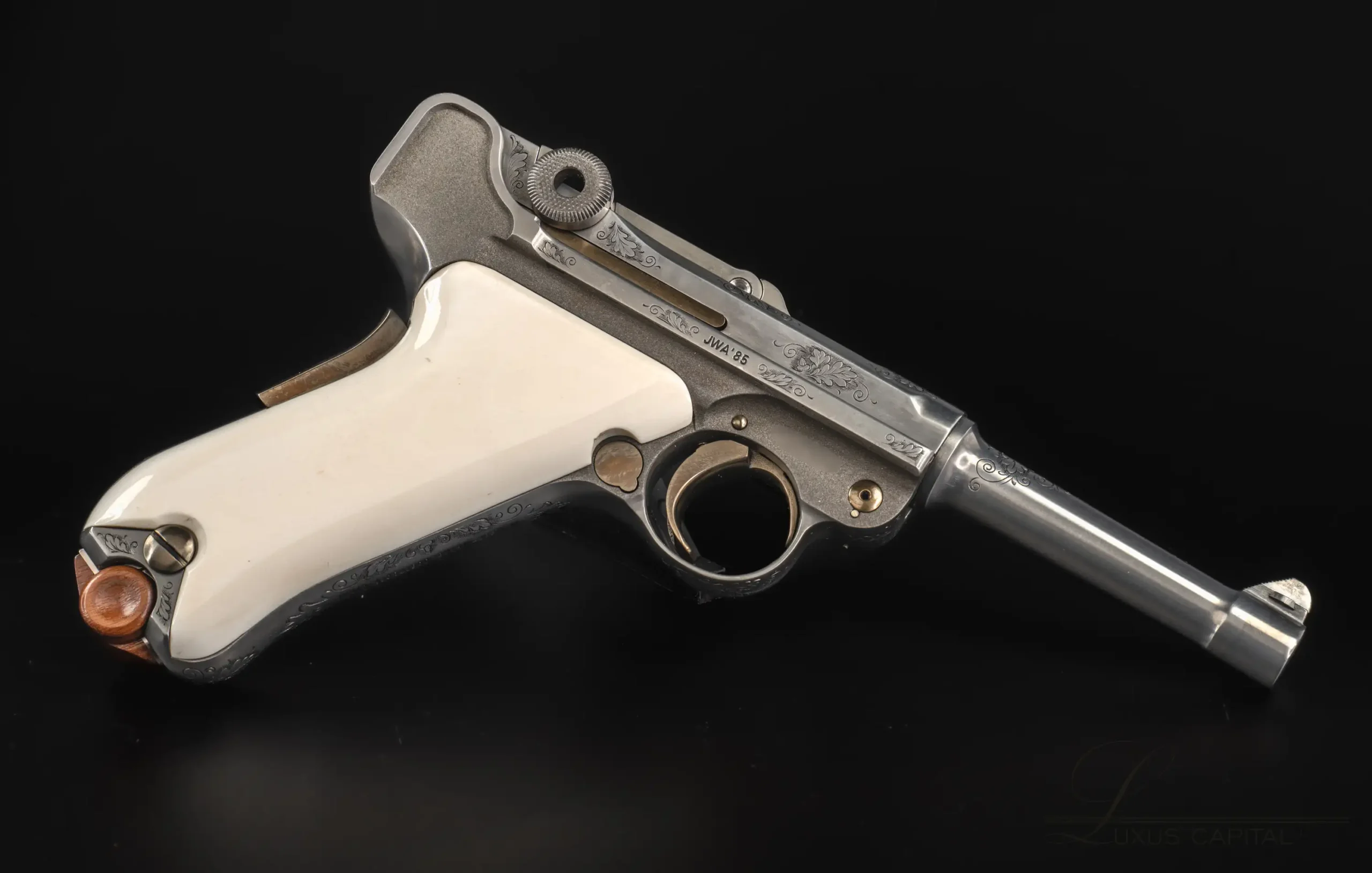 Created as a commemorative tribute to the world-renowned IWA OutdoorClassics exhibition in Germany, the Mauser P08 IWA ’85 Luger stands as a celebration of both heritage and craftsmanship, a fusion of historic mechanical design and late-20th-century German embellishment.
